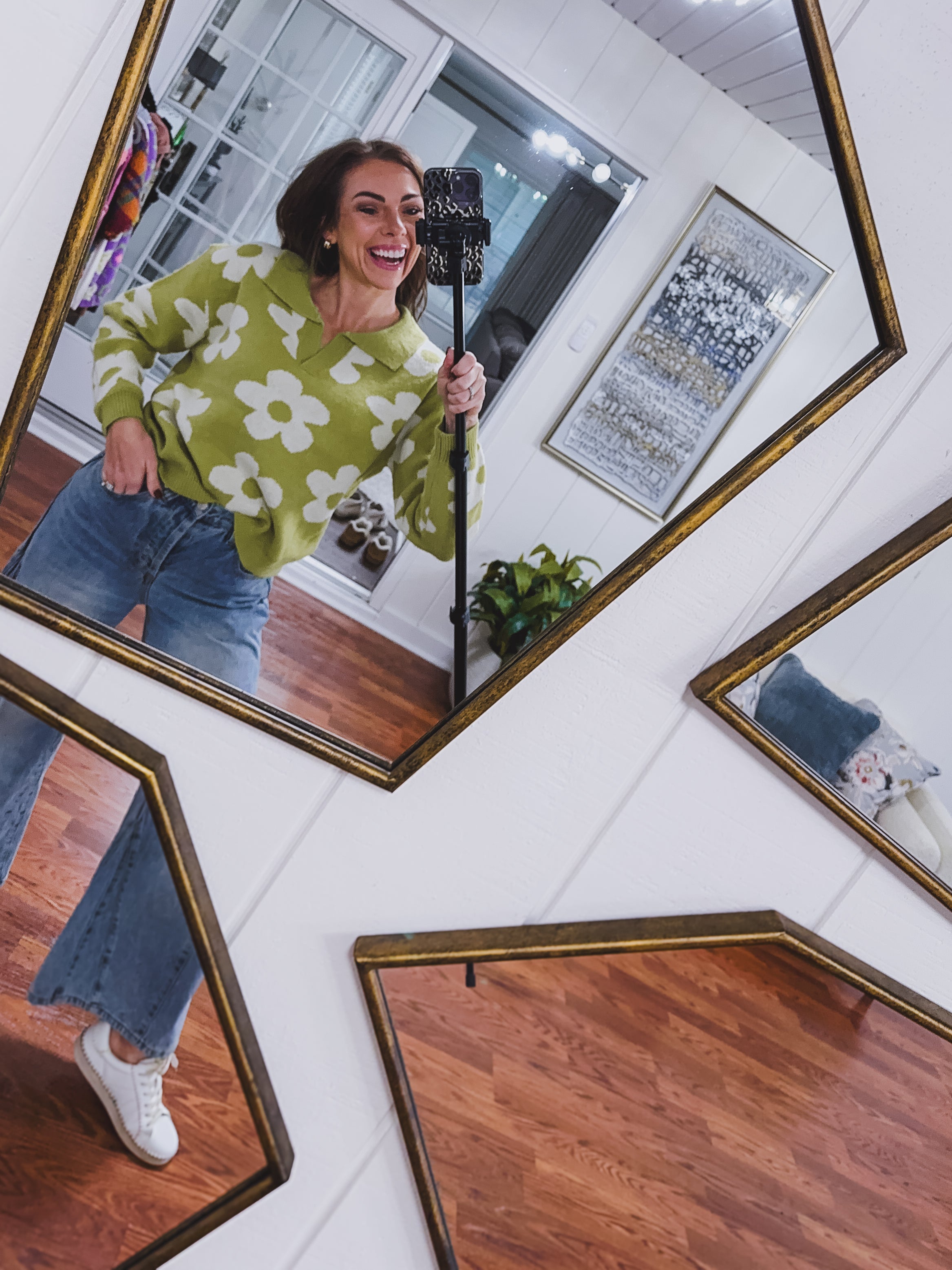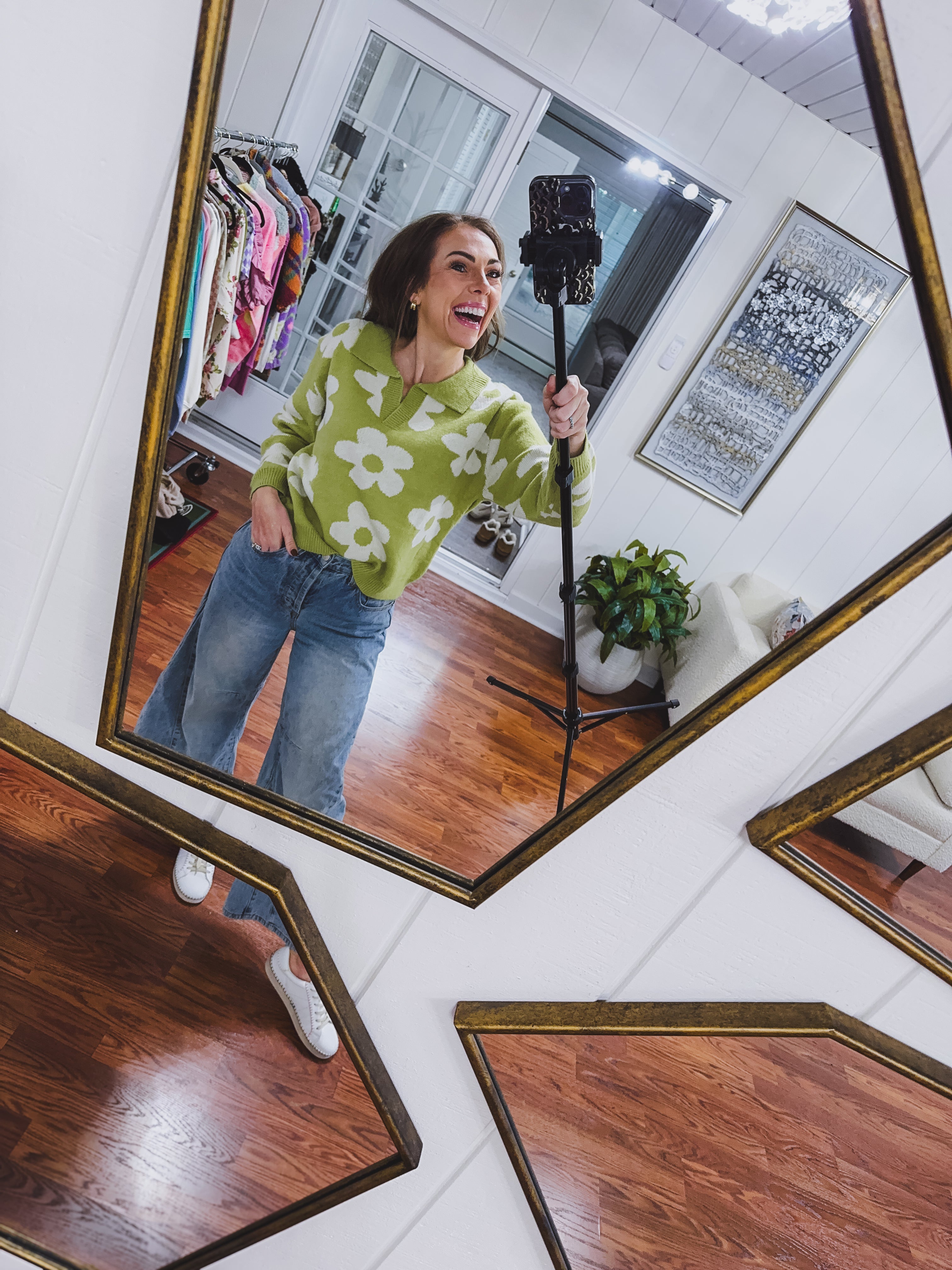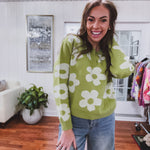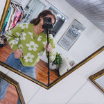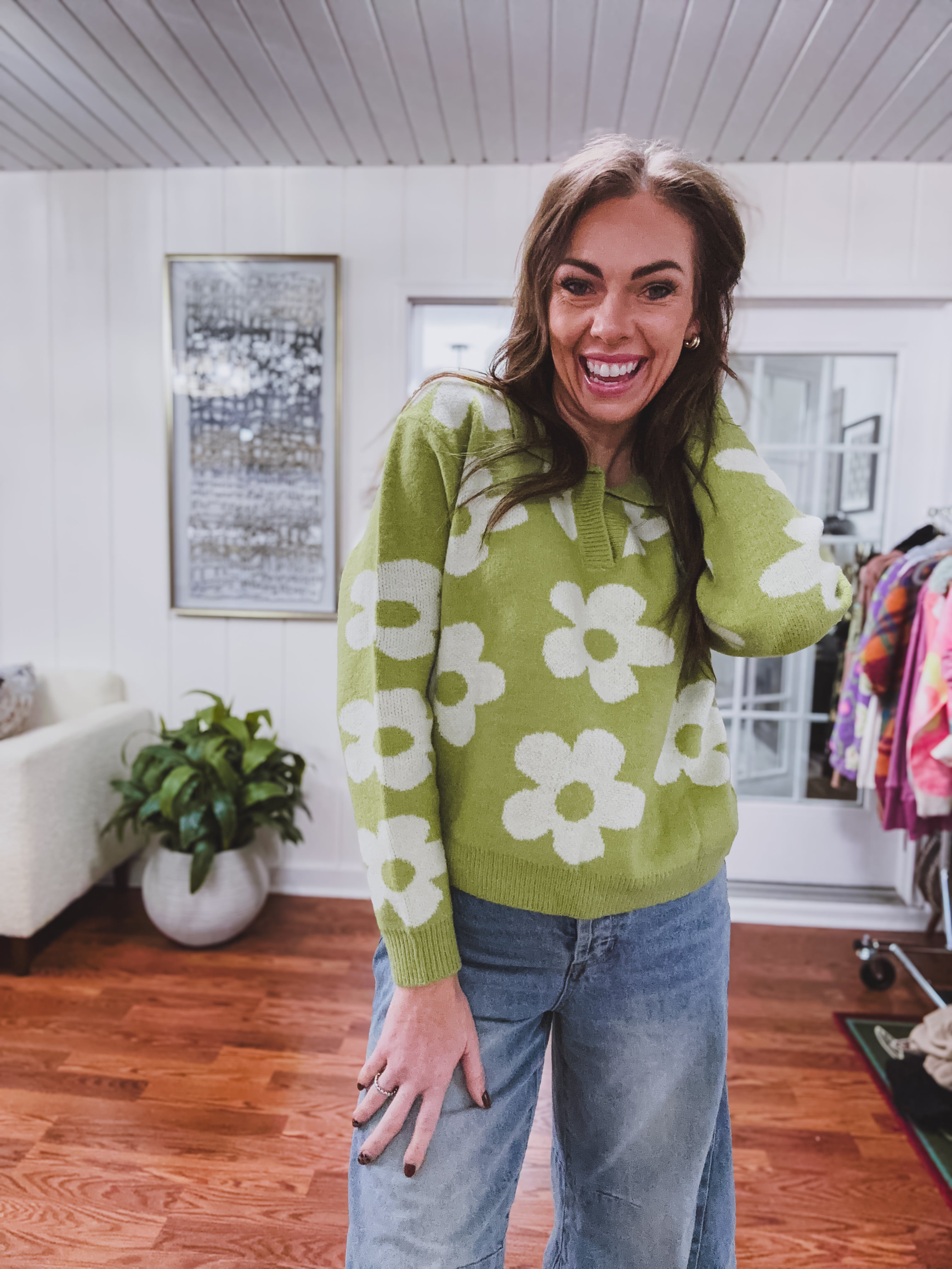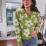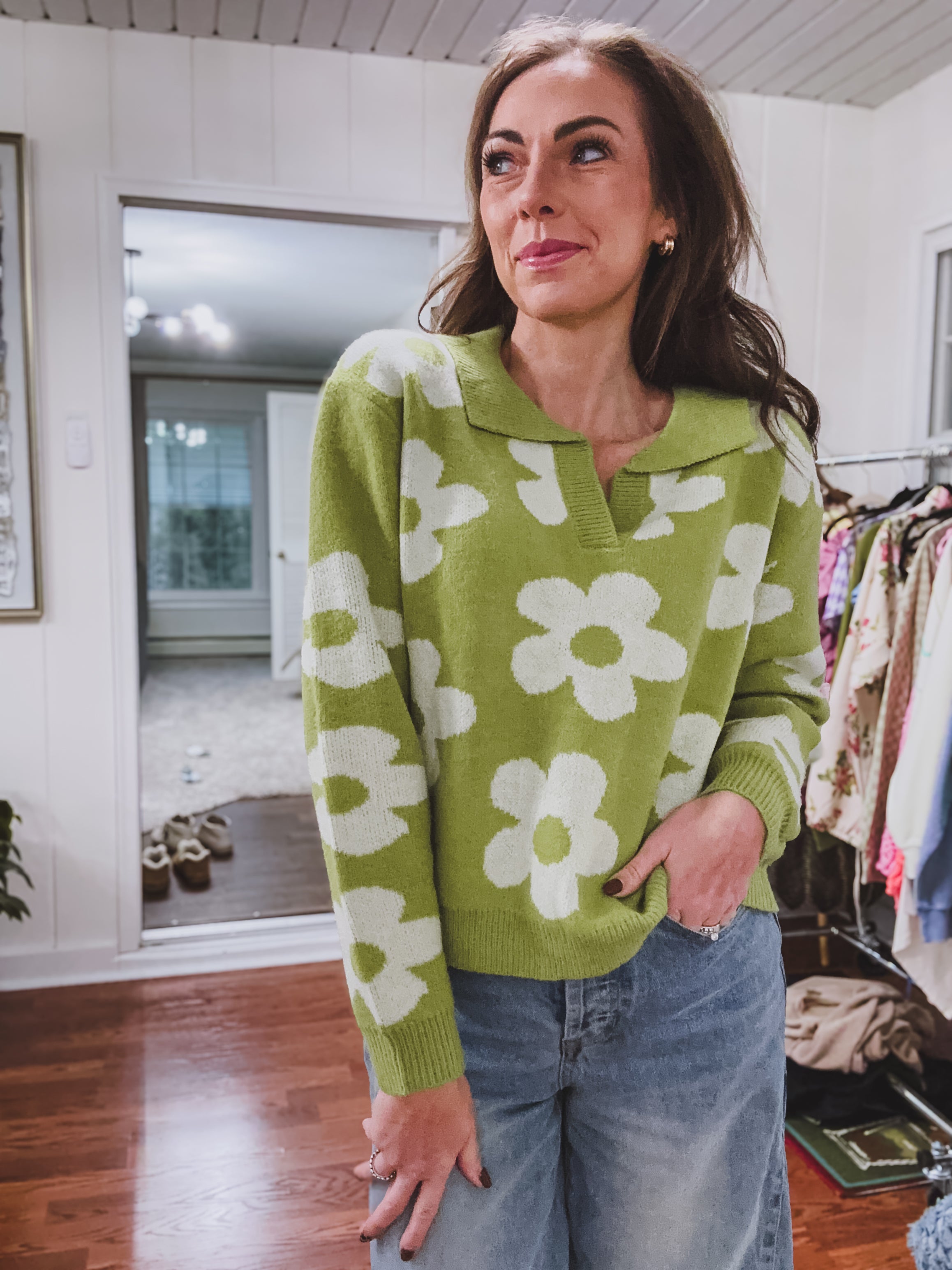 Embrace effortless style with this charming apple green sweater, adorned with bold ivory daisies that bring a cheerful pop to your wardrobe. The timeless V-neckline, crisp collar, and classic waistband create a flattering silhouette that transitions seamlessly from office meetings to casual hangouts. Pair it with your favorite denim or dress pants for a look that's equal parts polished and fun—whether you're conquering the workweek or catching up with friends.