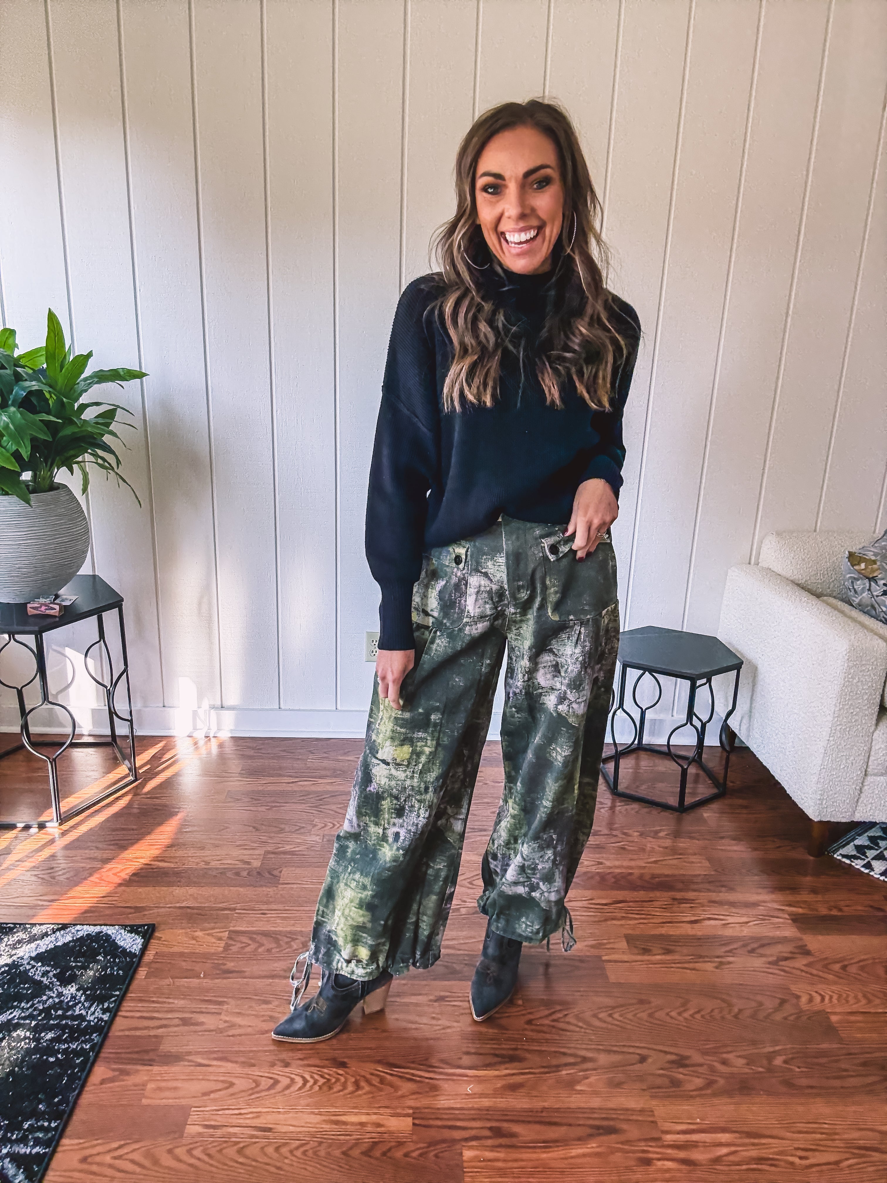 Rock a look that turns heads with these statement pants featuring a striking dark olive and plum mottled print. The denim-style construction includes a snap-and-zip closure, elastic back waist, and functional front pockets for everyday ease. But here's where they shine—the dramatic balloon bottom silhouette is pure fashion magic. Perfect for layering over sweaters, tees, and cardigans, these pants are your new fall and winter wardrobe essential that proves comfort and style can absolutely coexist.