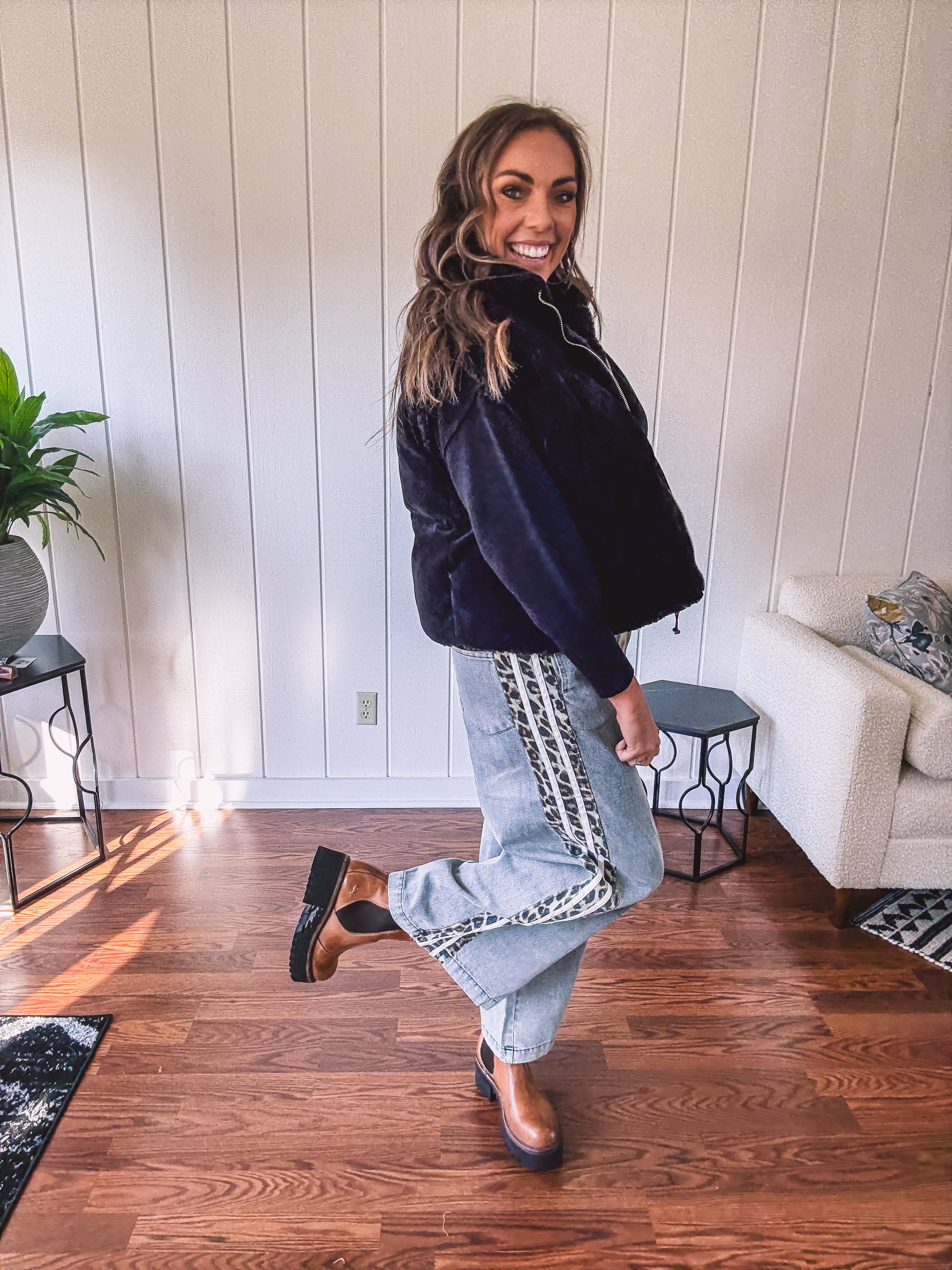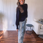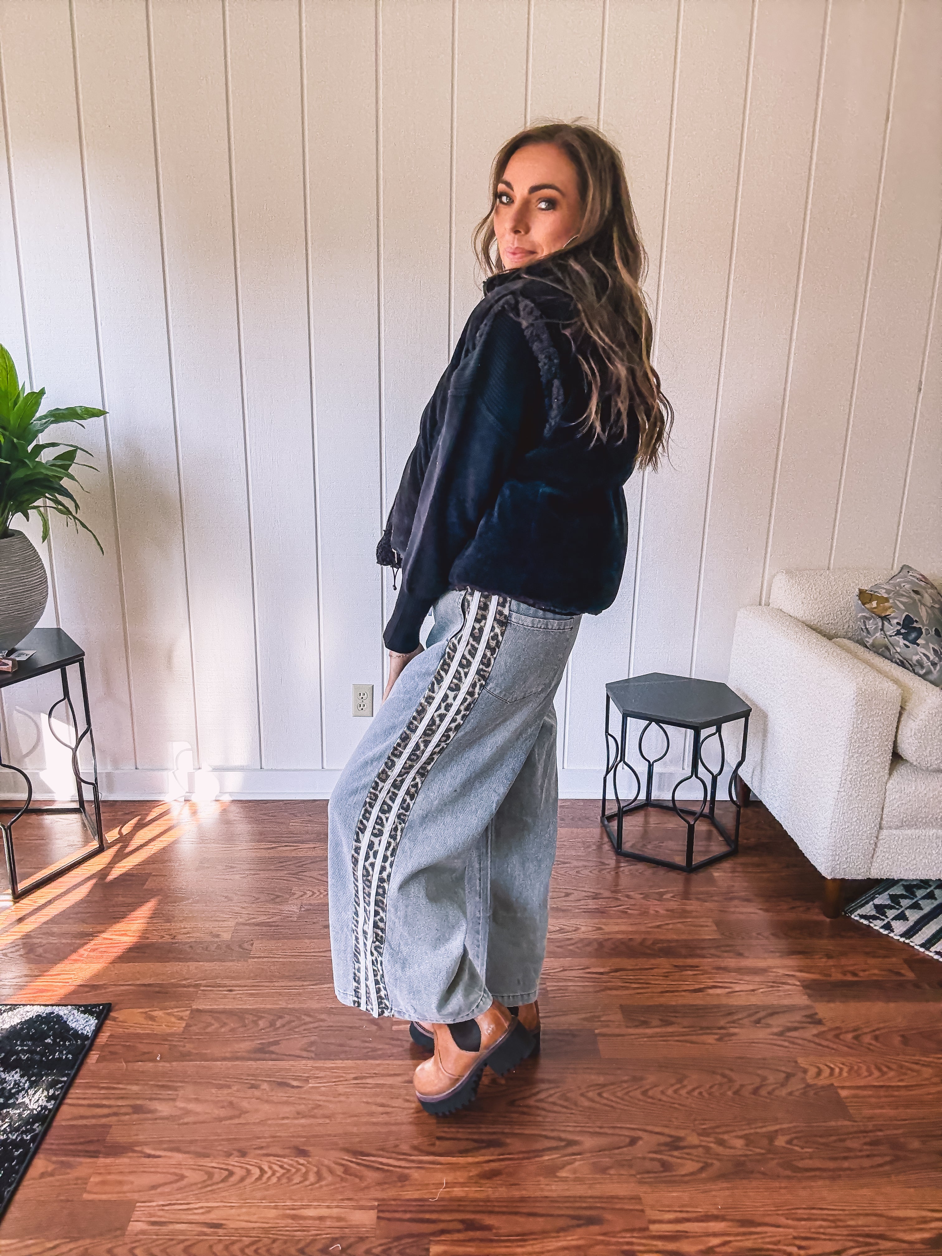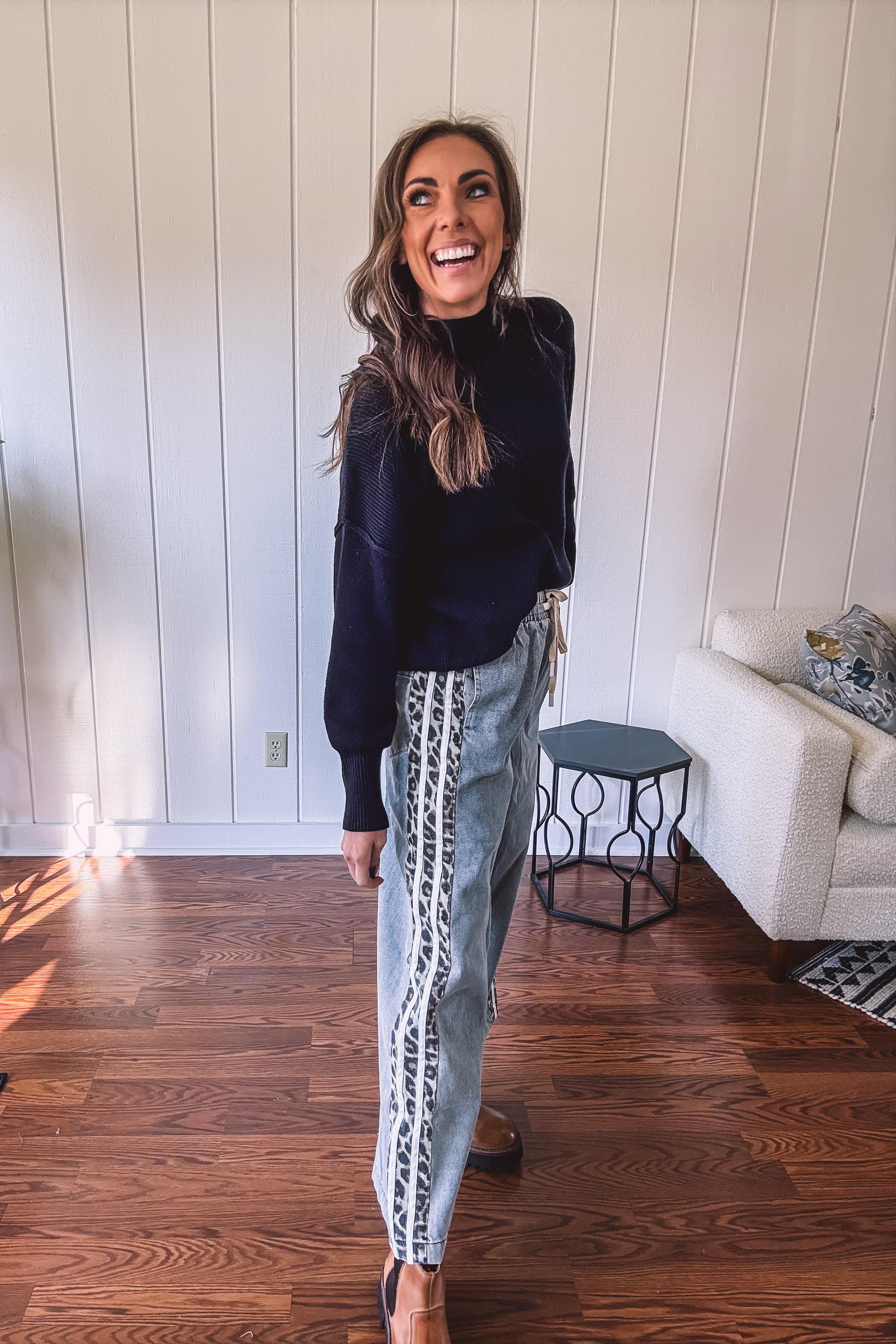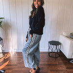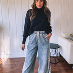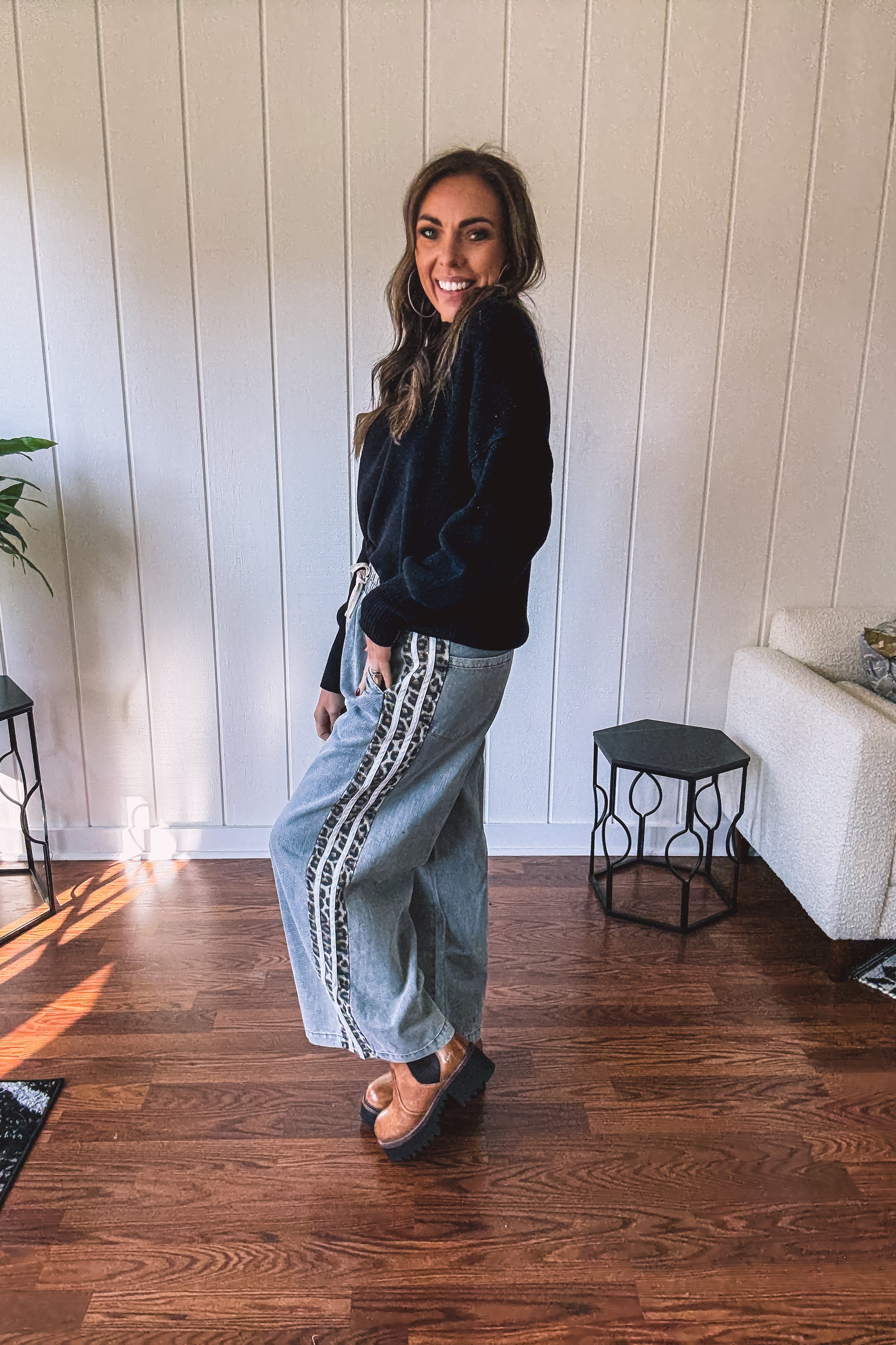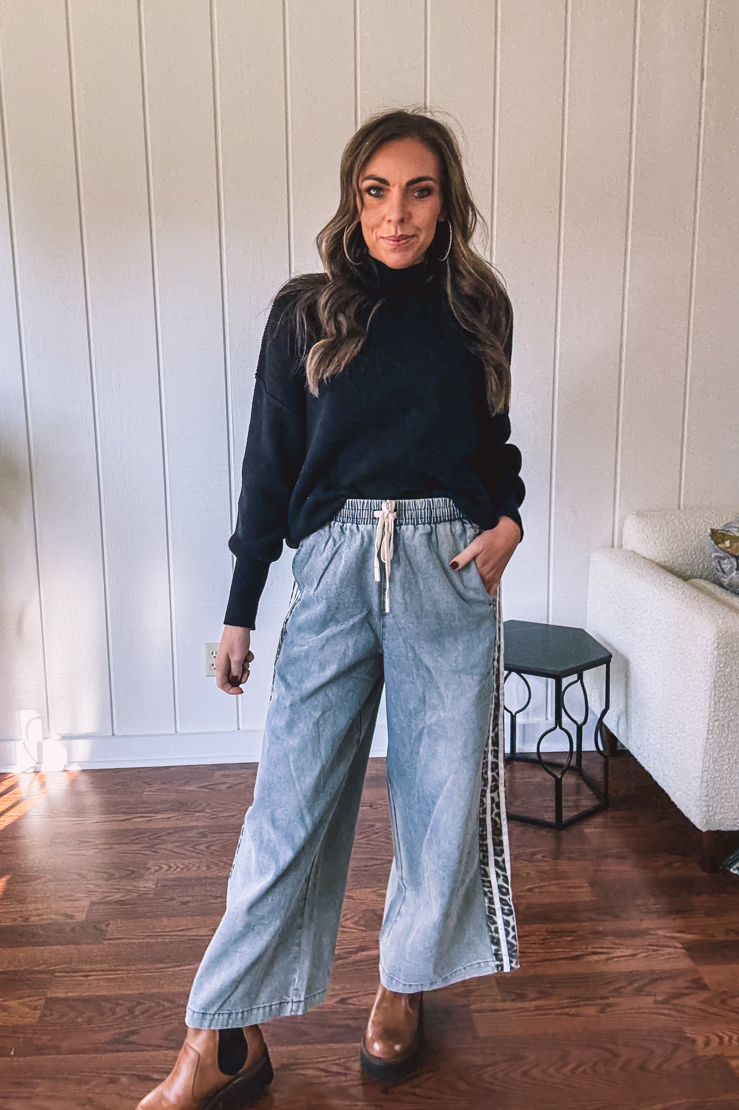Calling all leopard print devotees! These true denim, wide-leg denim pants are your new wardrobe essential, complete with a drawstring and elastic waist for comfort that actually works. Side pockets keep your essentials close, while bold leopard and white stripes running down each leg deliver serious style points. Layer them with your favorite sweaters, tees, jackets, or cardigans—this versatile piece plays well with basically everything in your closet.