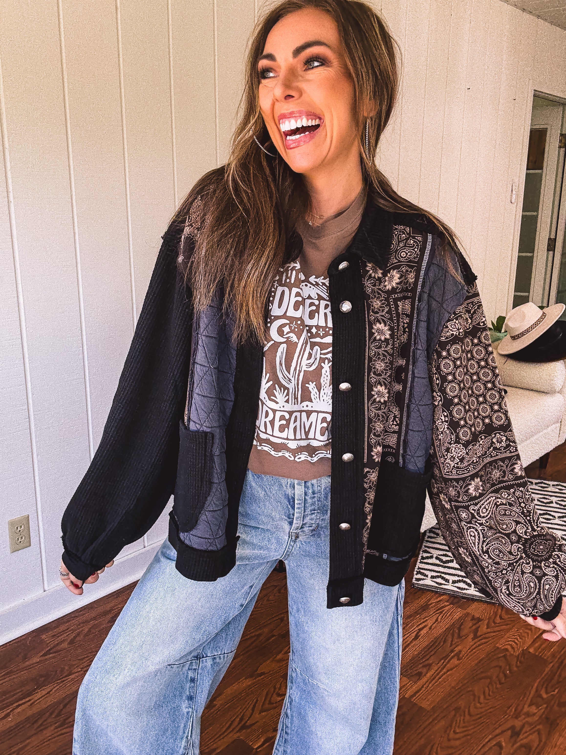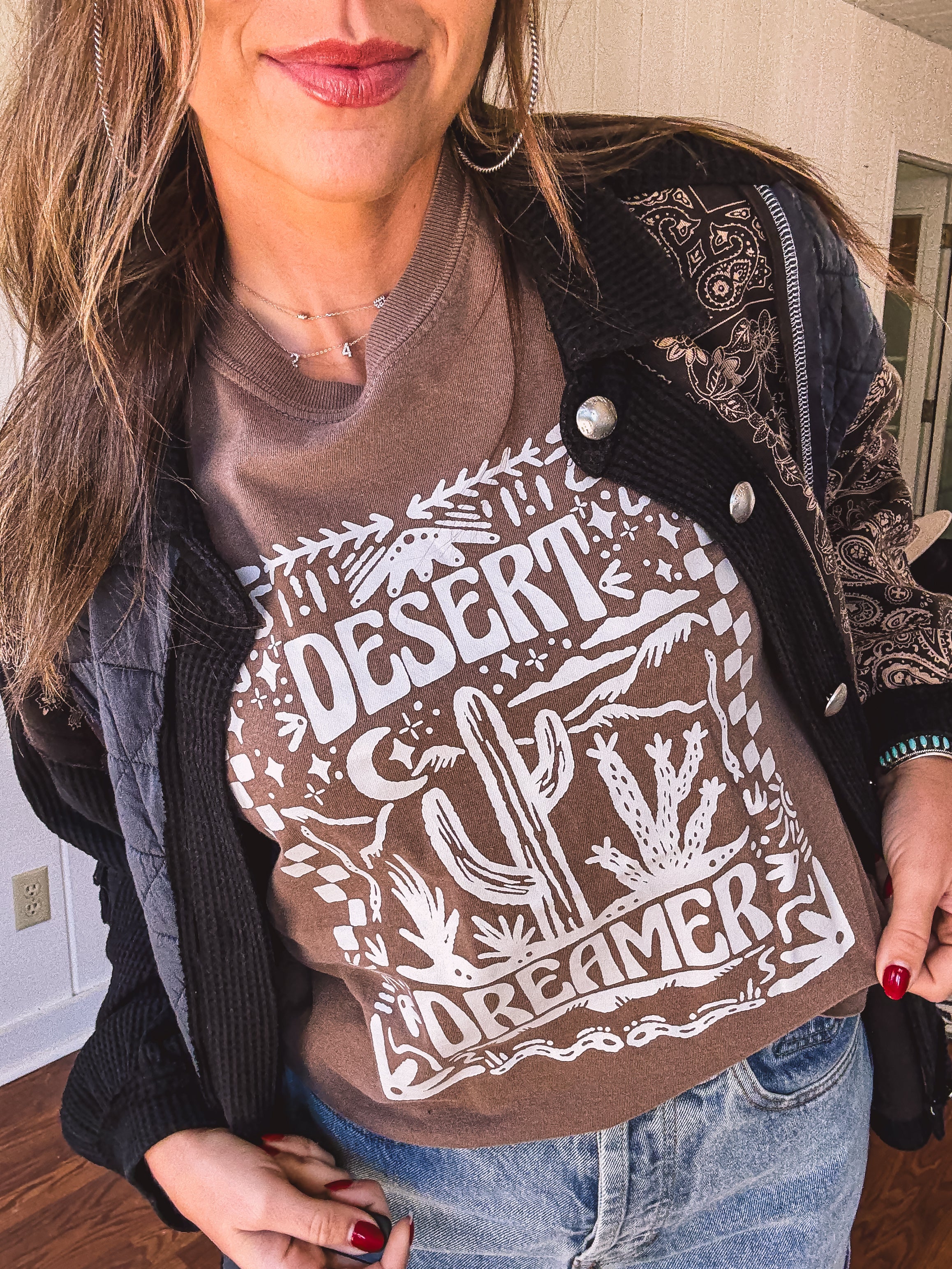 Made from ultra-soft cotton, the Desert Dreamer Graphic Tee shines in a cozy mocha shade with striking white western designs. Perfect for layering—pair it with a long-sleeve mesh top, your go-to denim jacket or shacket, or rock it solo for a stylishly dreamy vibe.