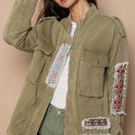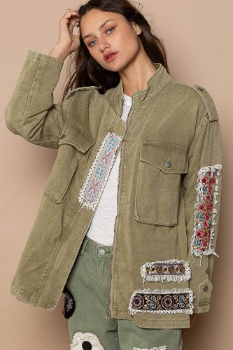 Inspired by the bold, rugged nature of military fashion, our Dusky Olive Zippered Military Jacket is the perfect addition to your wardrobe. With its functional pockets and metal buttons, this stylish jacket is both practical and on-trend. Adorned with unique lace and embroidered appliques on the front, back, and sleeves, it adds a pop of color and personality to any outfit. Don't miss out on this must-have piece for all seasons.