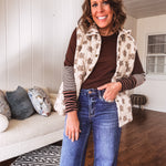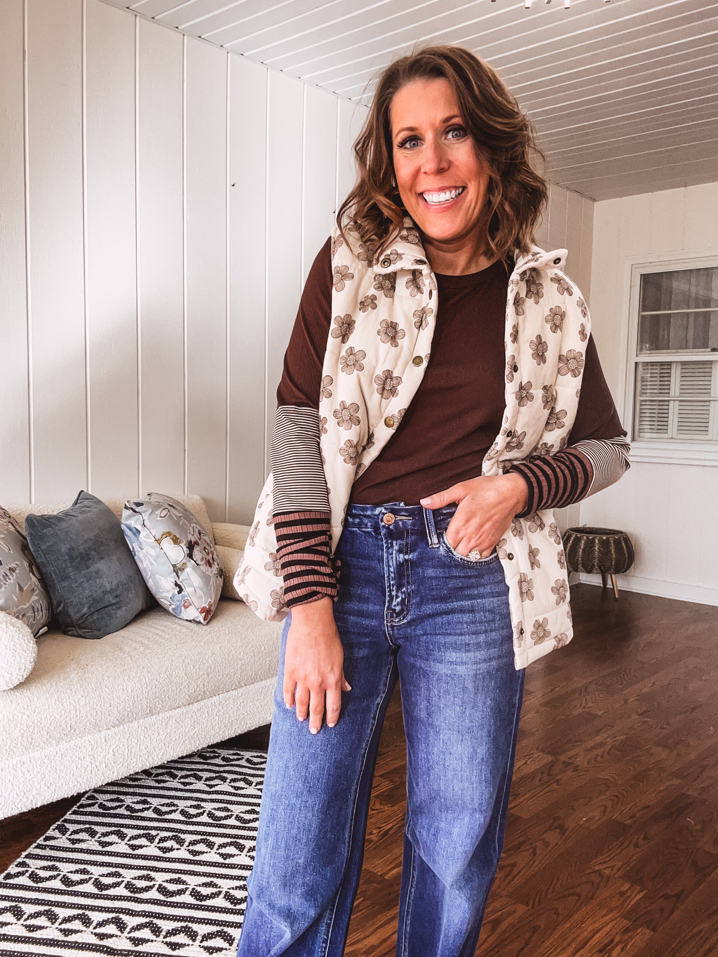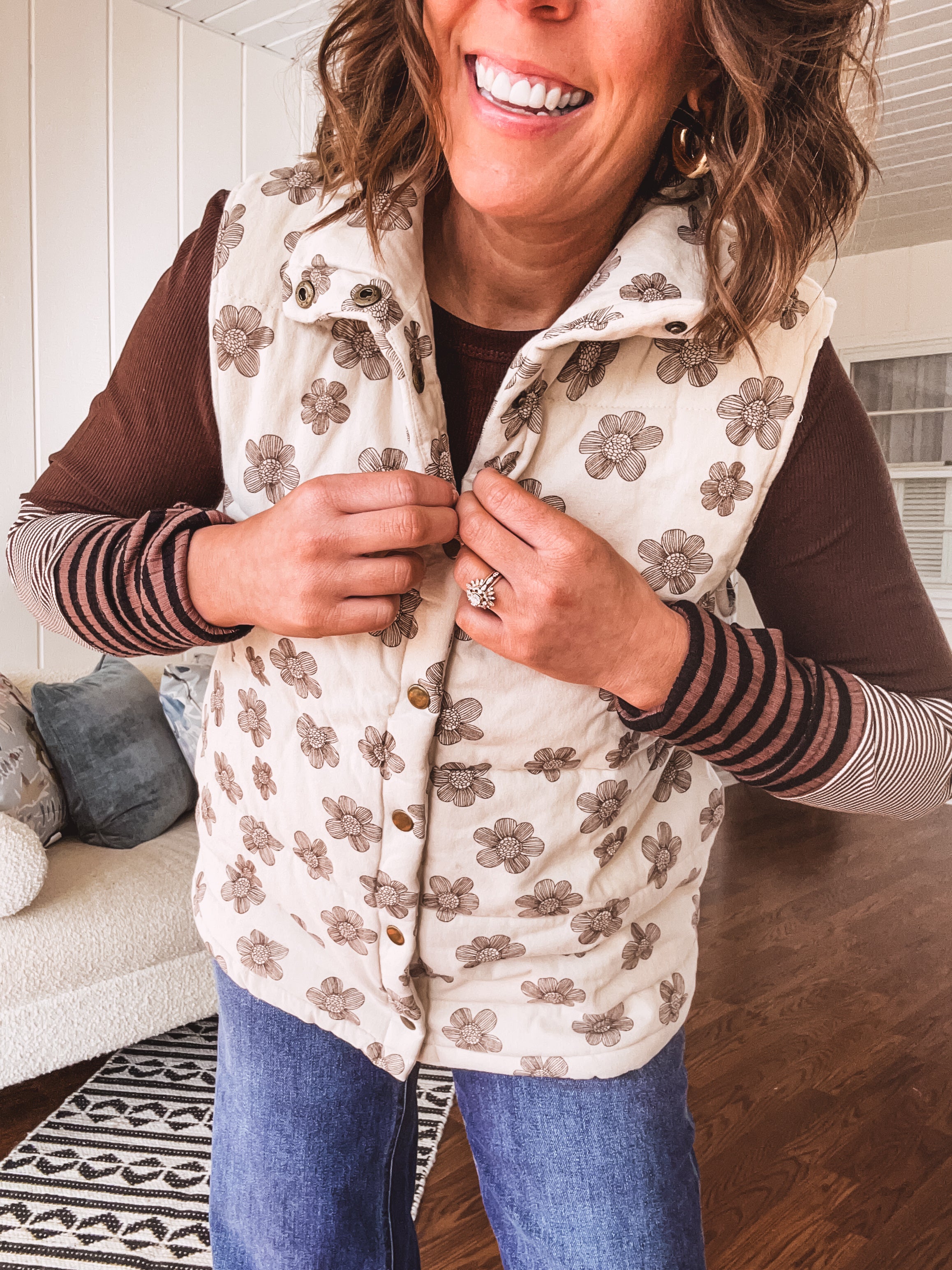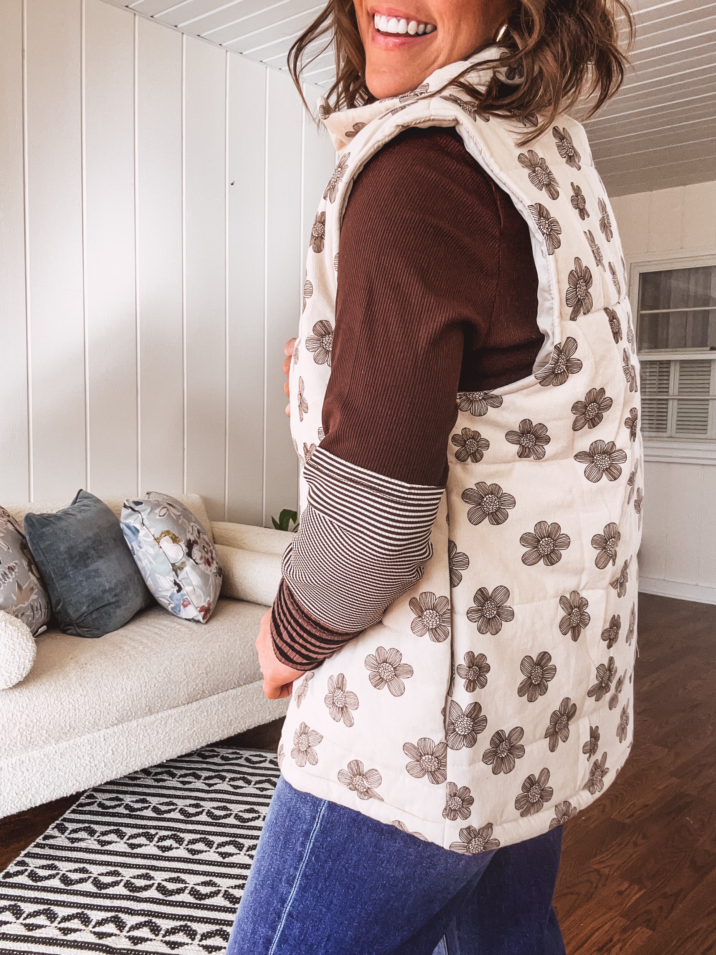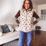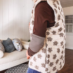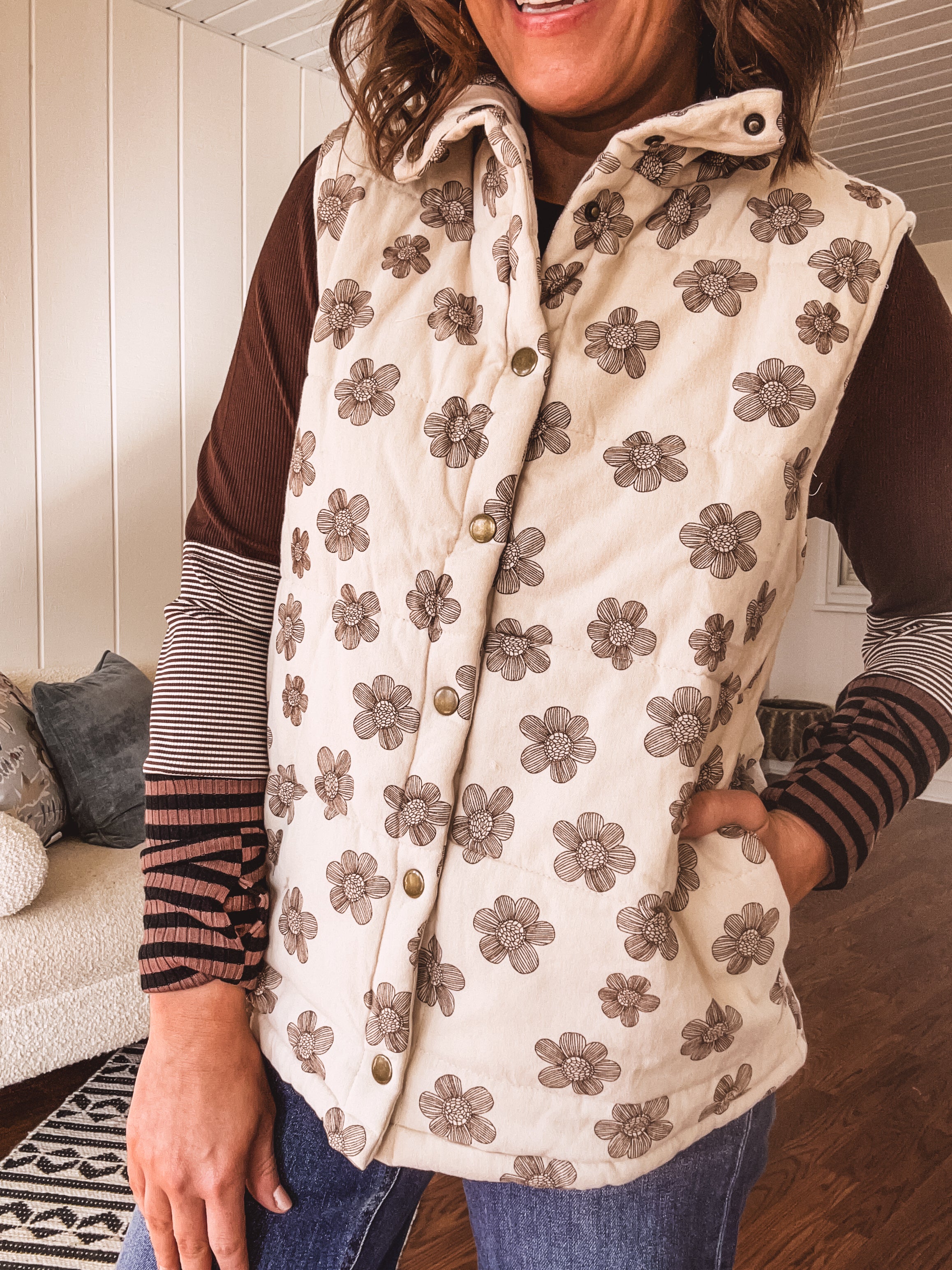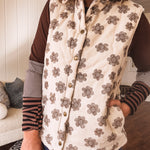 Layer up with effortless style in this ecru padded vest that's as fun as it is functional. The whimsical brown floral doodle pattern adds personality to any outfit, while the snap front closure and handy pockets keep things practical. Plush padding wraps you in cozy comfort, making it the perfect companion for tees, mesh tops, or denim. Throw it on and you're ready for whatever the day brings.