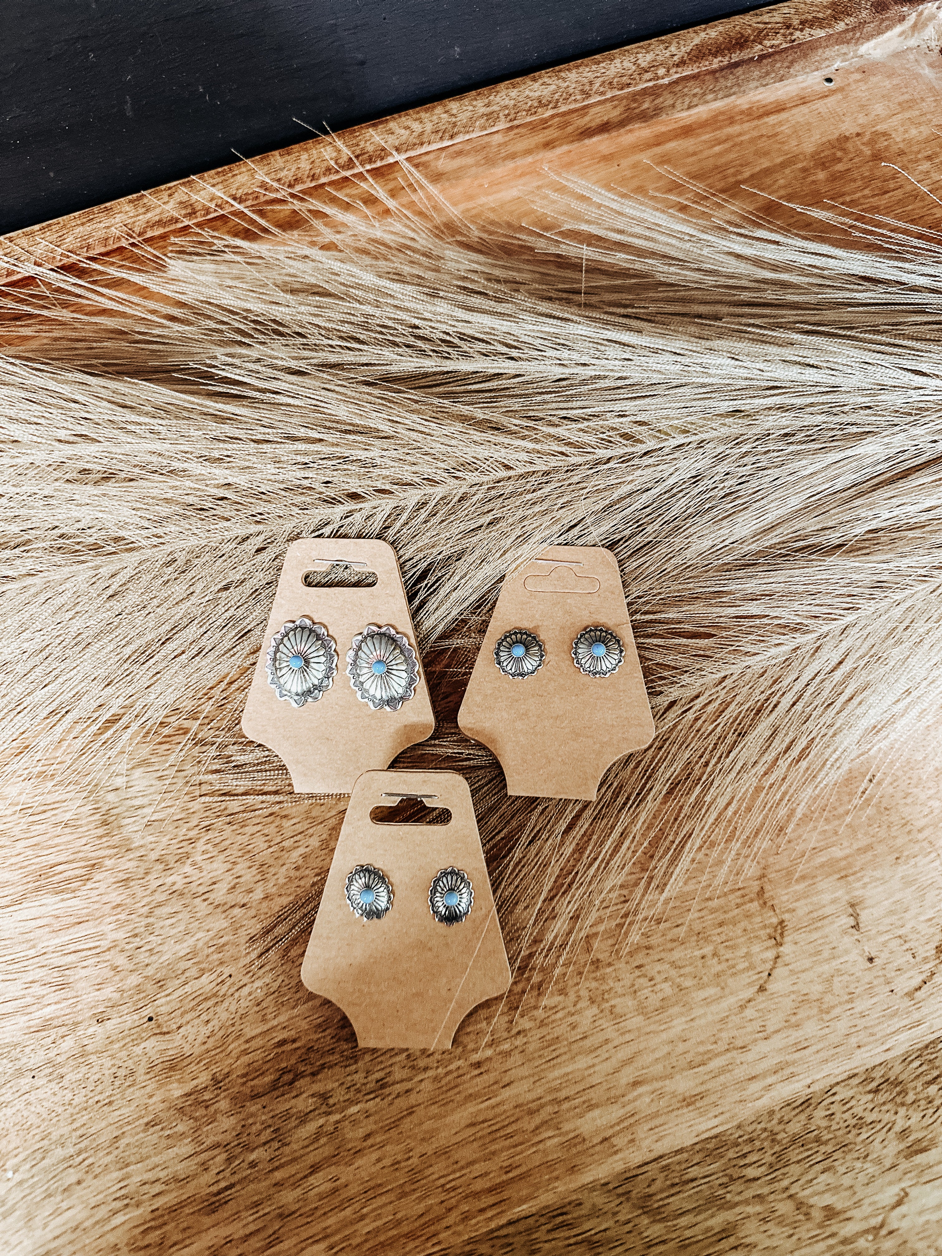 Crafted from authentic sterling silver, these dainty Kingman Turquoise Concho Post Earrings make the perfect accessory for those who prefer a smaller earring, a first earring for children or a second hole placement. Available in either small, circle or oval design or a larger oval design, featuring the classic concho highlighted by a genuine Kingman Turquoise stone in the center.