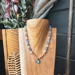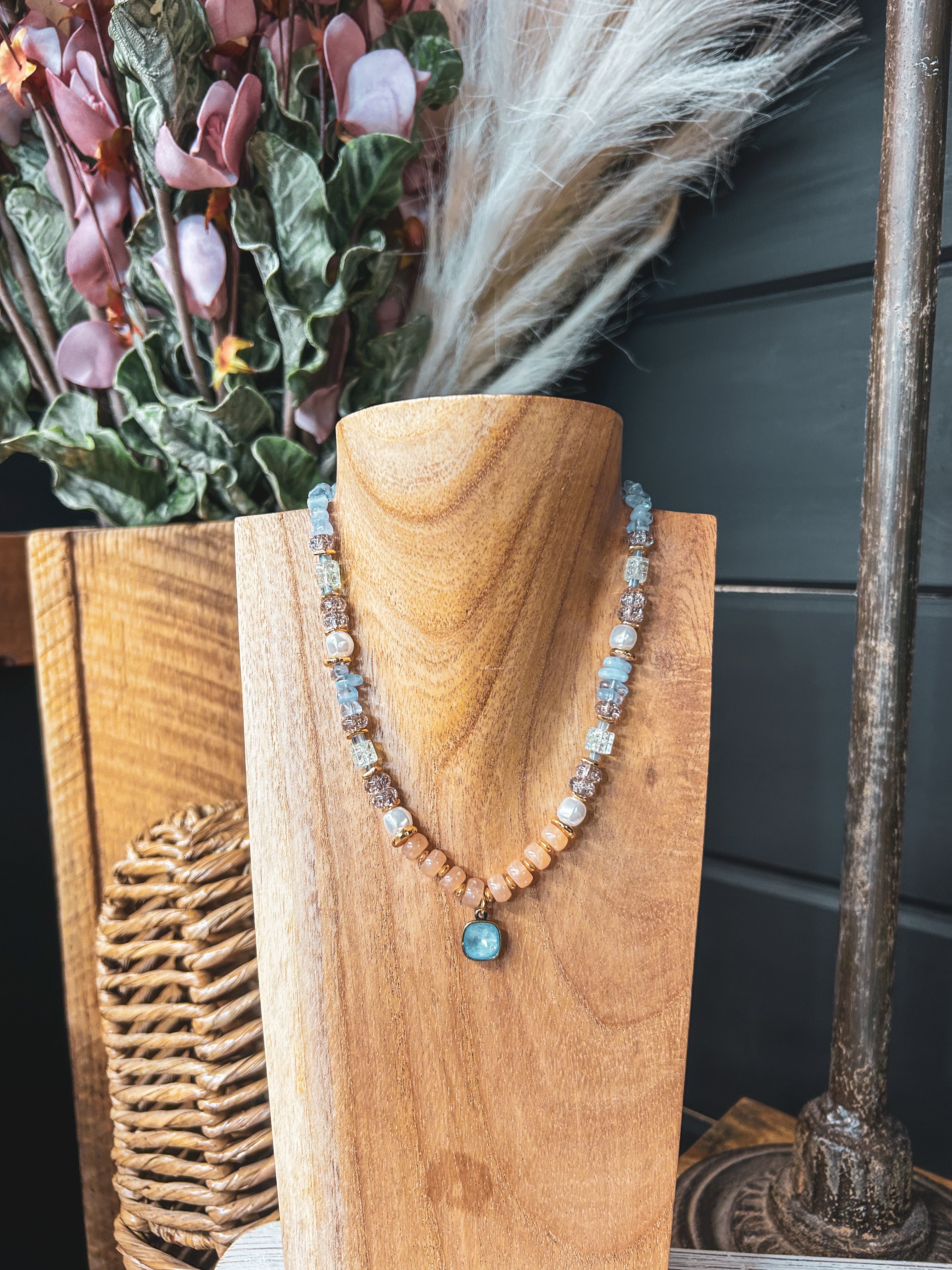 This charming necklace stretches to 8 inches with a 4-inch extender, secured by a lobster claw clasp. It features a delightful mix of polished light purple stones mimicking a lapis lazuli, sparkling blush and teal beads, creamy faux pearls, and soft coral accents all kissed with gold detailing. The show-stopper? A gorgeous square blue crystal charm that adds the perfect finishing touch to your 'fit.