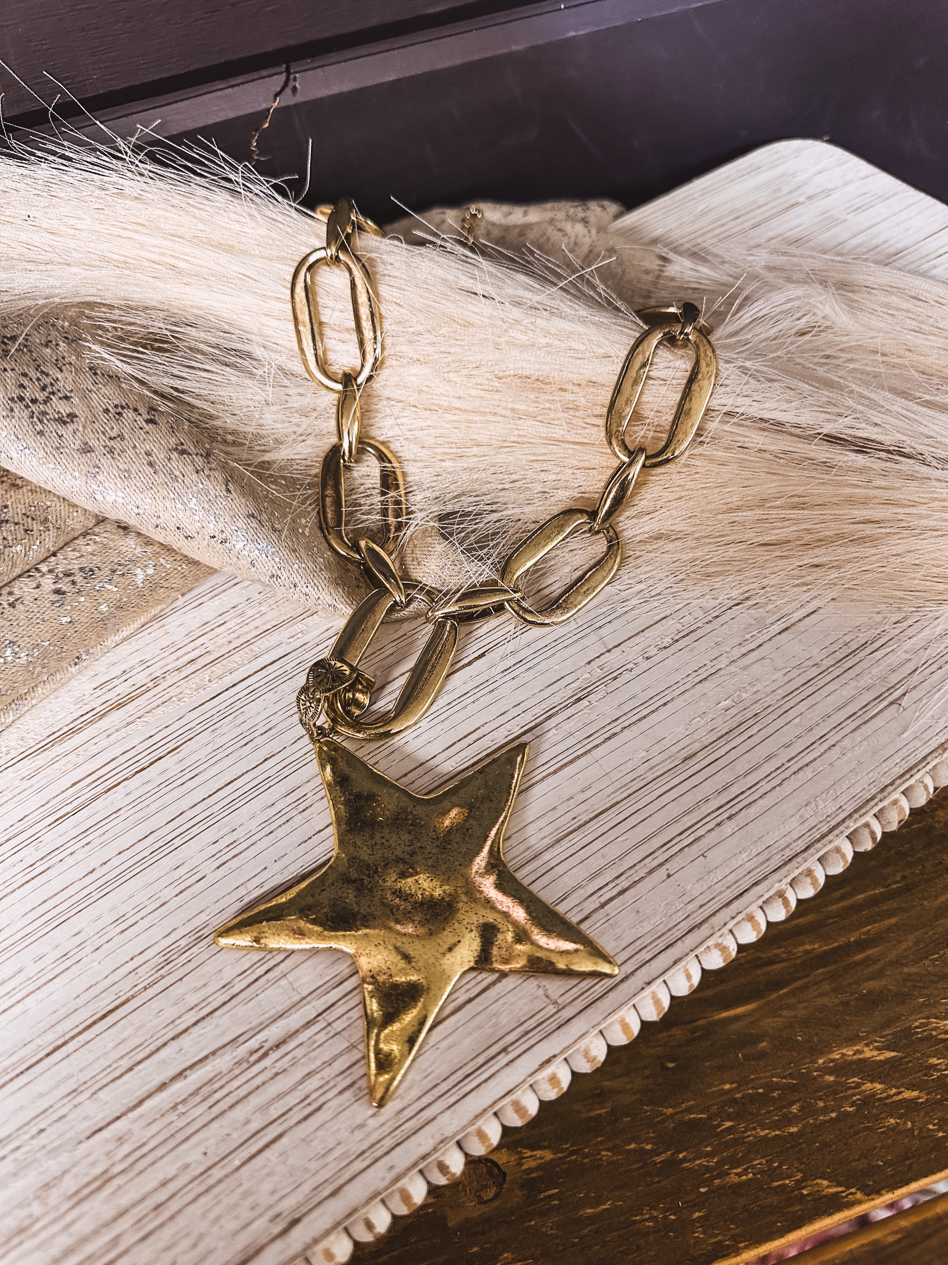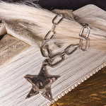 Make a bold fashion statement with this oversized star necklace that's equal parts fun and fearless. Measuring 13" with a 3" extender, it features a chunky faux silver or gold-plated chain paired with a massive 3" star charm suspended from an etched ring. The lobster claw closure keeps your look secure while you turn heads. Perfect for anyone who loves jewelry with serious attitude and personality.