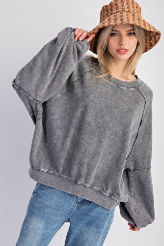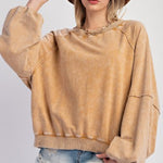 Lightweight and oversized in a delightful way, this Mineral Wash Terry Knit Pullover is the perfect blend of comfort and trendy style. Its soft, breathable material and unique balloon sleeves make it a must-have for spring, summer, and fall. Don't be surprised if you end up wanting one in every color!