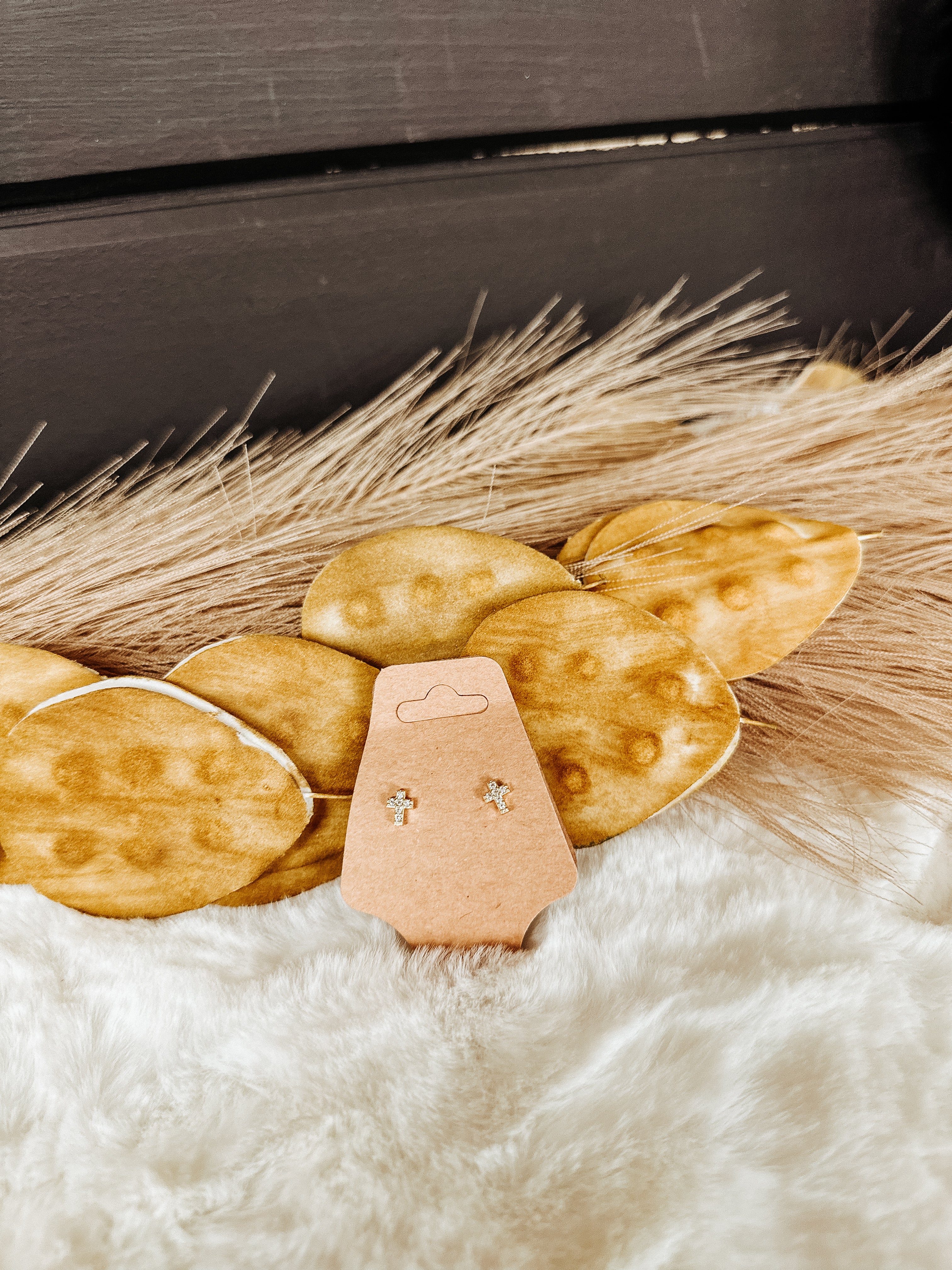 Simple and stunning, these Mini Cross Stud earrings feature cubic zirconia stones set in faux gold making a gorgeous combination. These are perfect for second hold placement, or for littles who have their ears pierced!