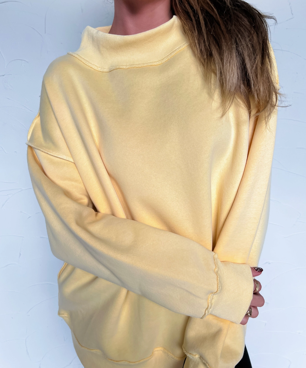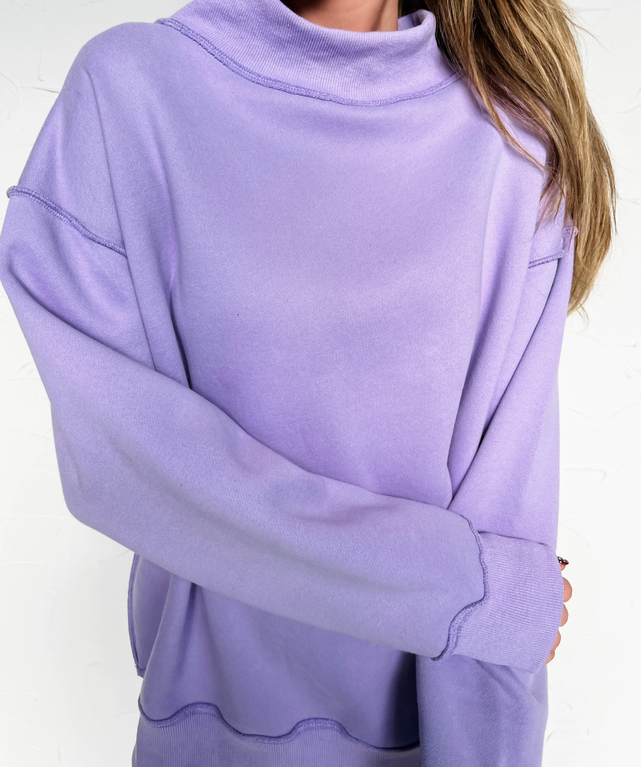 Cozy up in this laid-back sweatshirt that's basically a hug you can wear. The oversized silhouette and buttery-soft fabric pair beautifully with your favorite shorts or denim, while the chunky ribbed mock neck and statement seams add just enough edge to keep things interesting. Your go-to pick for those crisp mornings and breezy evenings when comfort is non-negotiable.