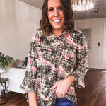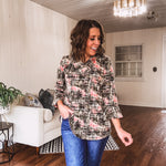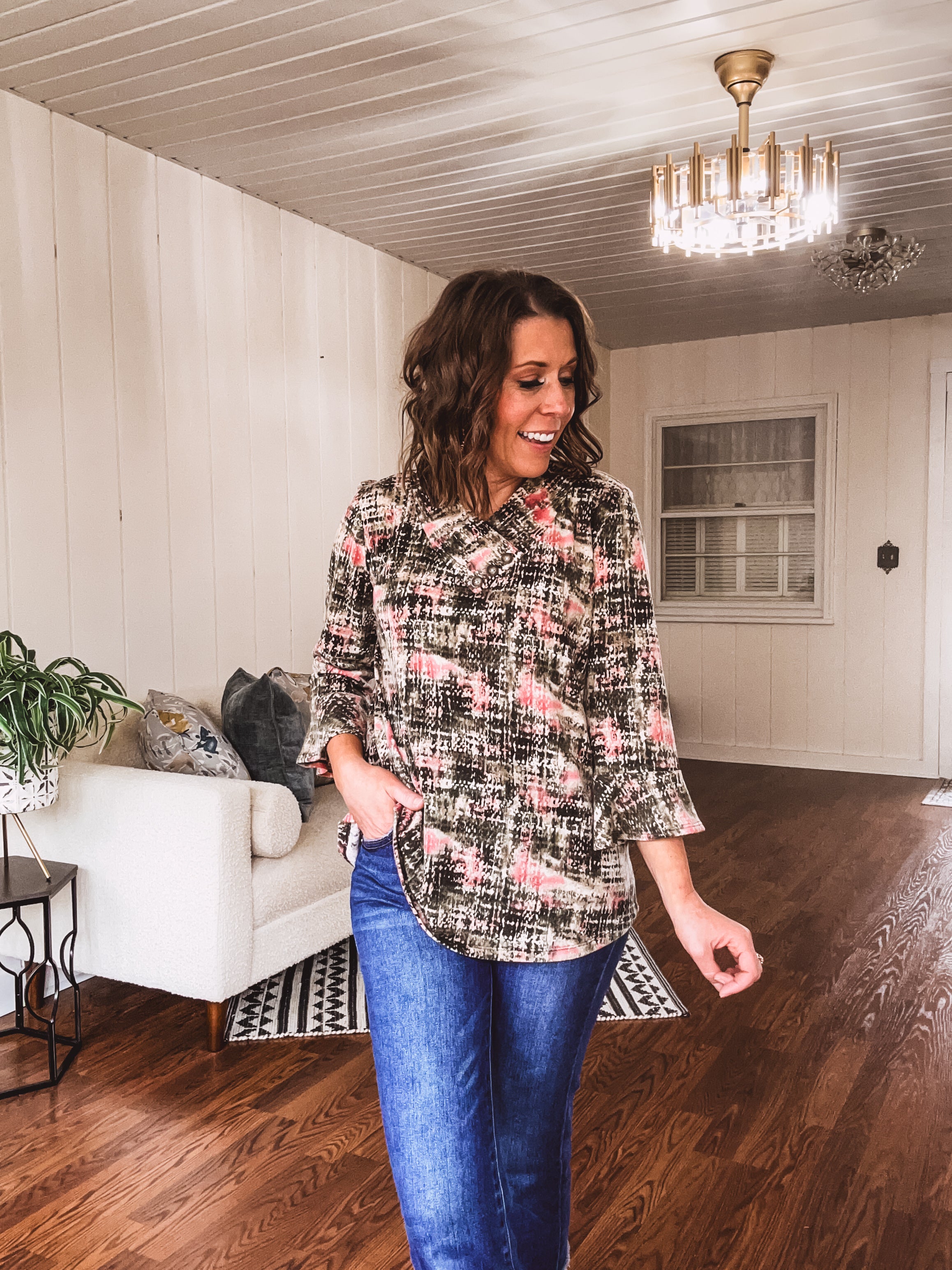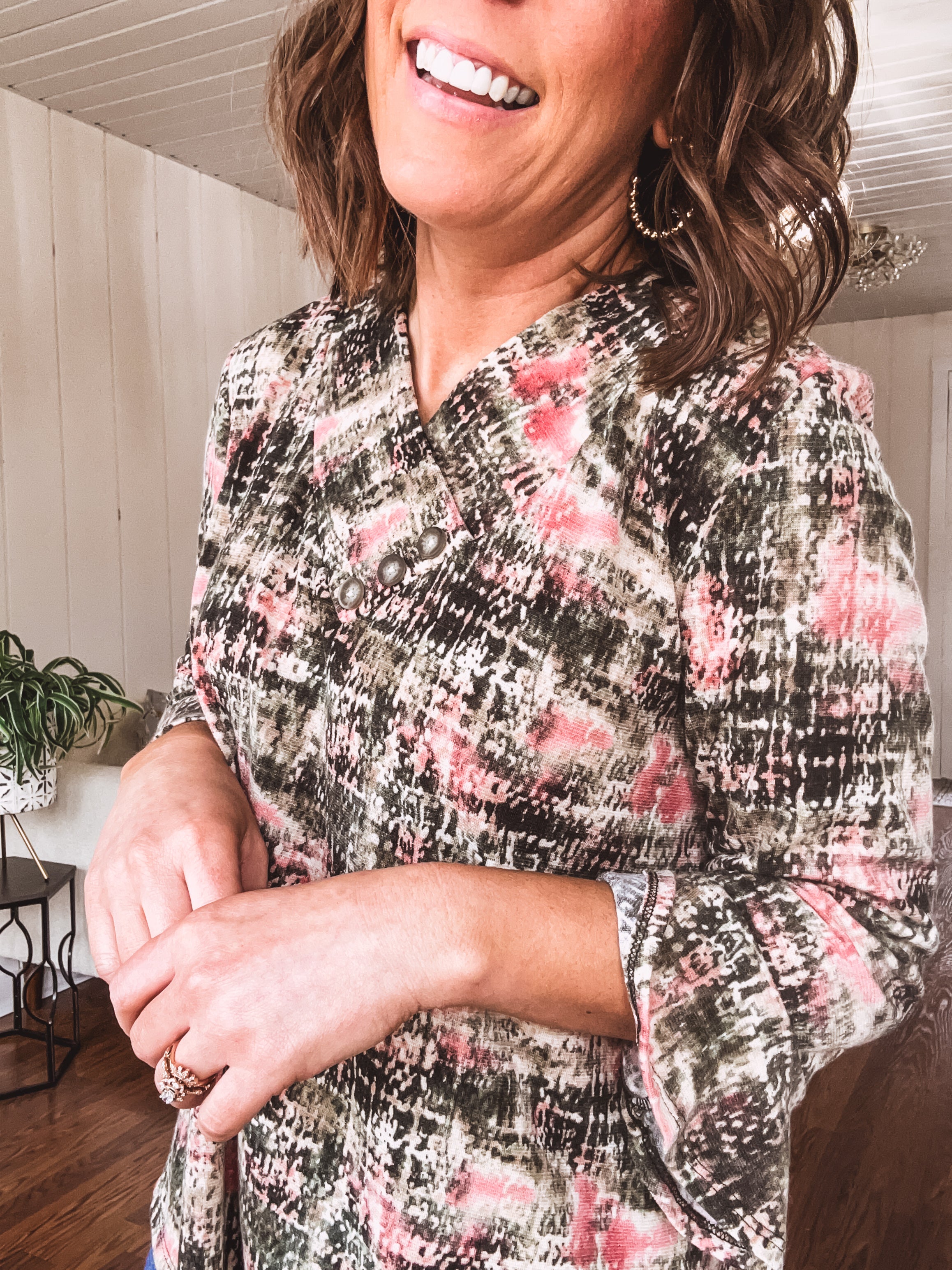 Elevate your everyday wardrobe with this charming 3/4 sleeve blouse that effortlessly transitions from office to evening. The eye-catching olive and rose hatch print brings visual interest, while the V-neckline with three-button closure adds a touch of sophistication. Flowy cuffs and hemline create movement and femininity, making this piece as fun to wear as it is flattering. Dress it up or down—this versatile essential works hard so you don't have to.