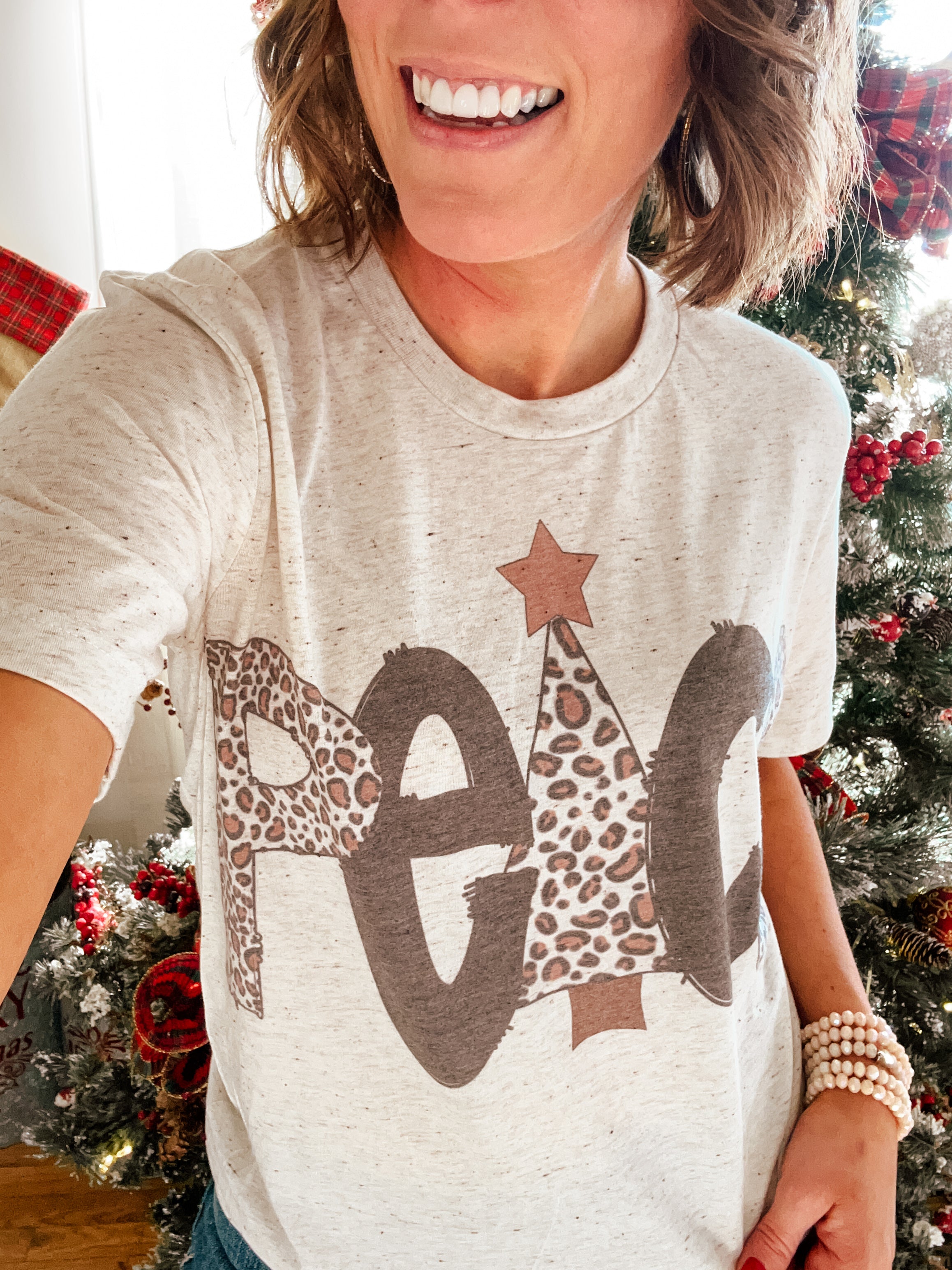 Spread the message of Peace this season with this ultra-soft and lightweight graphic tee. It showcases a "Peace" design in a delicate leo print in charcoal and spice, and even includes a festive Christmas tree! The heathered background adds versatility and makes this tee a must-have for any outfit!