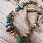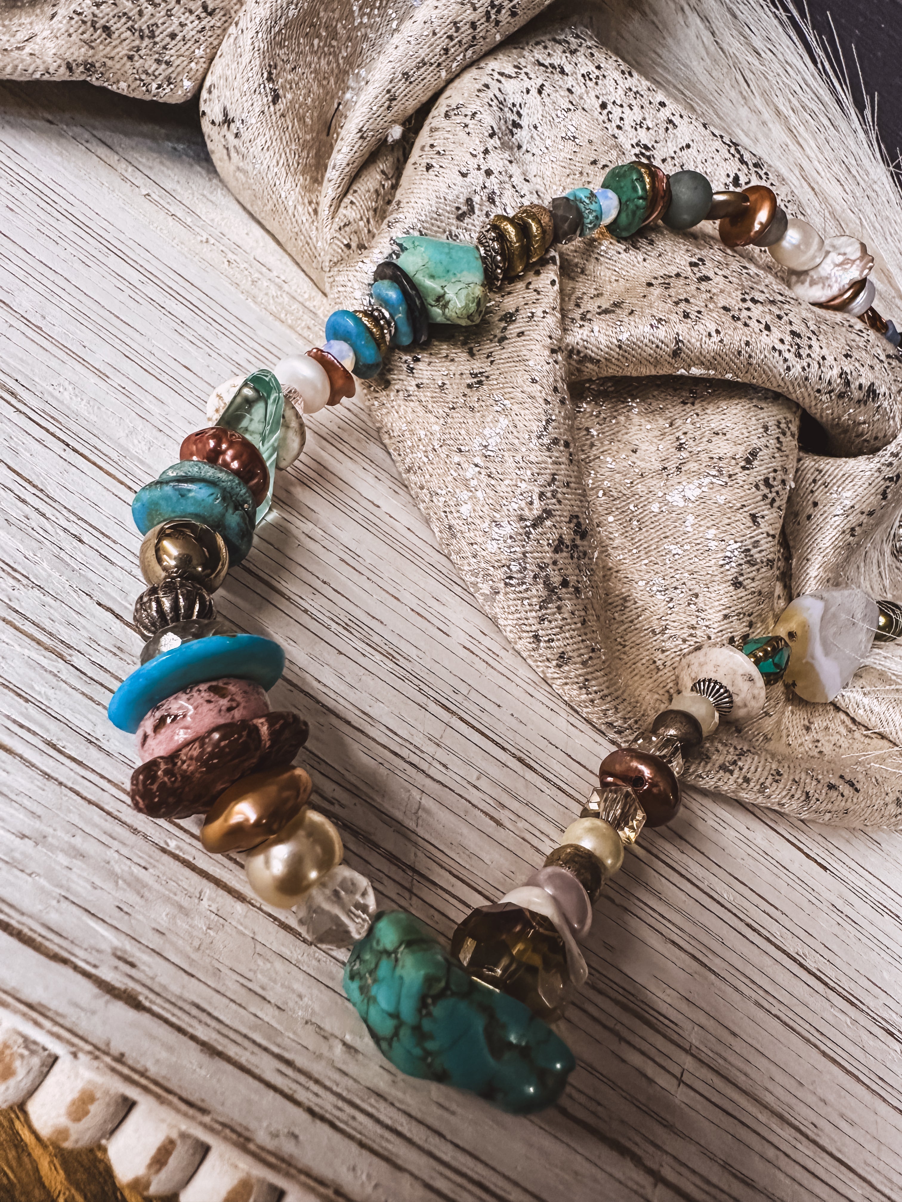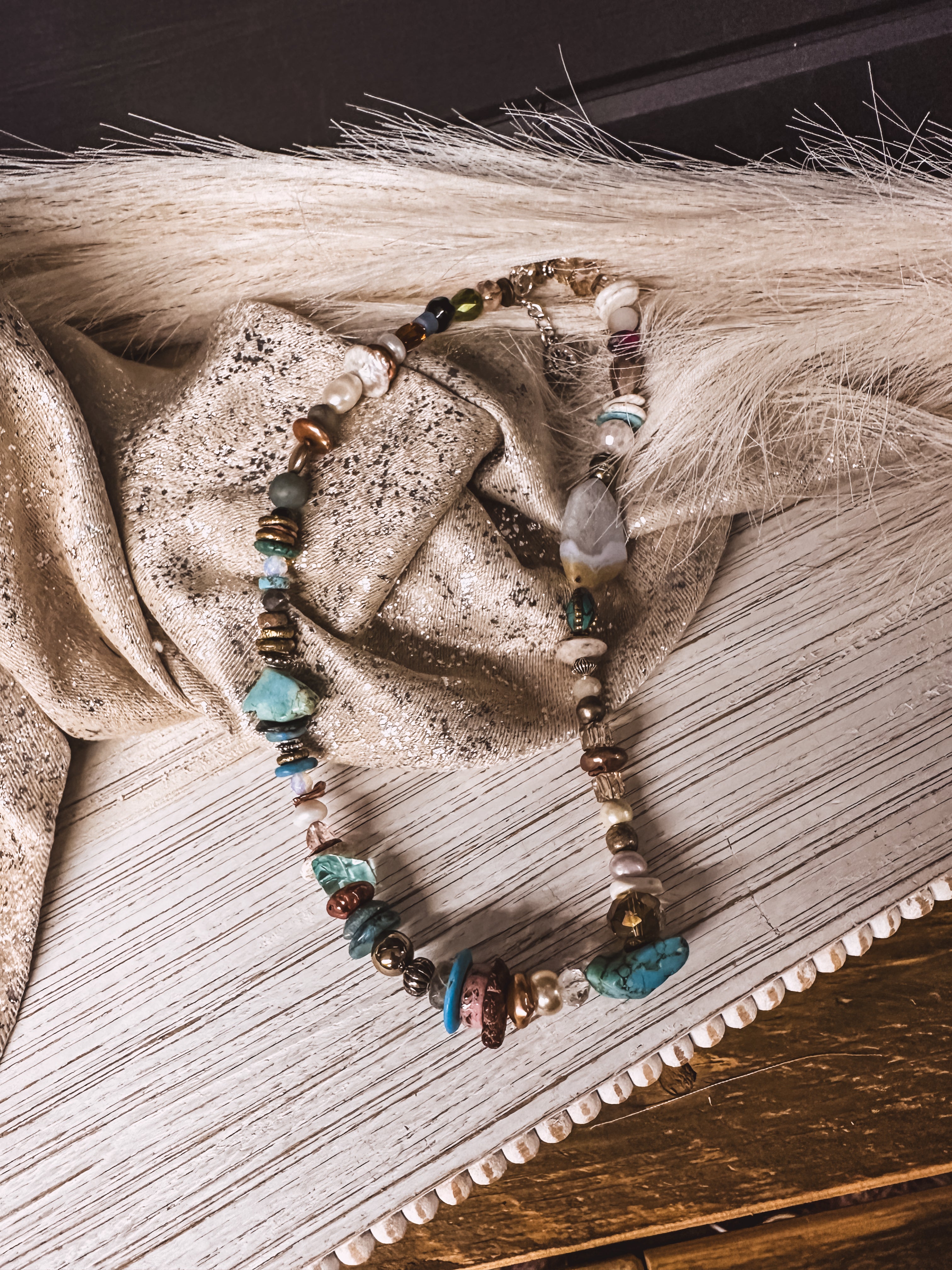 Handcrafted with a mix of crystals, stones, faux pearls, and genuine turquoise accents, this 10" necklace captures the natural beauty of riverside treasures. The adjustable 3" silver chain extender and delicate floral charm add versatility and charm. Creamy, earthy tones blend effortlessly with pops of authentic turquoise for a look that's equal parts western edge and boho soul. Perfect for anyone who loves statement jewelry with personality.