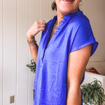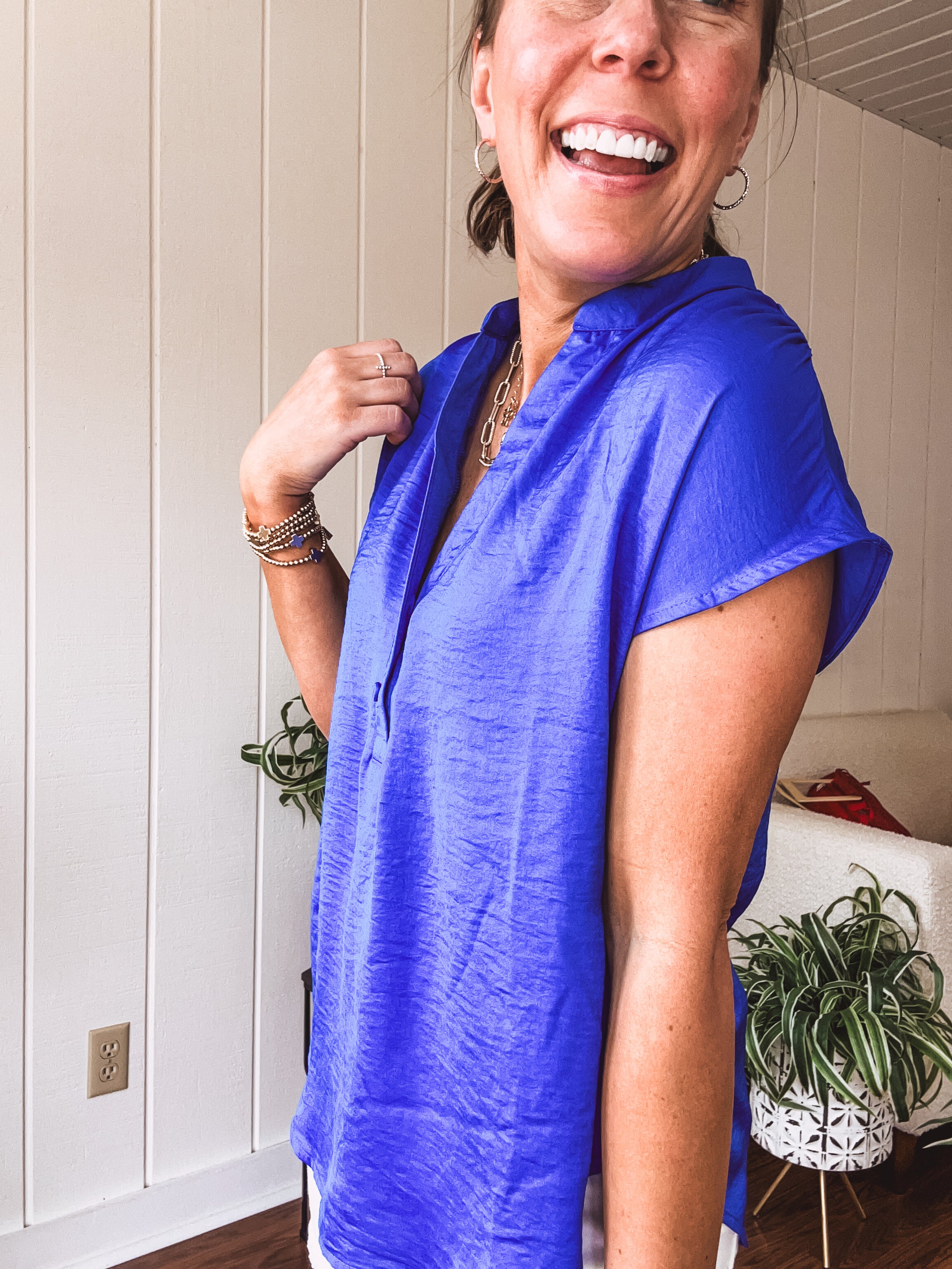 Elevate your wardrobe with this Satin Short Sleeve Blouse featuring delicate cinching details at the shoulders, a mock collar, V-neck, and two fabric buttons. The luxurious silky fabric adds a touch of elegance, making it perfect for layering under a blazer for a sophisticated look or wearing alone for a trendy summer outfit! So cute and stylish, you'll want one in every color!
