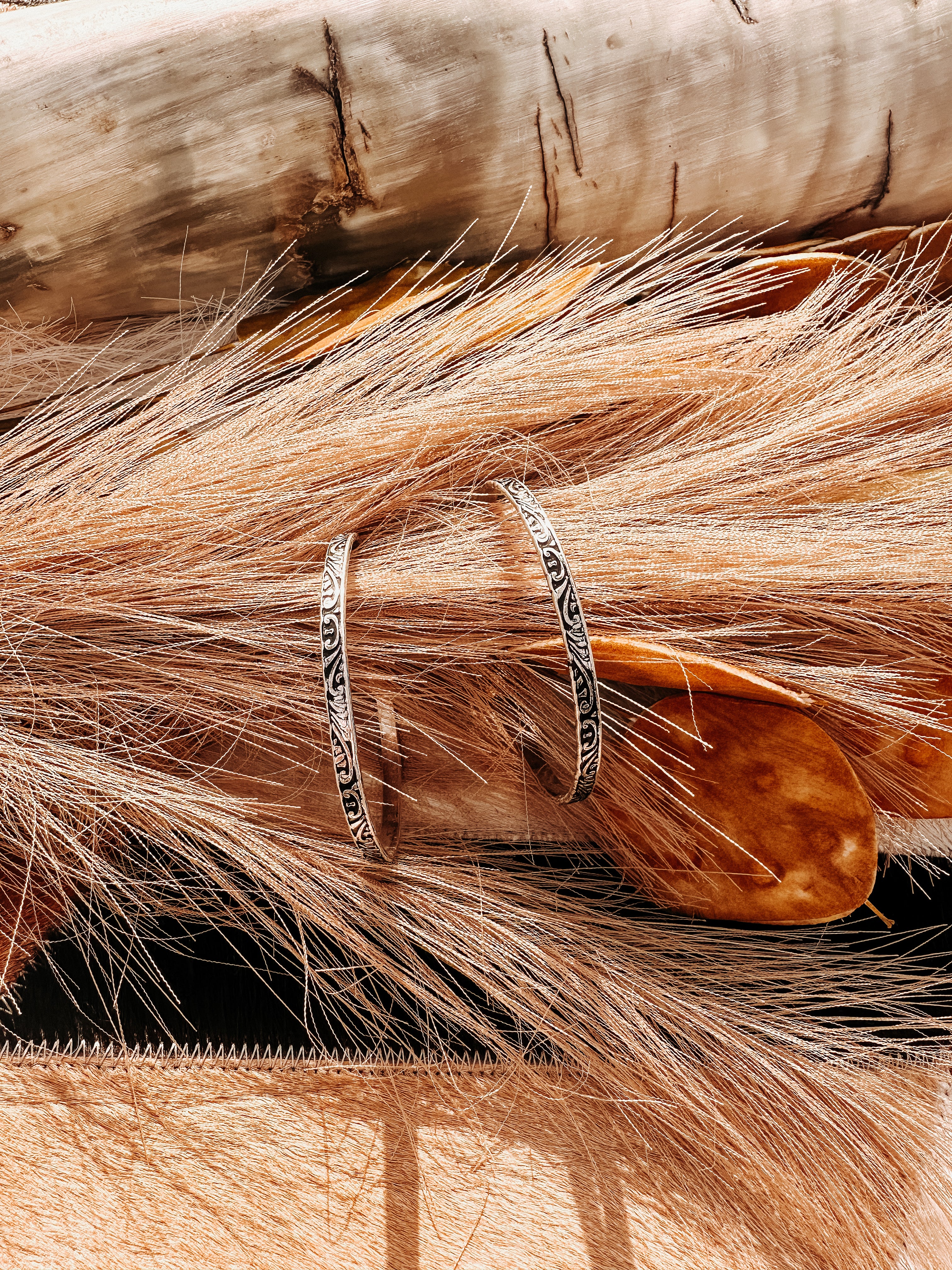 These faux silver hoops are lightweight and slender enough for ideal comfort, but showcase a gorgeous scroll inlay with oxidation for an intricate and edgy look. Perfect to pair with literally any 'fit. An amazing price point!