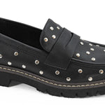 Kick your everyday look up a notch with these studded loafers that mix timeless style and fresh attitude. Easy to slip on, they’re decked out in gleaming metallic studs that grab attention everywhere you go. The chunky lug sole adds a trendy edge while making sure your feet stay comfy all day long. Perfect for work, weekends, or a night out, these will quickly become your new favorites. Soft faux leather with eye-catching metallic studs. Chunky lug sole combining style and comfort. Slip-on design for effortless wear.