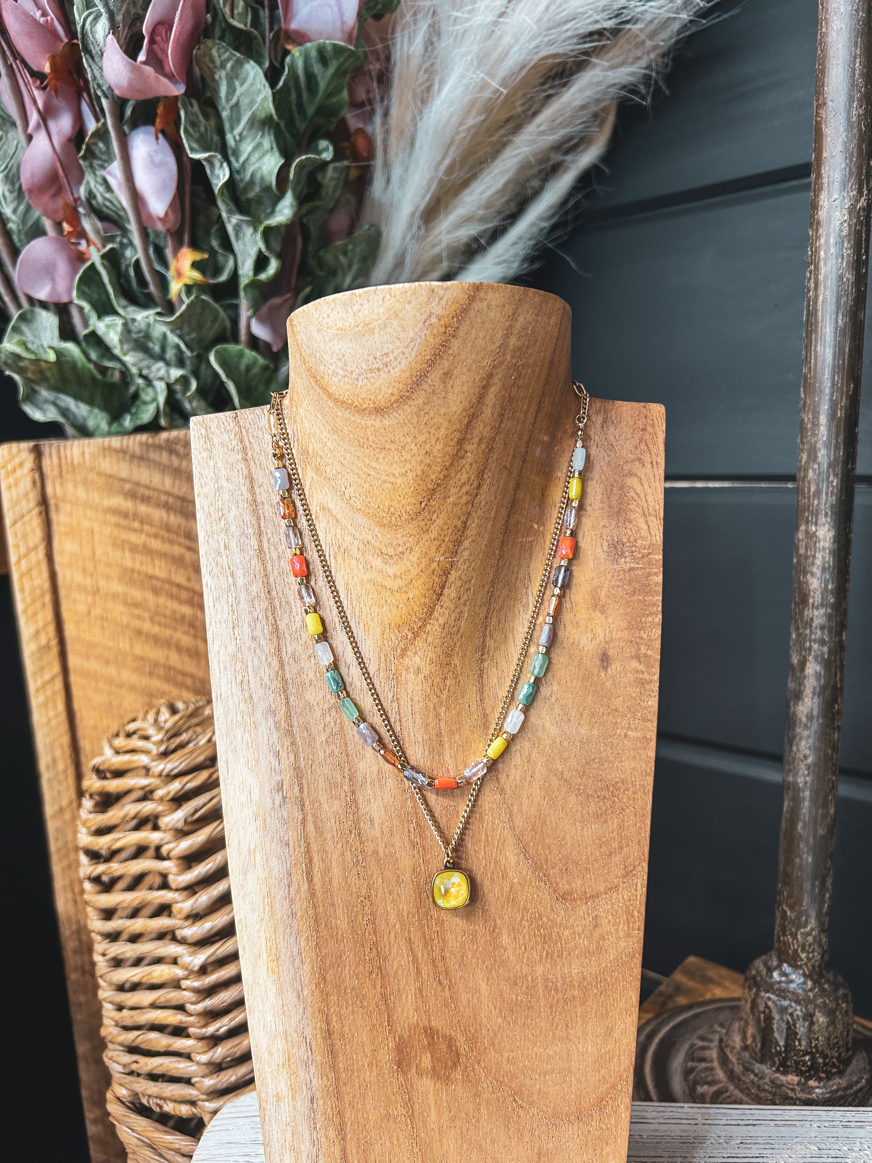 Brighten your days with this cheerful double-layer design featuring a delicate gold chain paired with polished rectangle beads and golden touches. The star of the show? A stunning square yellow crystal charm that catches the light beautifully. Measuring 8 inches with a convenient 3-inch extender and secure lobster claw closure, it's the perfect length for layering or wearing solo. Pure sunshine in necklace form.