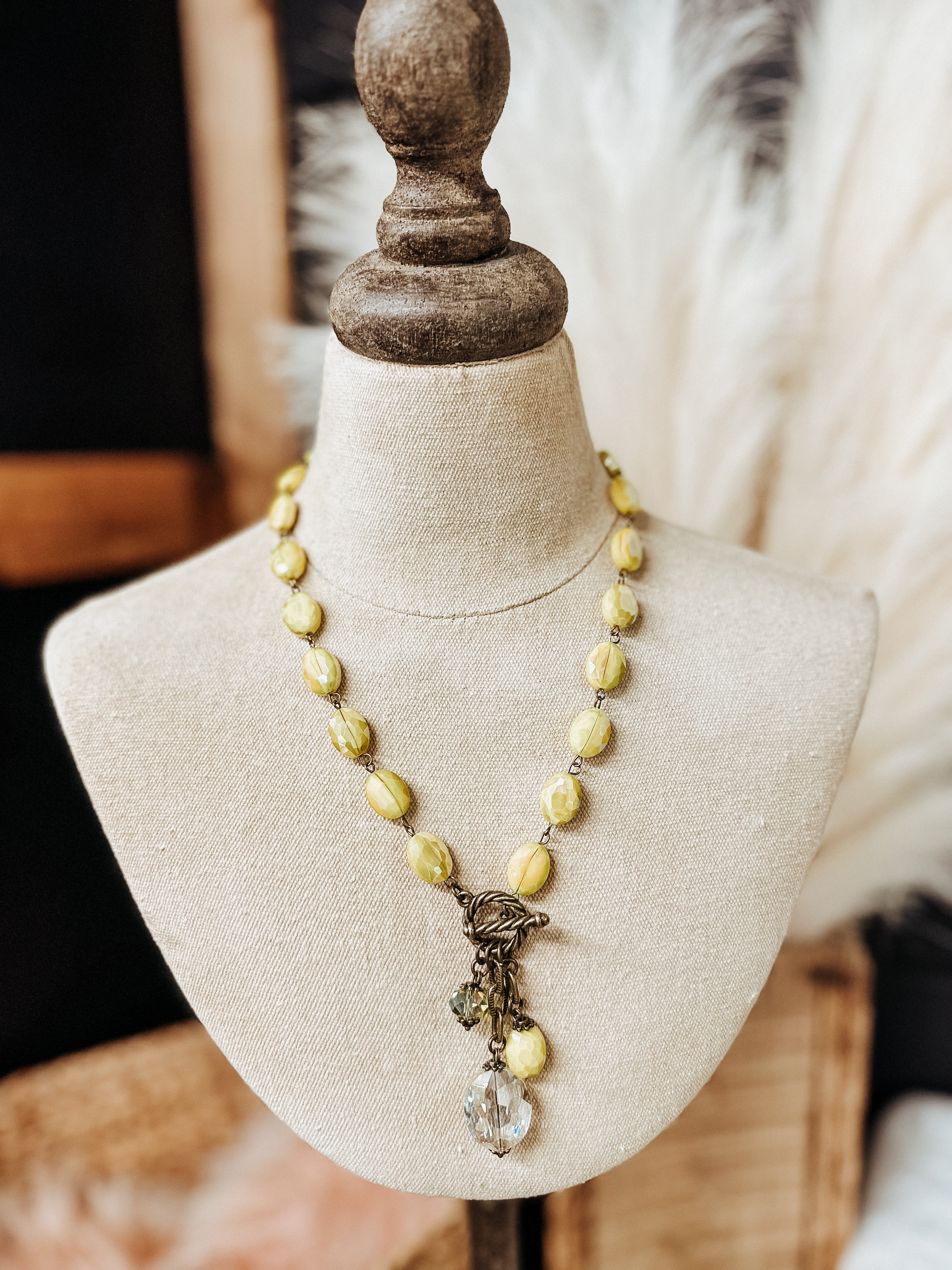 Bright golden-yellow seed-shaped beads shimmer along this playful necklace, ending in a vintage-style brass toggle clasp. Accented with charming details like a clear gem, a sunny yellow bead, and a tiny iridescent pearl, this handmade piece is perfect for adding a cheerful pop to any outfit. Make your style shine and turn heads with this unique treasure.