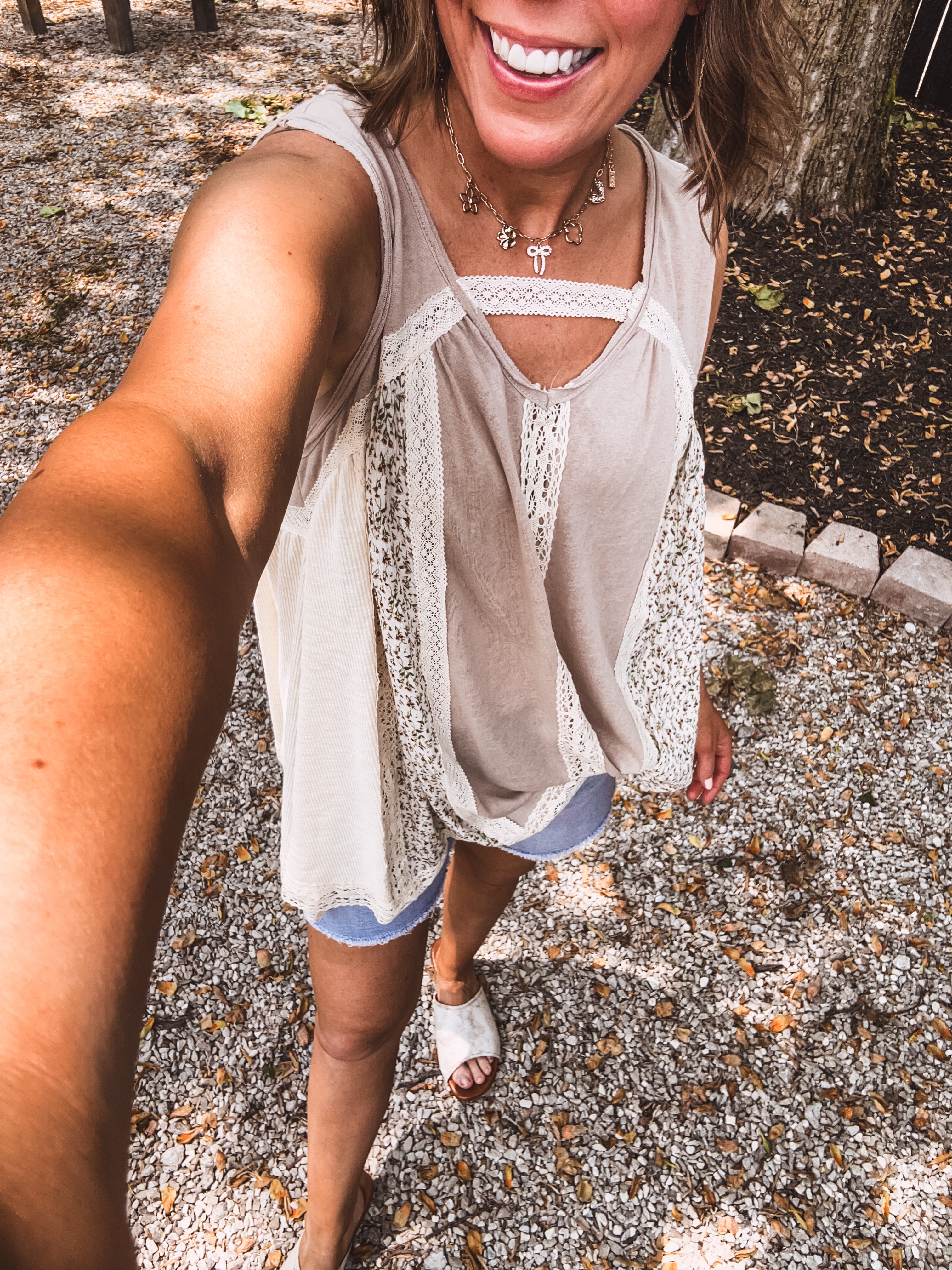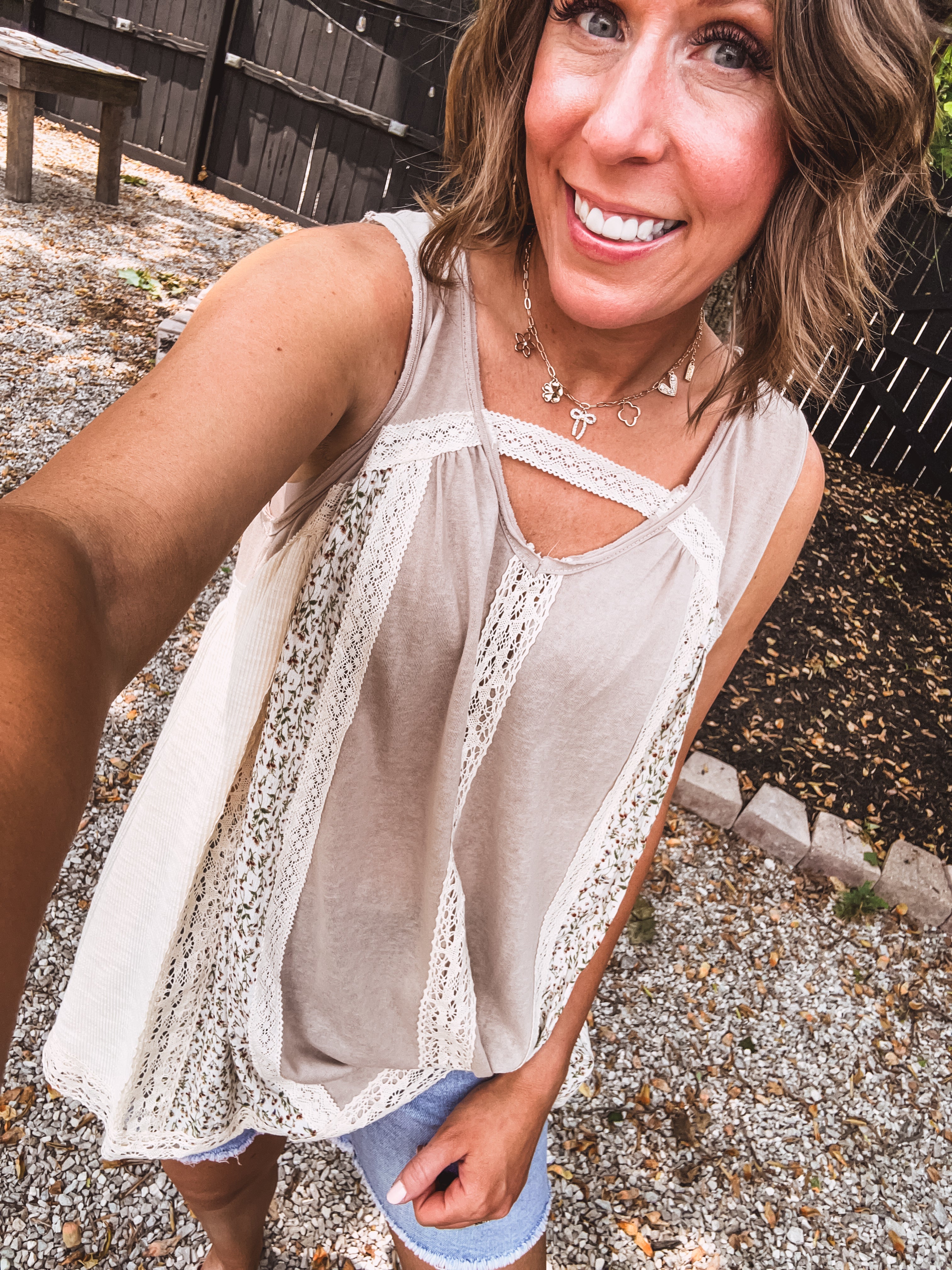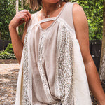 Catch eyes in this dreamy taupe tank that's all about the details! Delicate crochet lace and floral accents dance across the breezy silhouette, creating summer magic with every movement. Pair with your favorite shorts or skirts for warm-weather fun, then toss on a cozy layer when leaves start to fall. This versatile piece transitions through seasons with effortless charm!