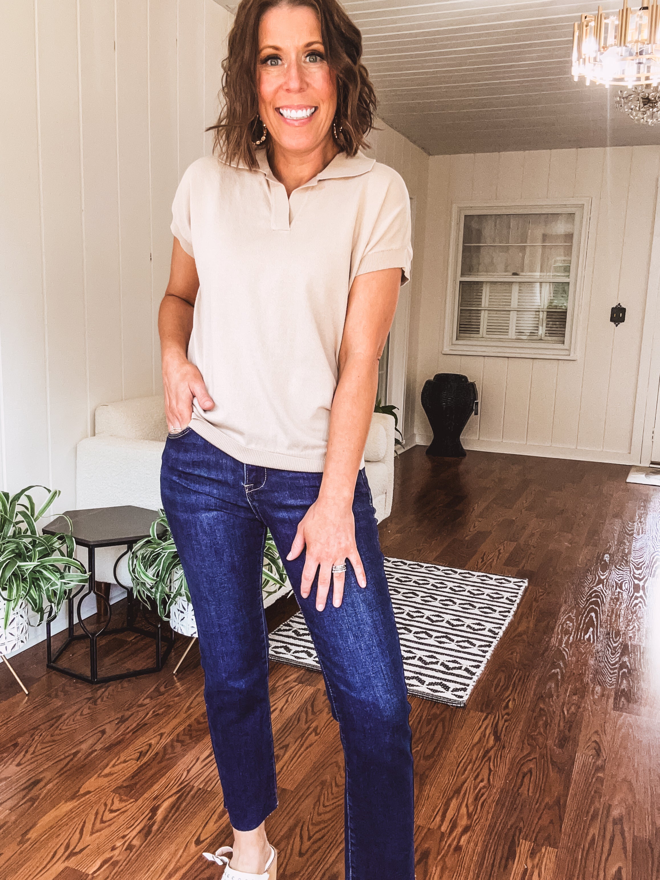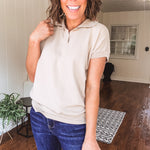 Playfully neutral and oh-so-versatile, this taupe pullover brings the fun with its lightweight knit fabric, charming collar, and modest V-neck. The wide ribbed hem adds just the right touch of sass! Mix and match with your summer wardrobe favorites—dress it up for brunch, keep it casual for errands, or layer it for those cooler evenings. This closet superstar plays well with everything in your fashion playground!