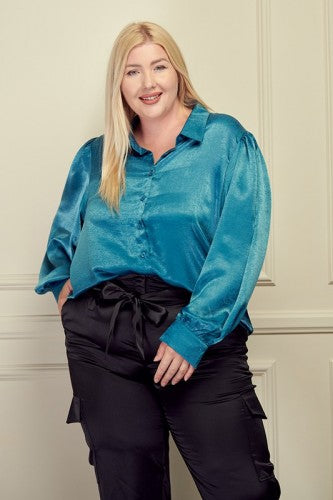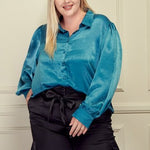 Teal Blue Button Front Satin L/S Blouse