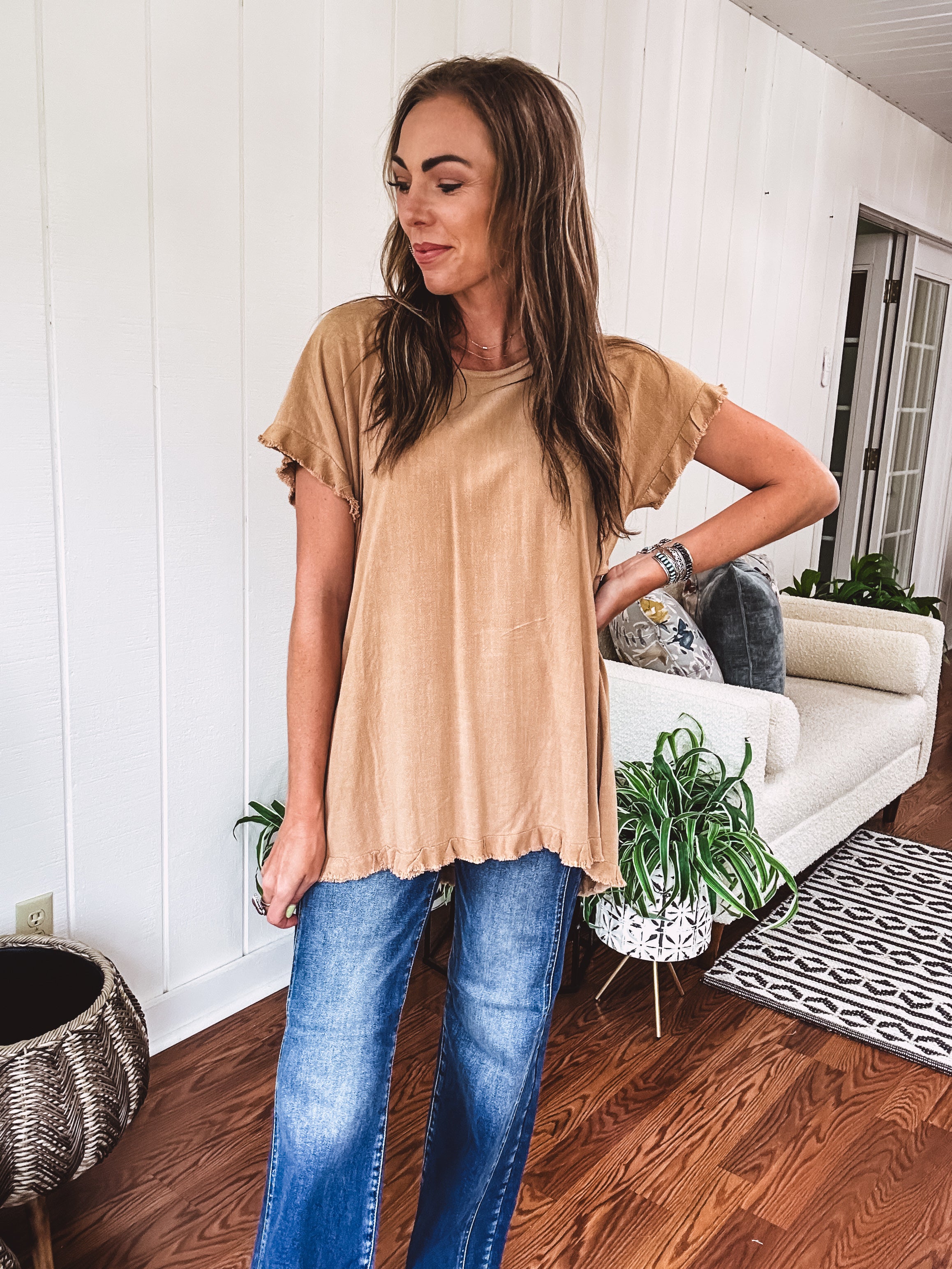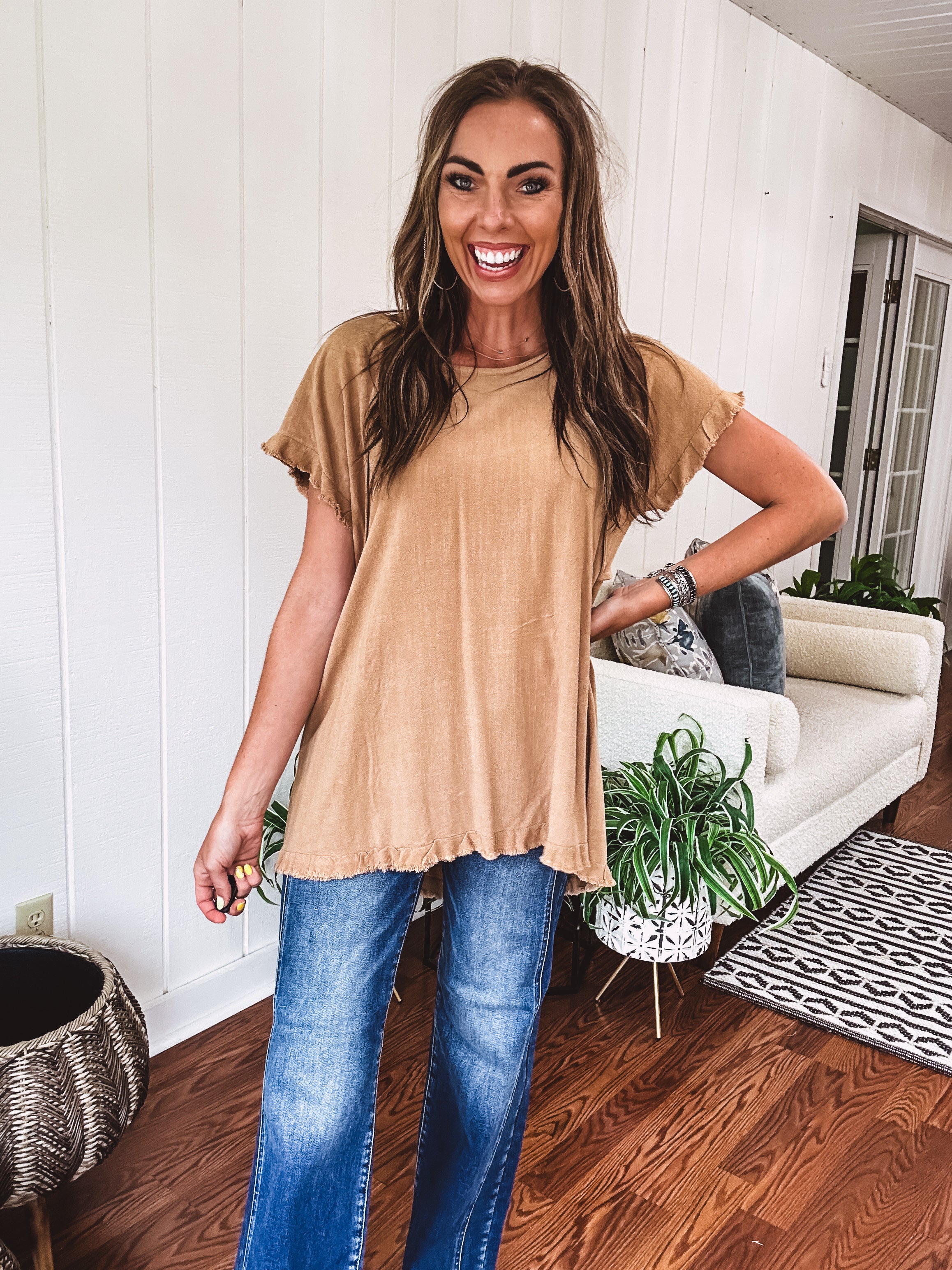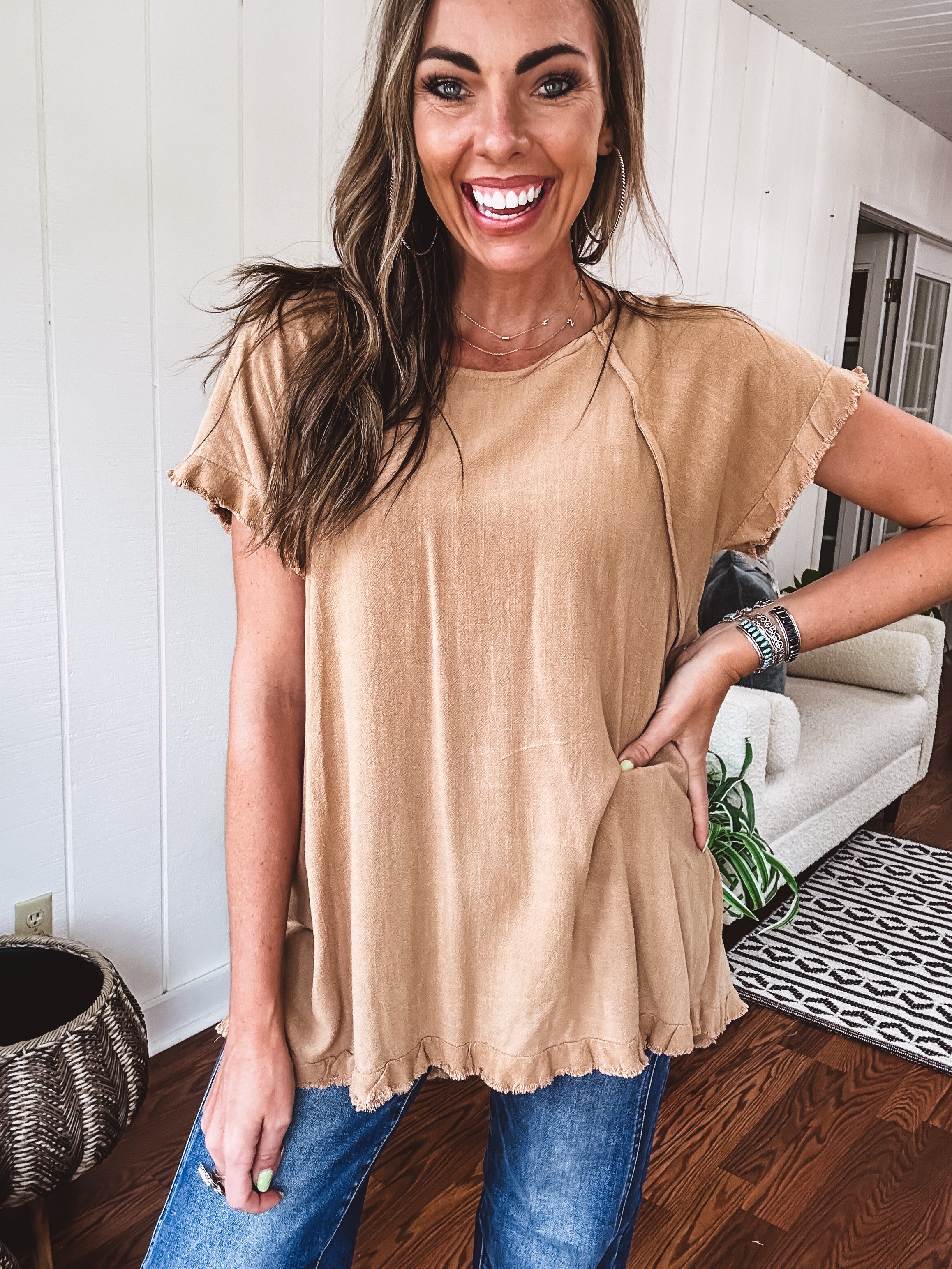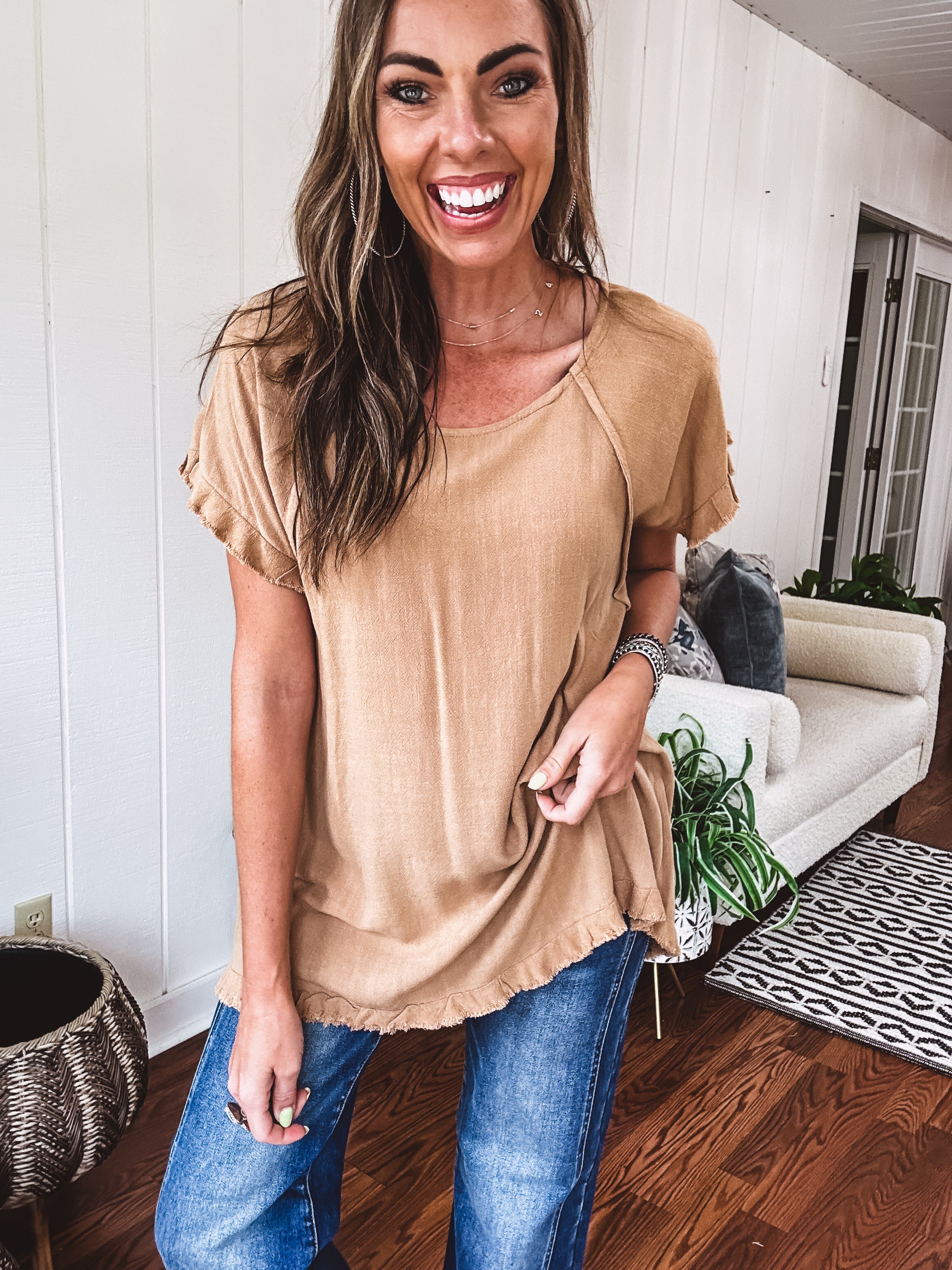 This top comes in a warm toffee shade with a soft, breezy linen feel. It features a round neckline and charming frayed edges on the sleeves and hem. Perfectly sized for layering or pairing with leggings or skinny jeans and booties to bring a playful, textured twist to your outfits!