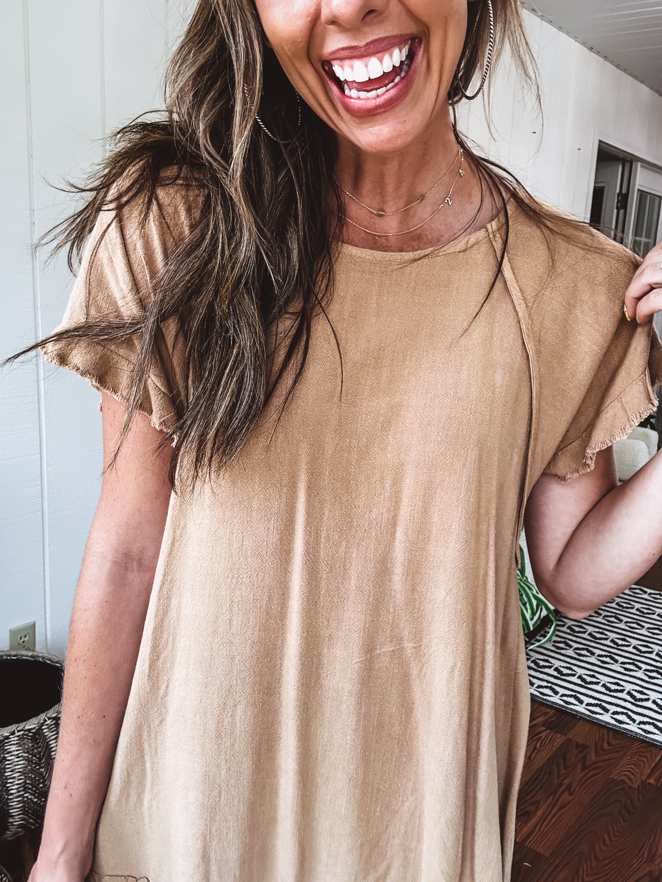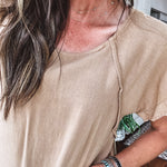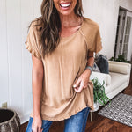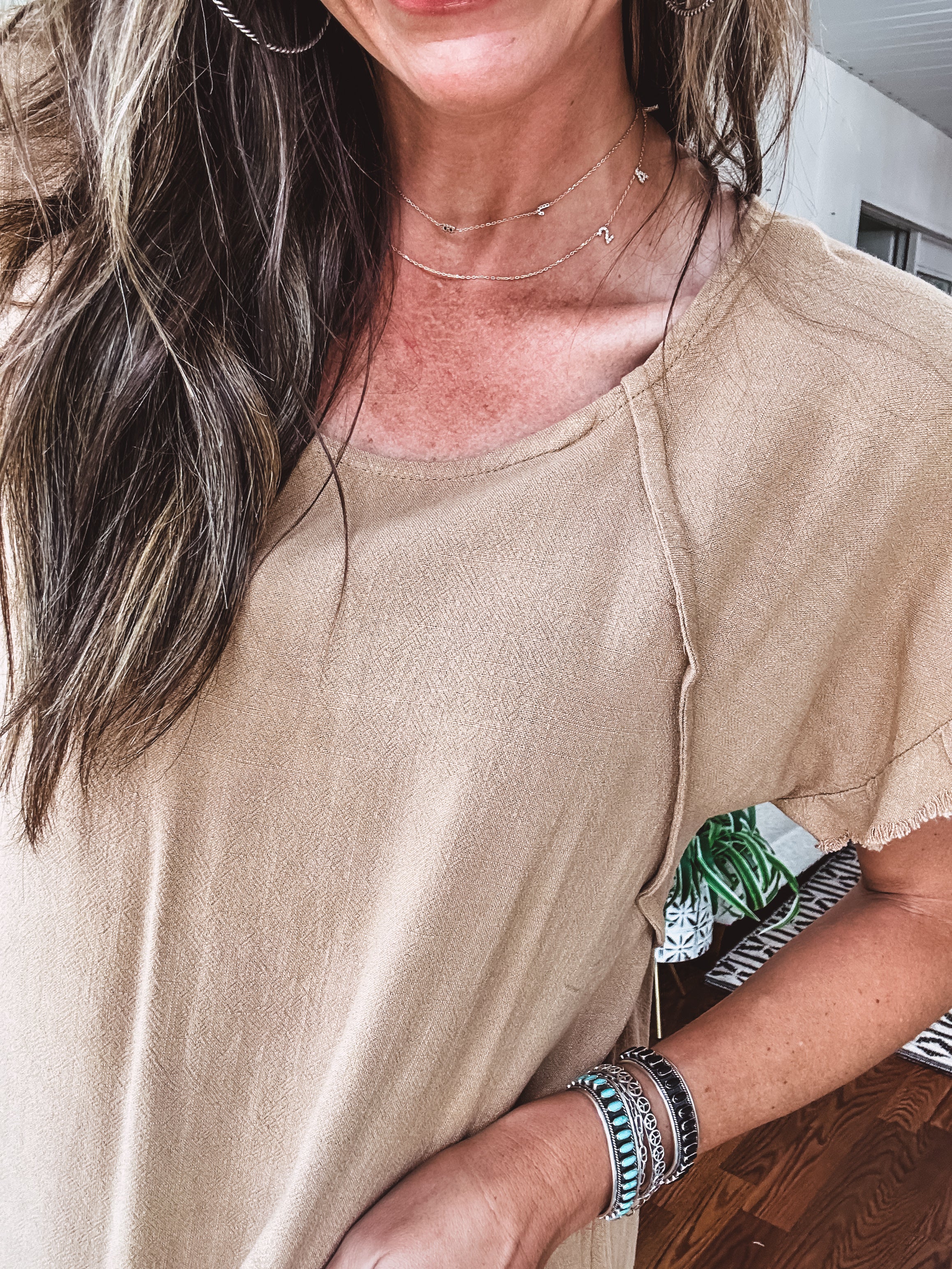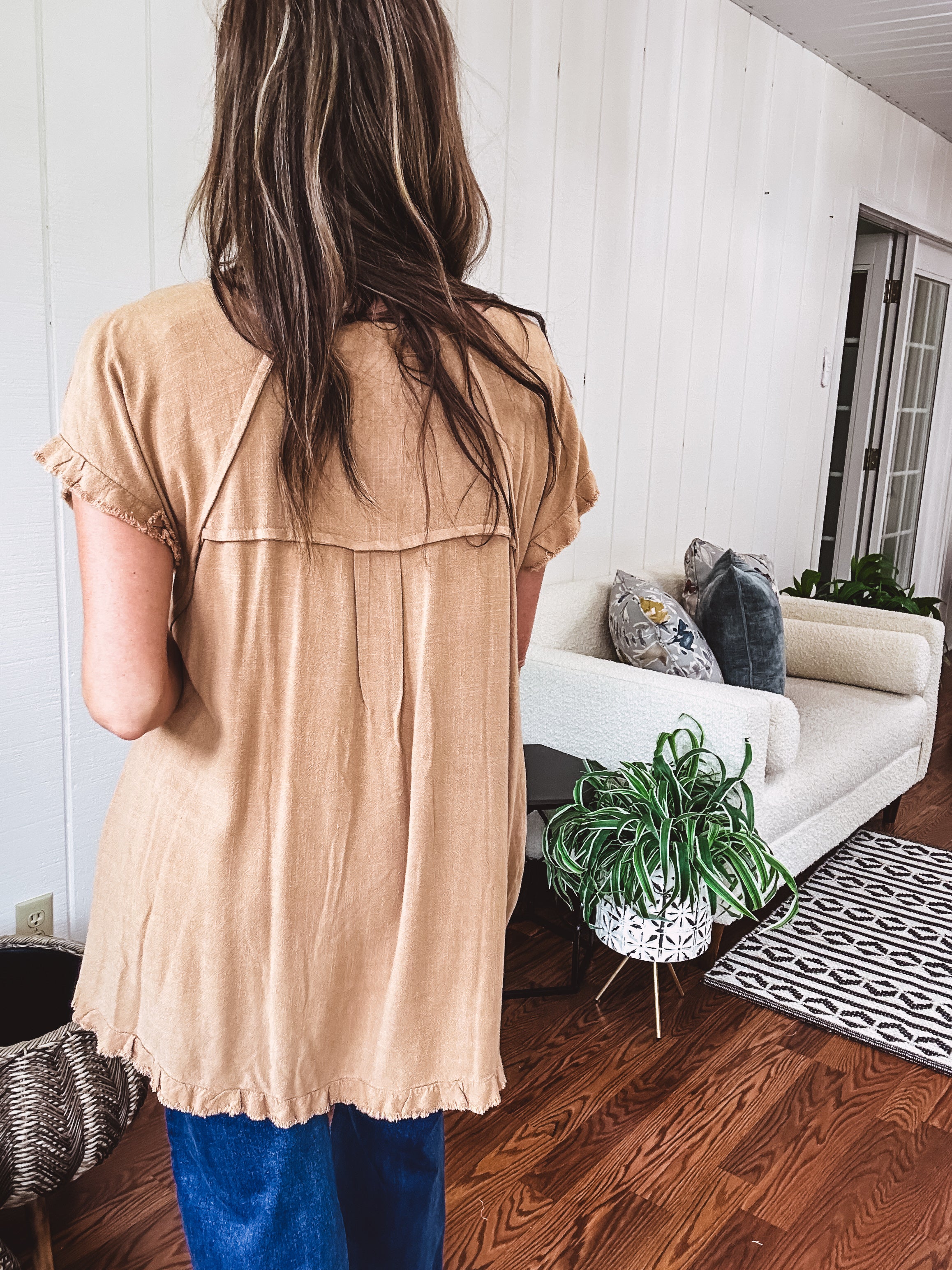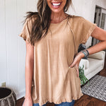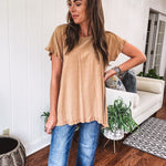 This top comes in a warm toffee shade with a soft, breezy linen feel. It features a round neckline and charming frayed edges on the sleeves and hem. Perfectly sized for layering or pairing with leggings or skinny jeans and booties to bring a playful, textured twist to your outfits!