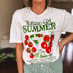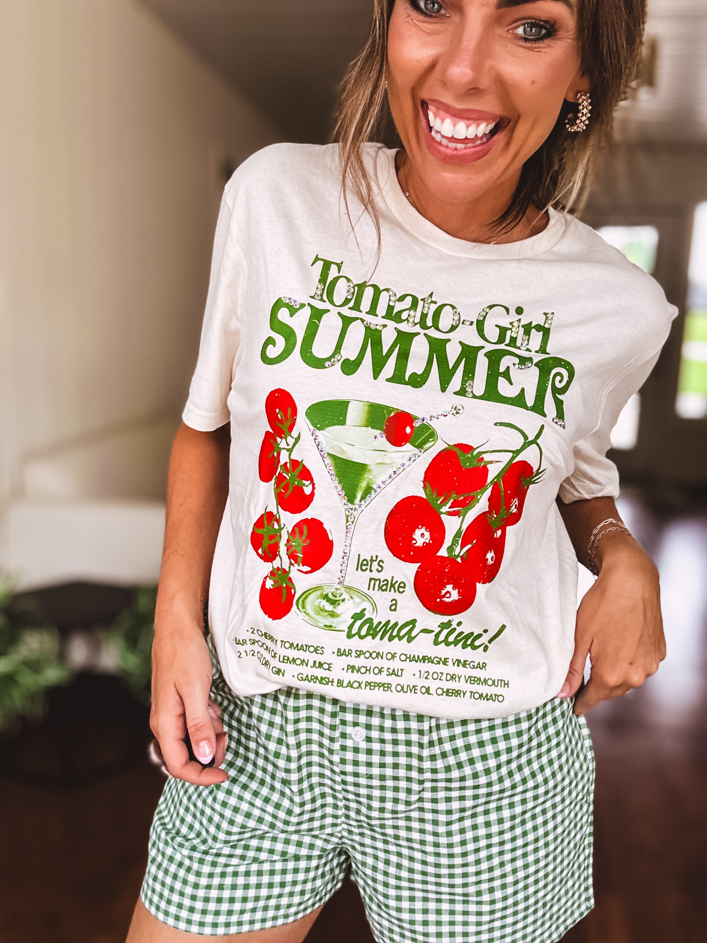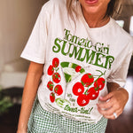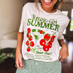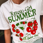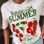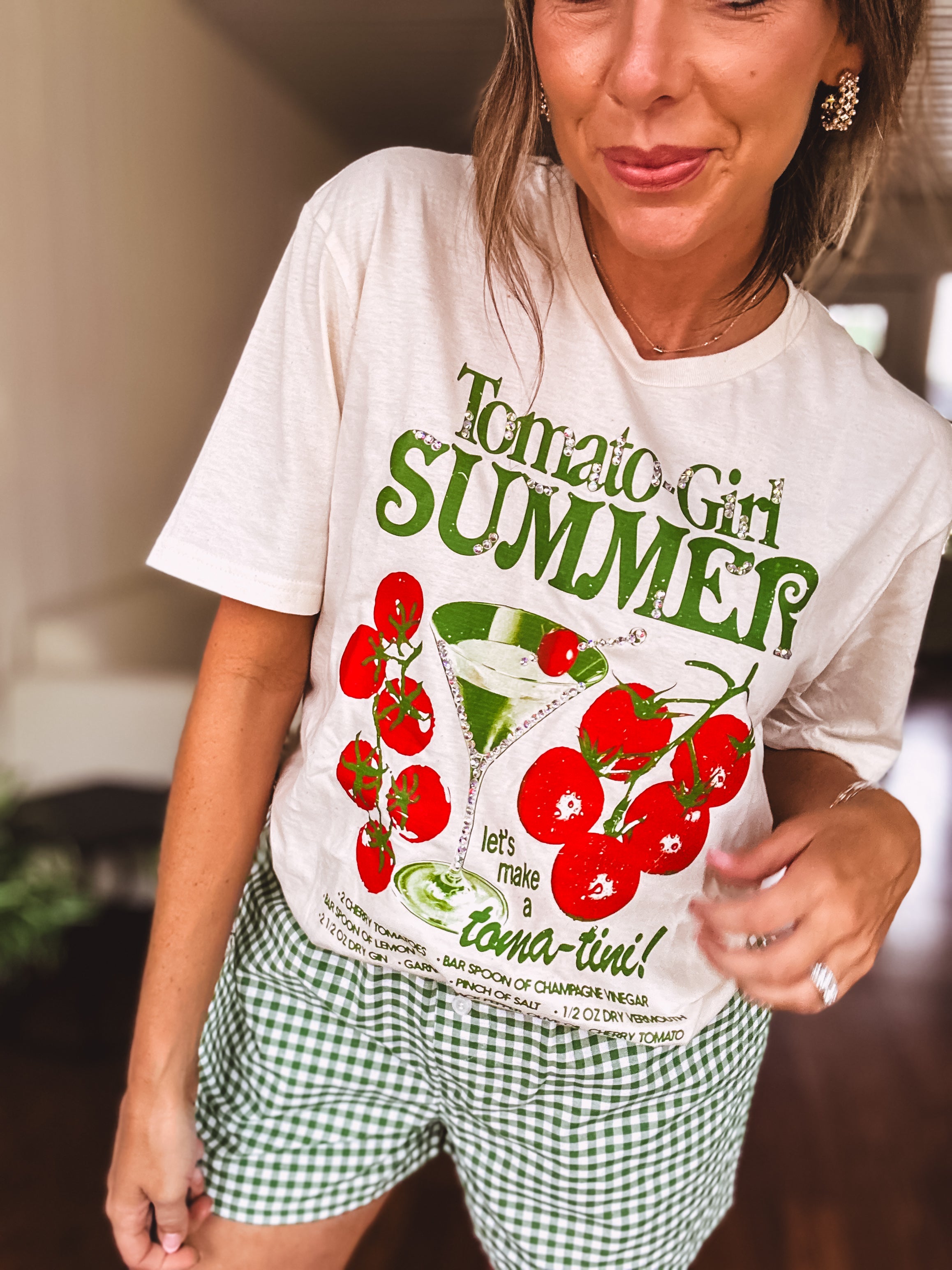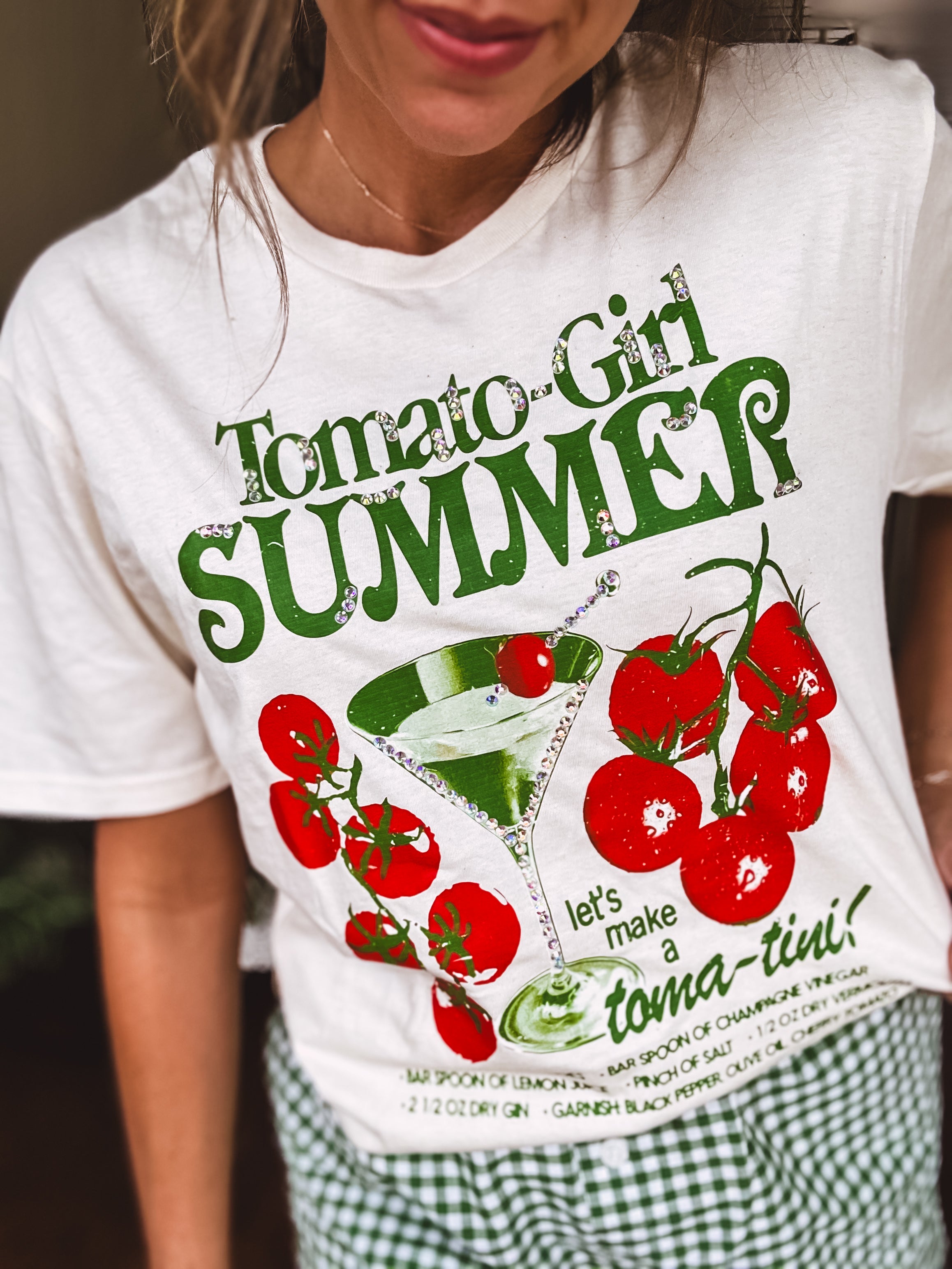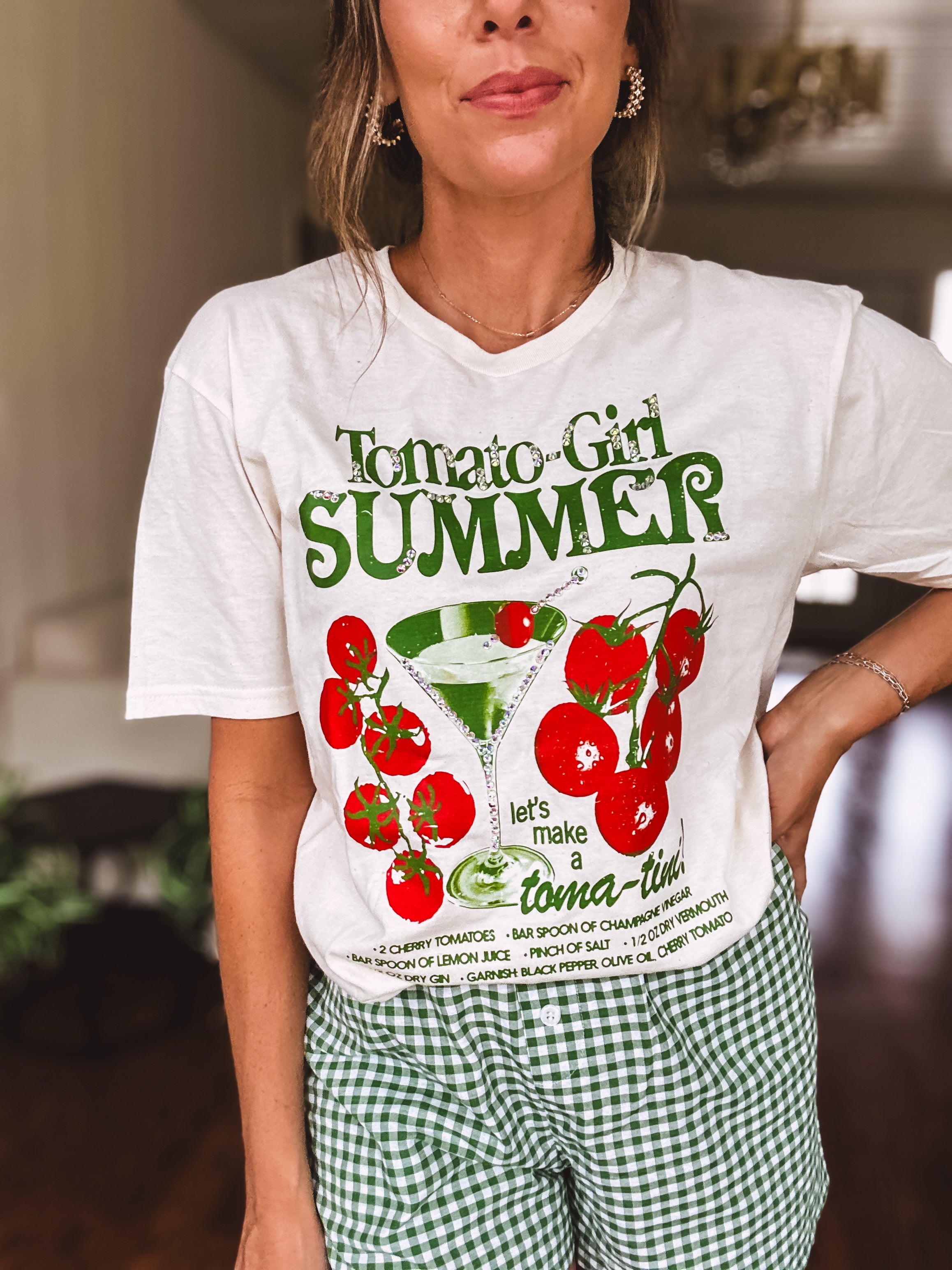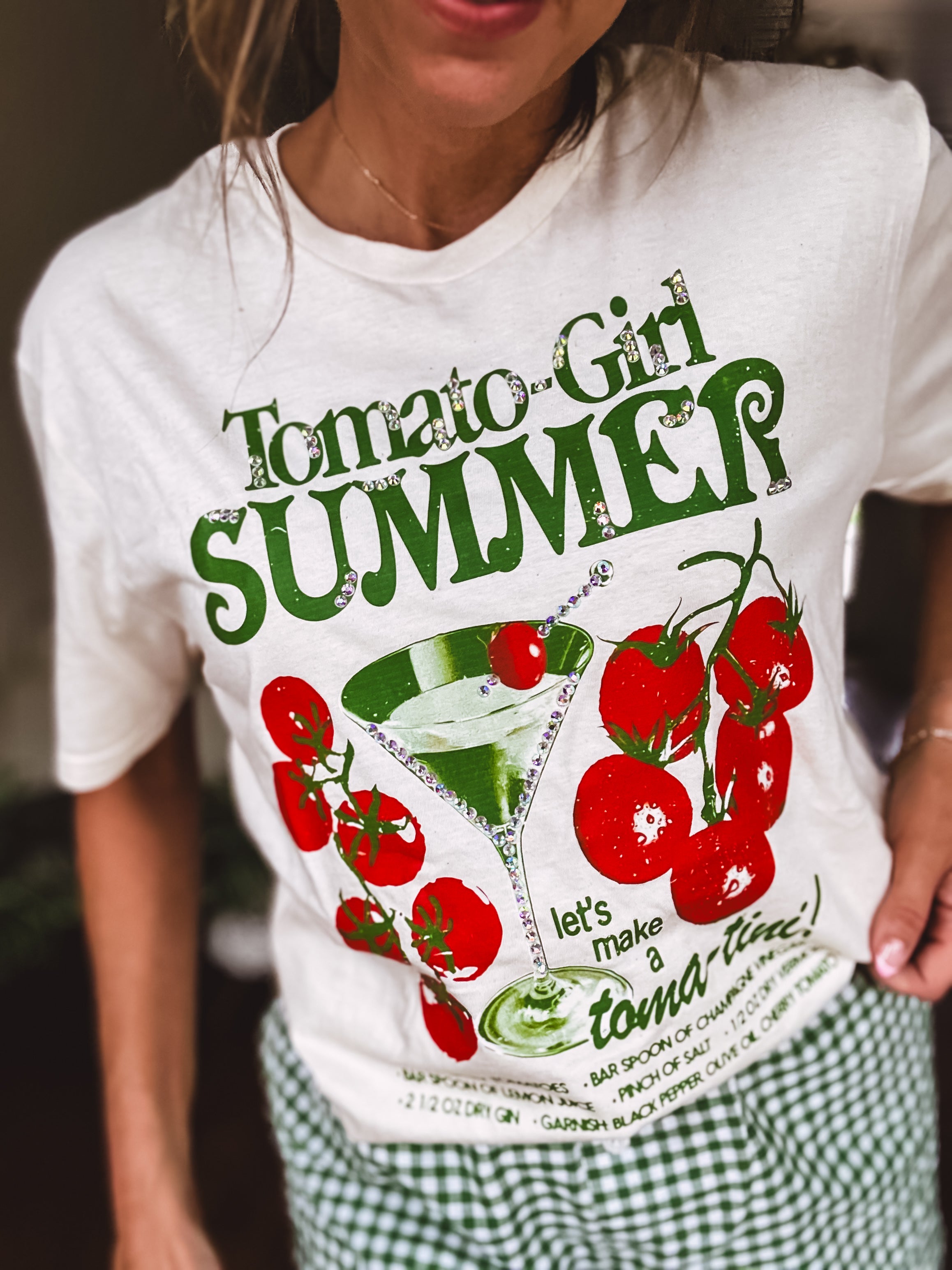 This playful tee features a vibrant avocado green and tomato red design set against a creamy vanilla bean backdrop. Sparkling rhinestones highlight the "Tomato Girl Summer" text and martini graphic, adding extra flair. Plus, it includes a tasty toma-tini recipe—making it the perfect shirt for sunny days and good times!