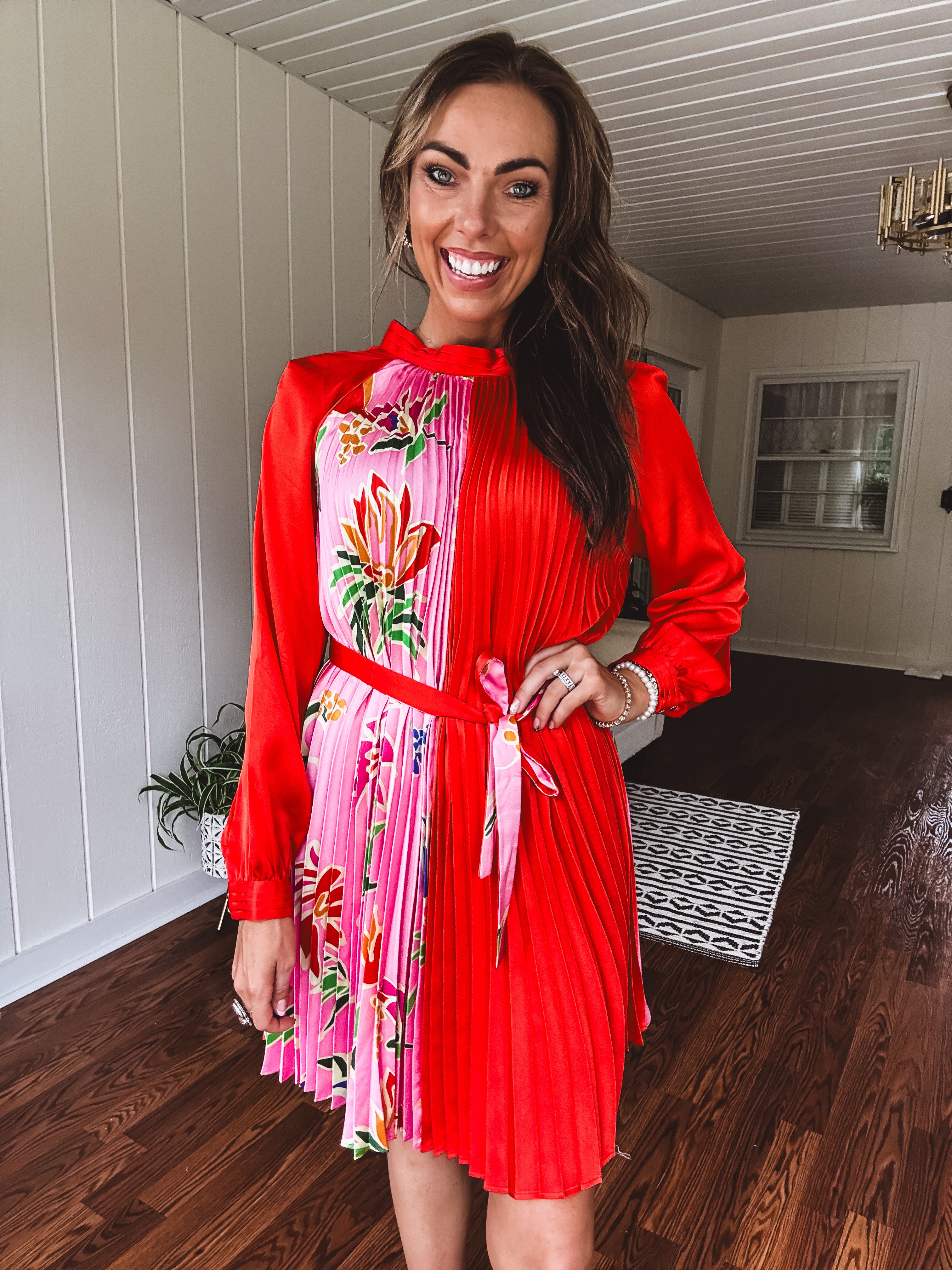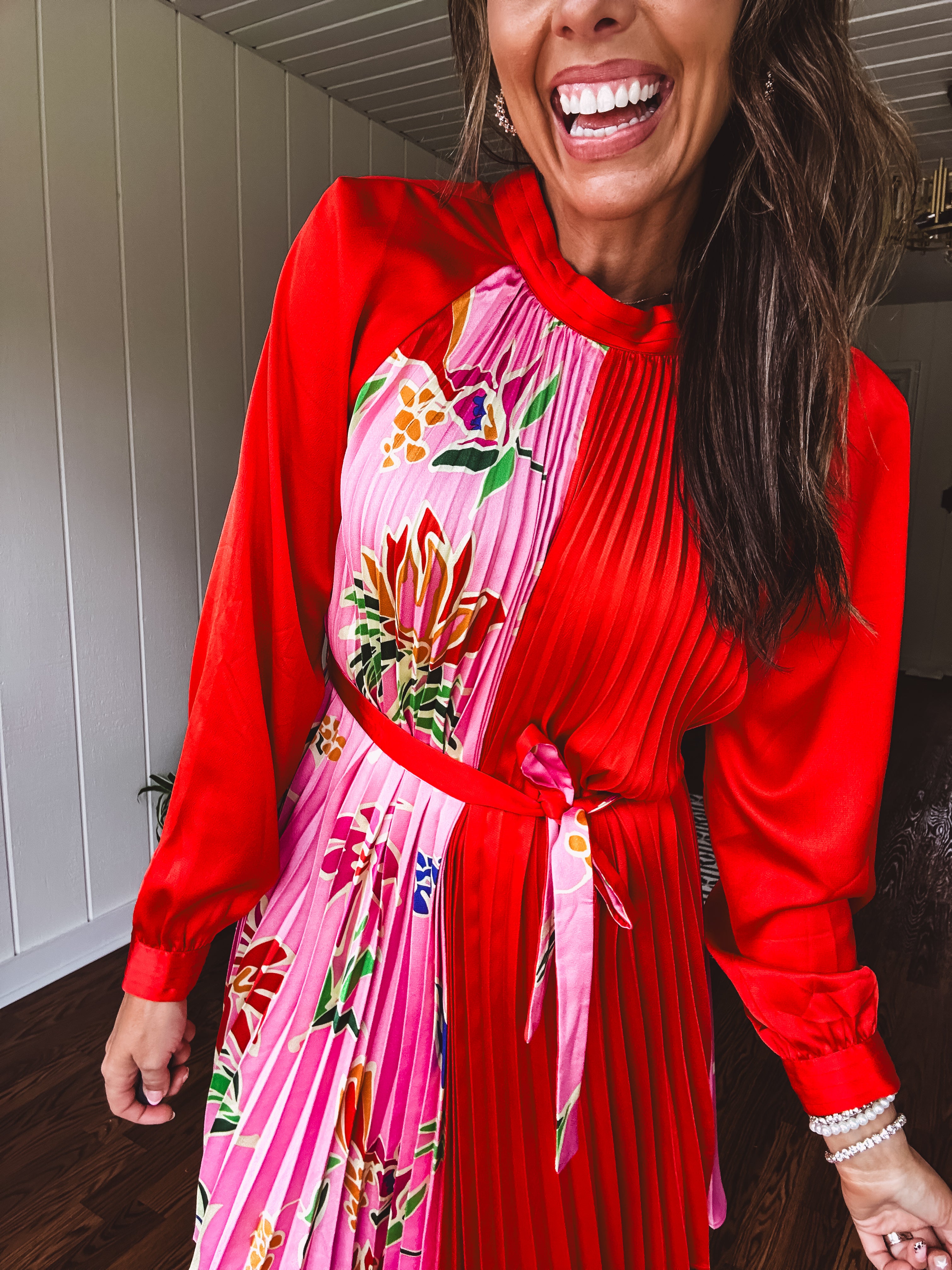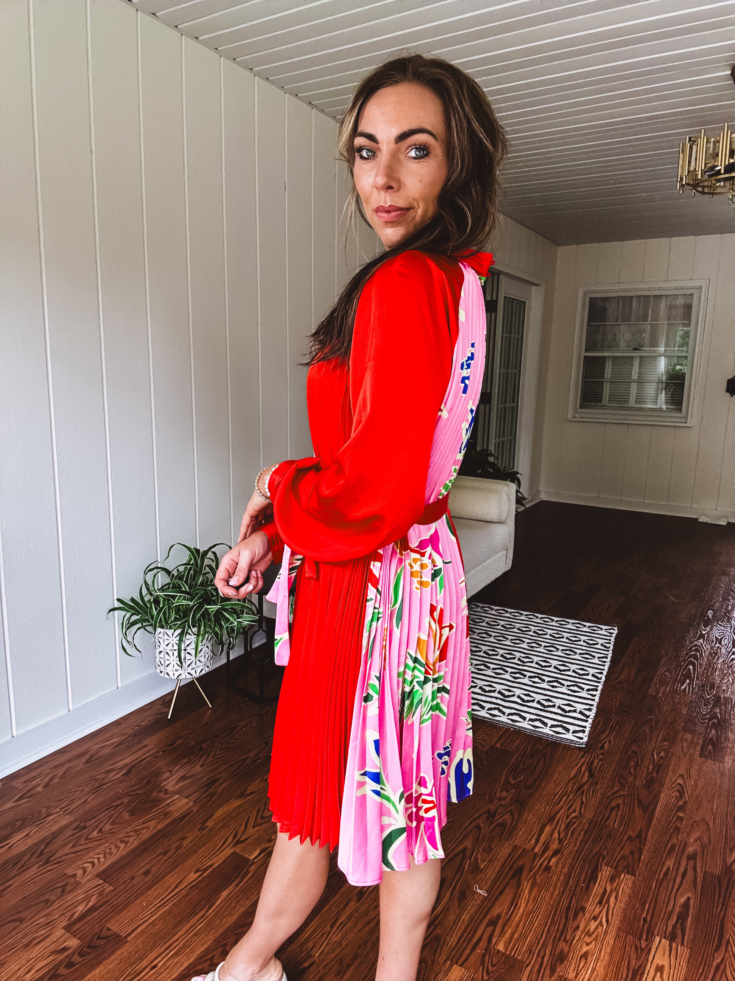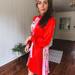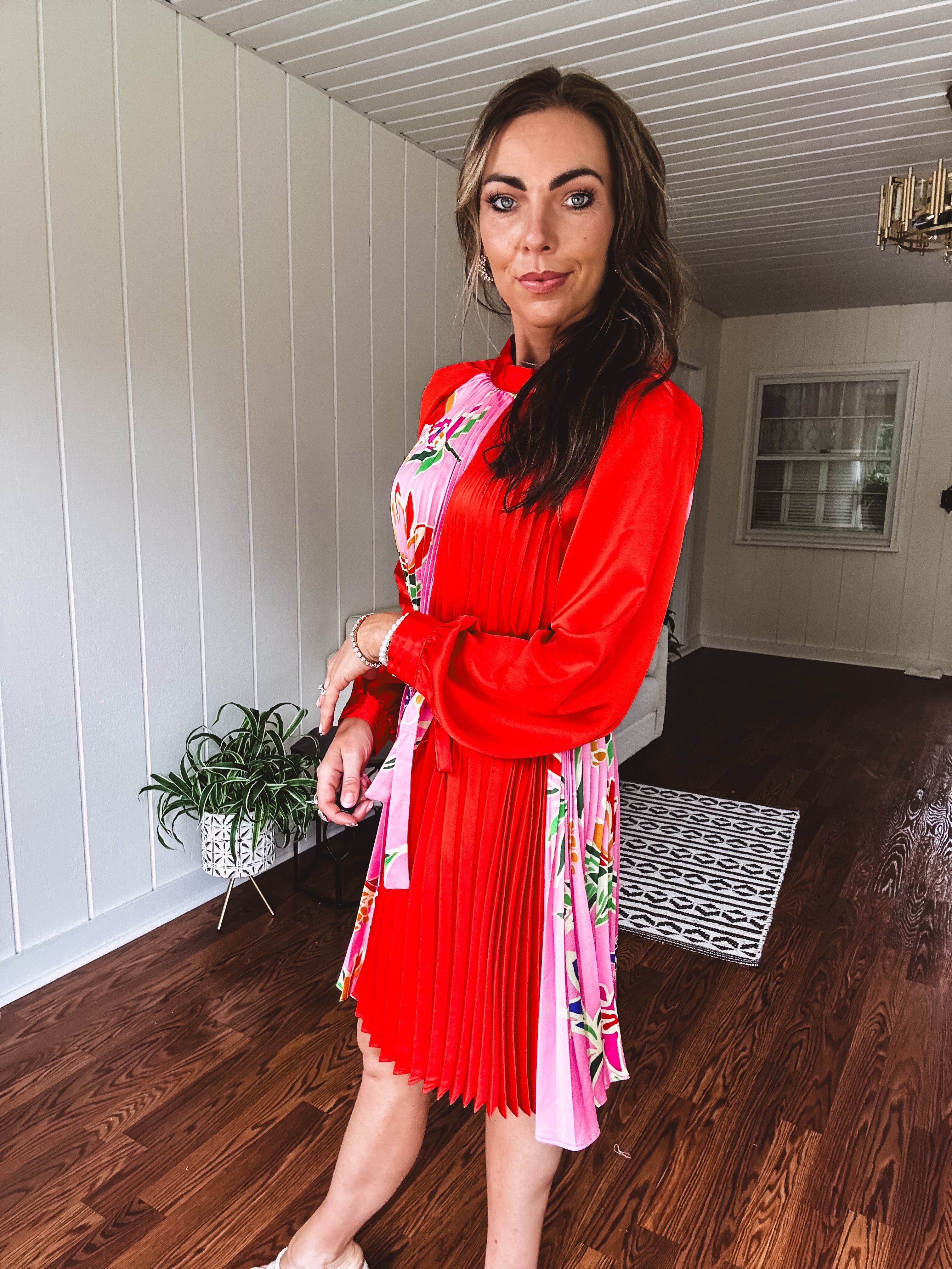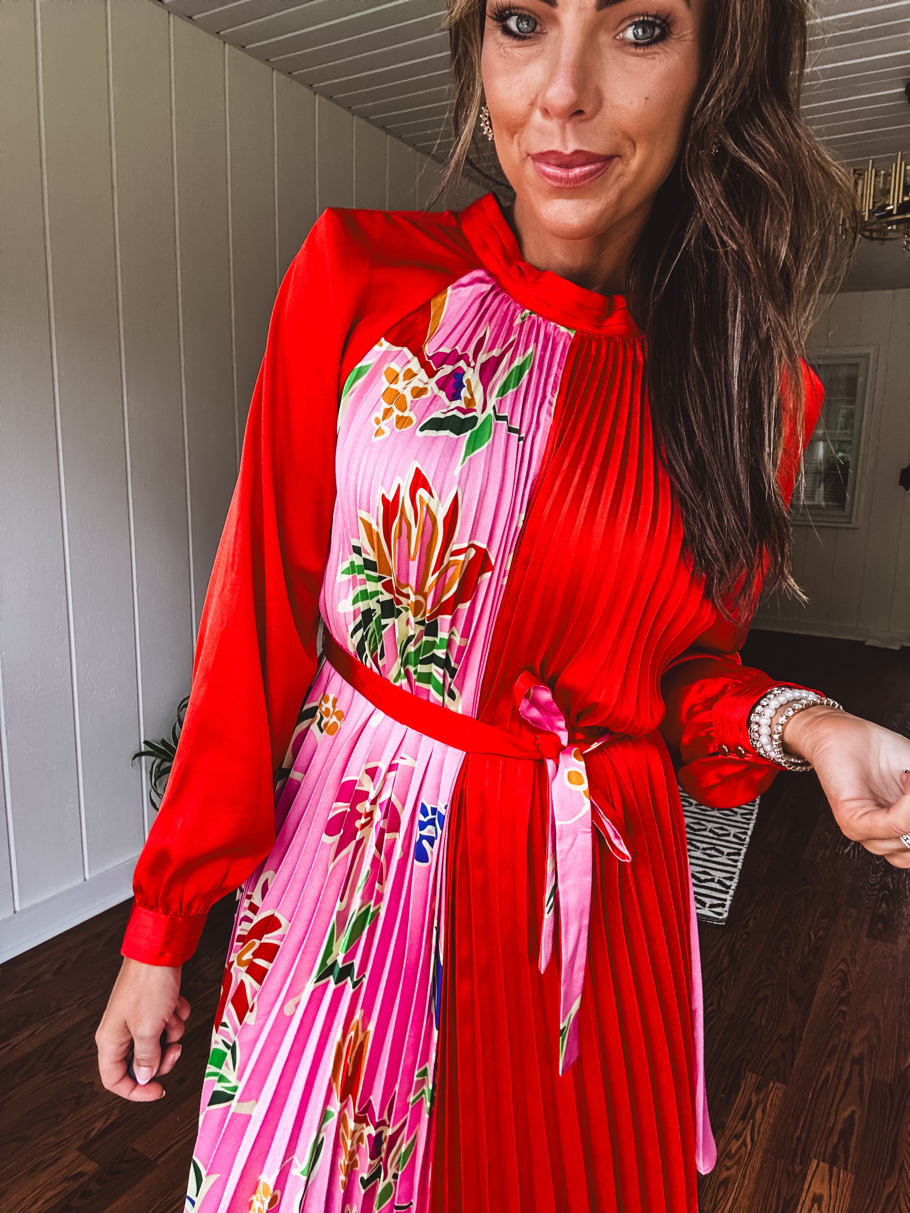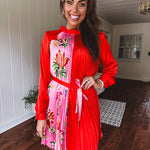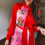 Elevate your wardrobe with this timeless accordion dress, showcasing a striking tomato red and pink floral contrast. The coordinating waist tie enhances your silhouette, while the modest length and flowing fabric ensure effortless elegance for any occasion.