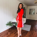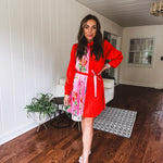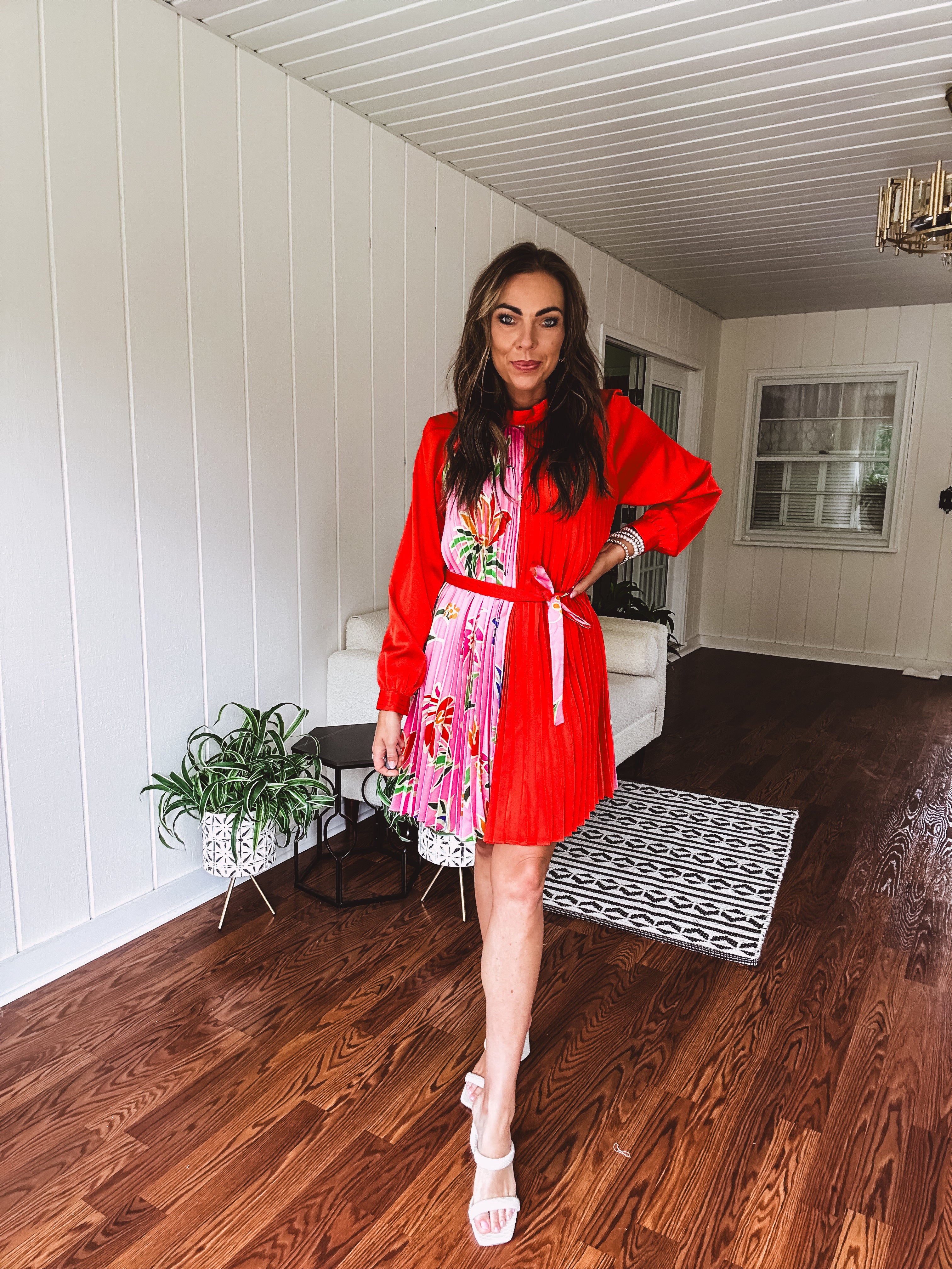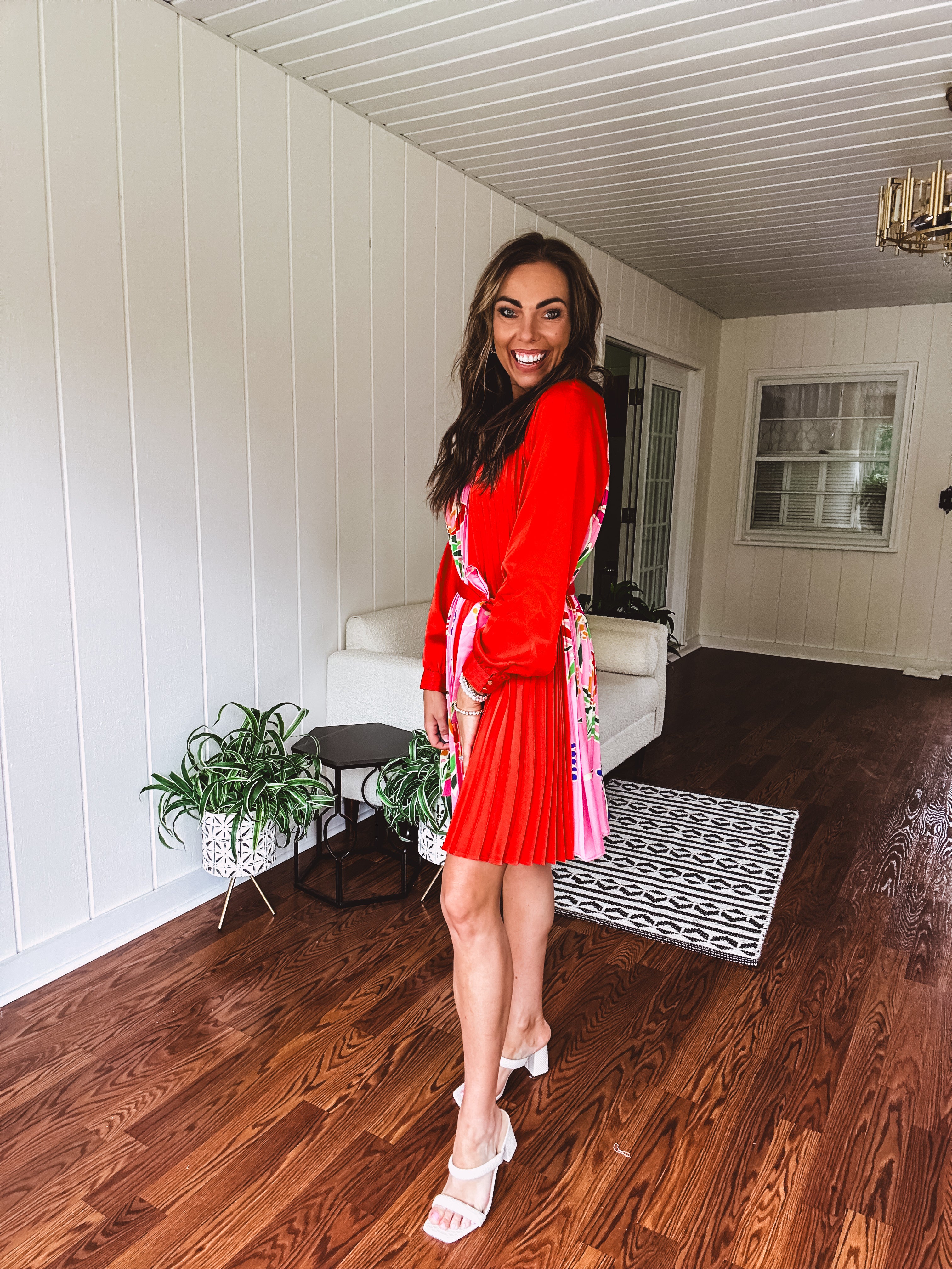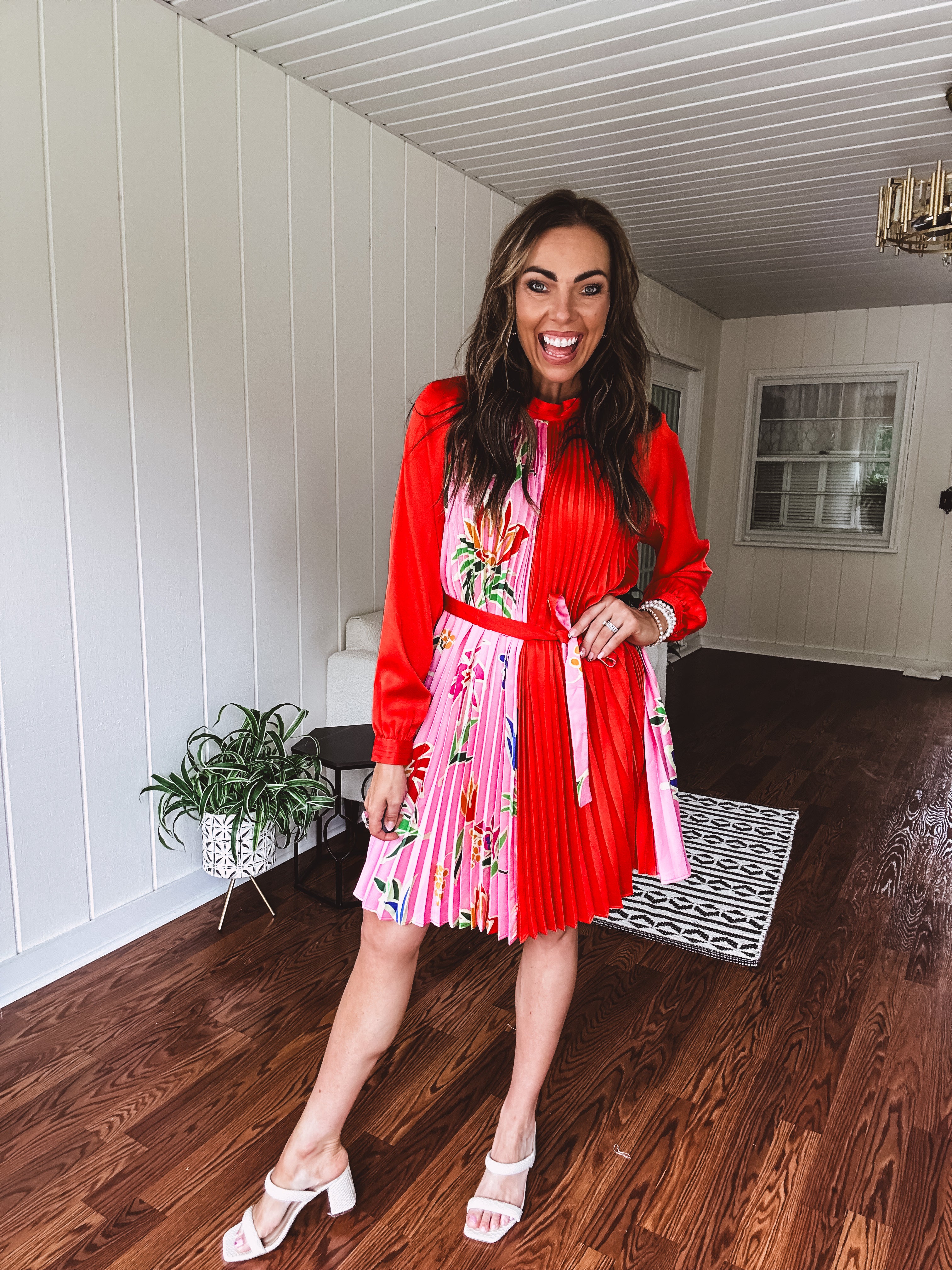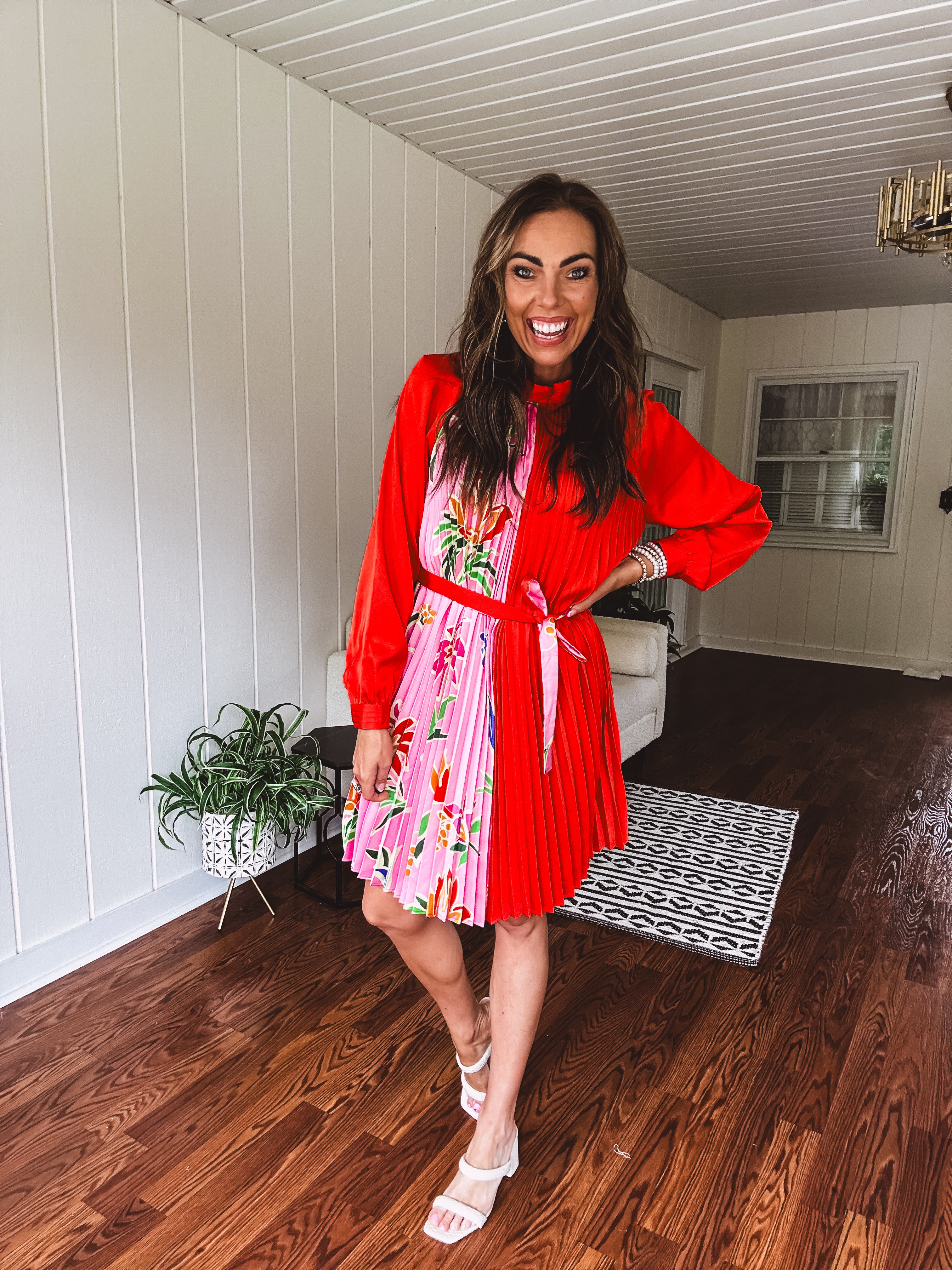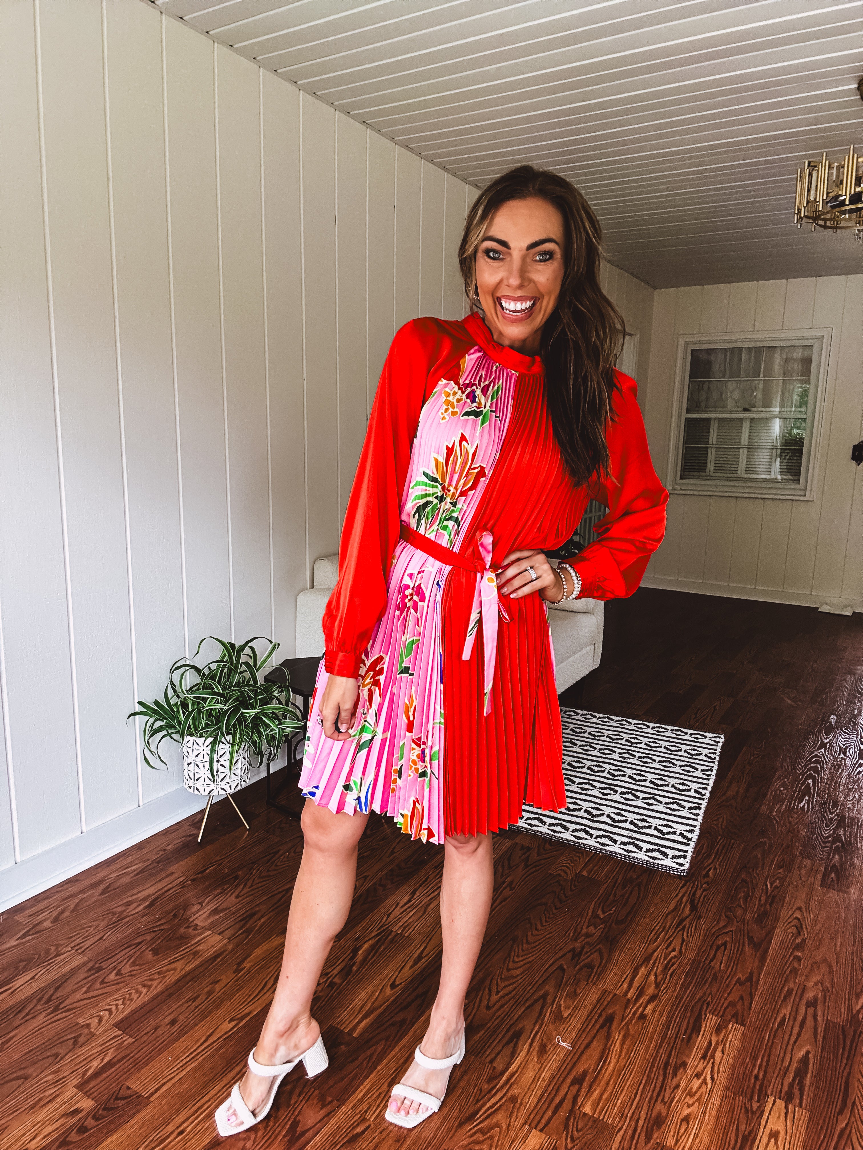 Elevate your wardrobe with this timeless accordion dress, showcasing a striking tomato red and pink floral contrast. The coordinating waist tie enhances your silhouette, while the modest length and flowing fabric ensure effortless elegance for any occasion.
