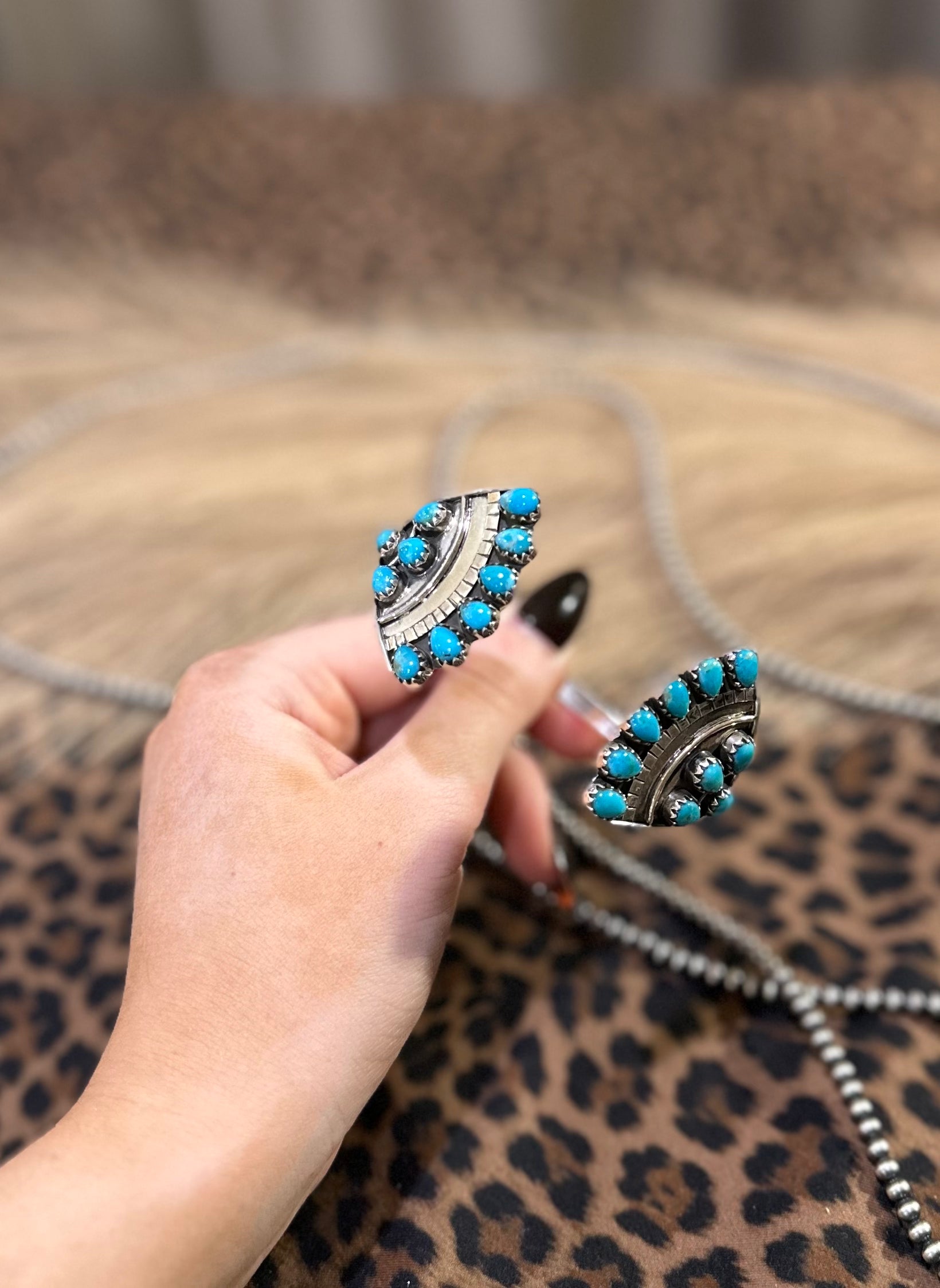 This cuff is where form and function combine in jaw-dropping design. The thin, genuine sterling silver band culminates in a double fan closure featuring authentic Kingman turquoise stones and intricate etching detail. This piece is sure to turn heads.