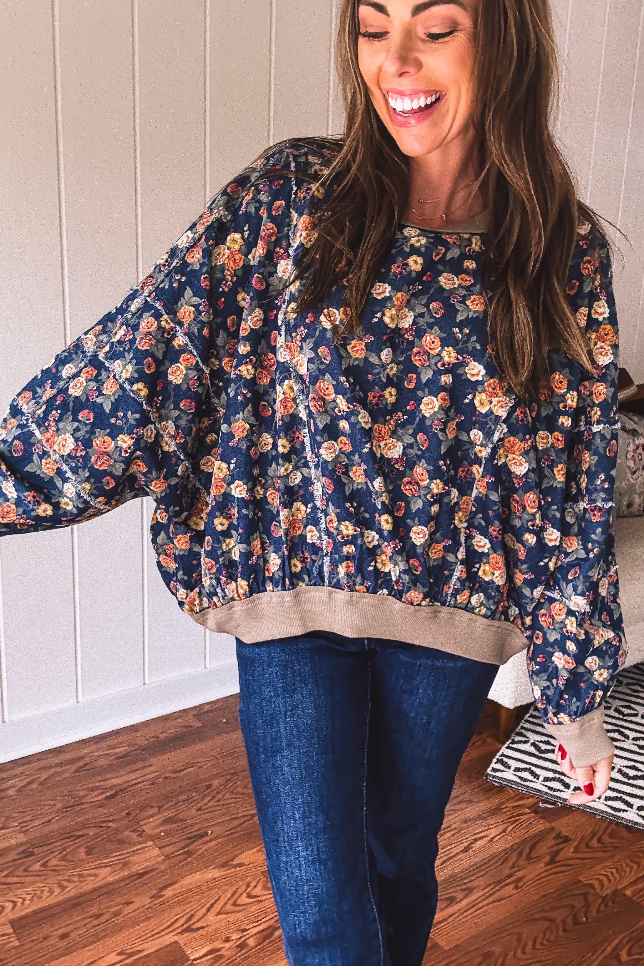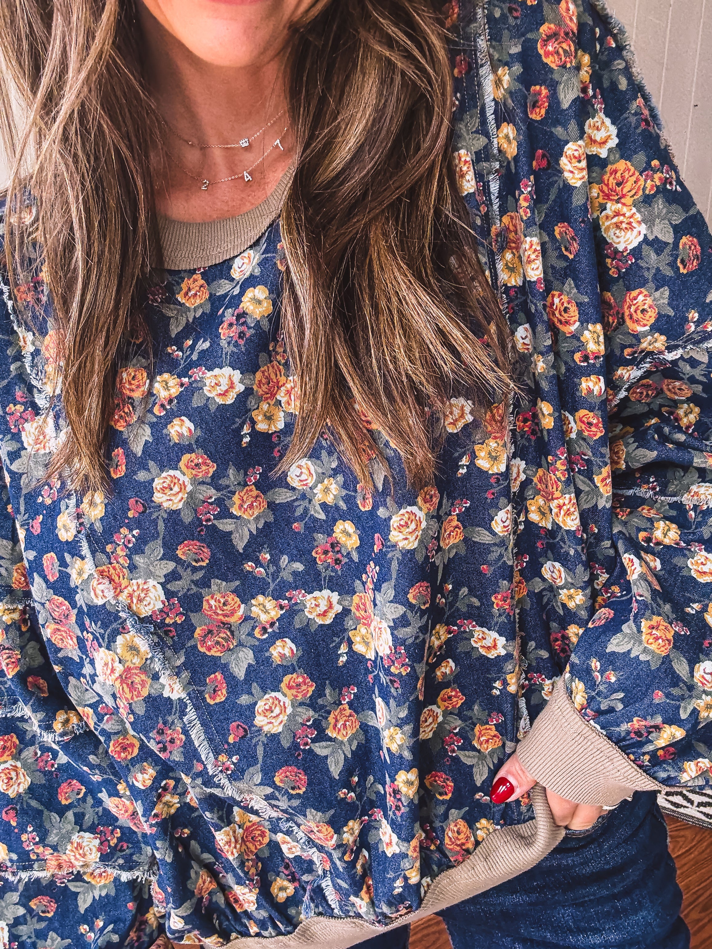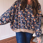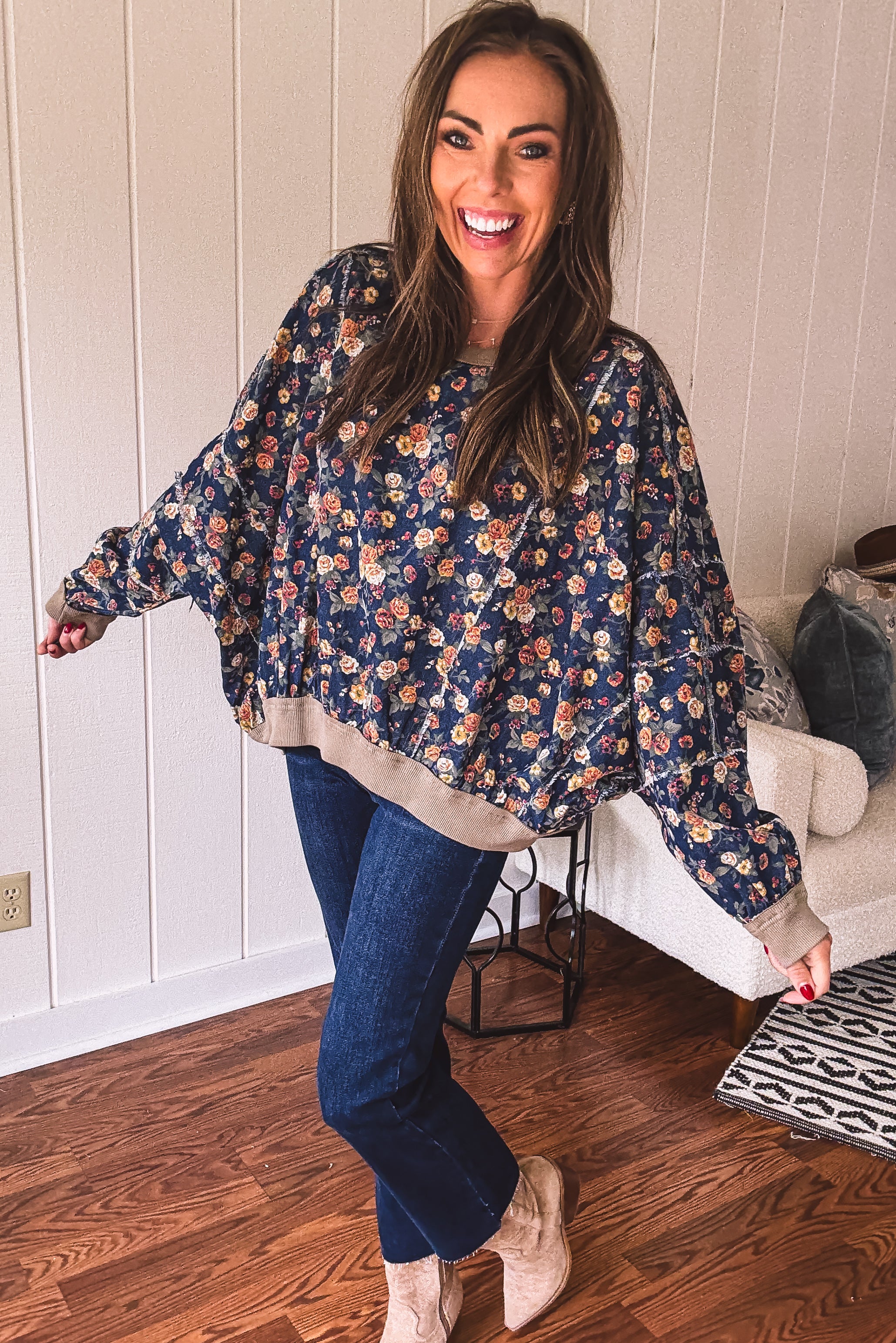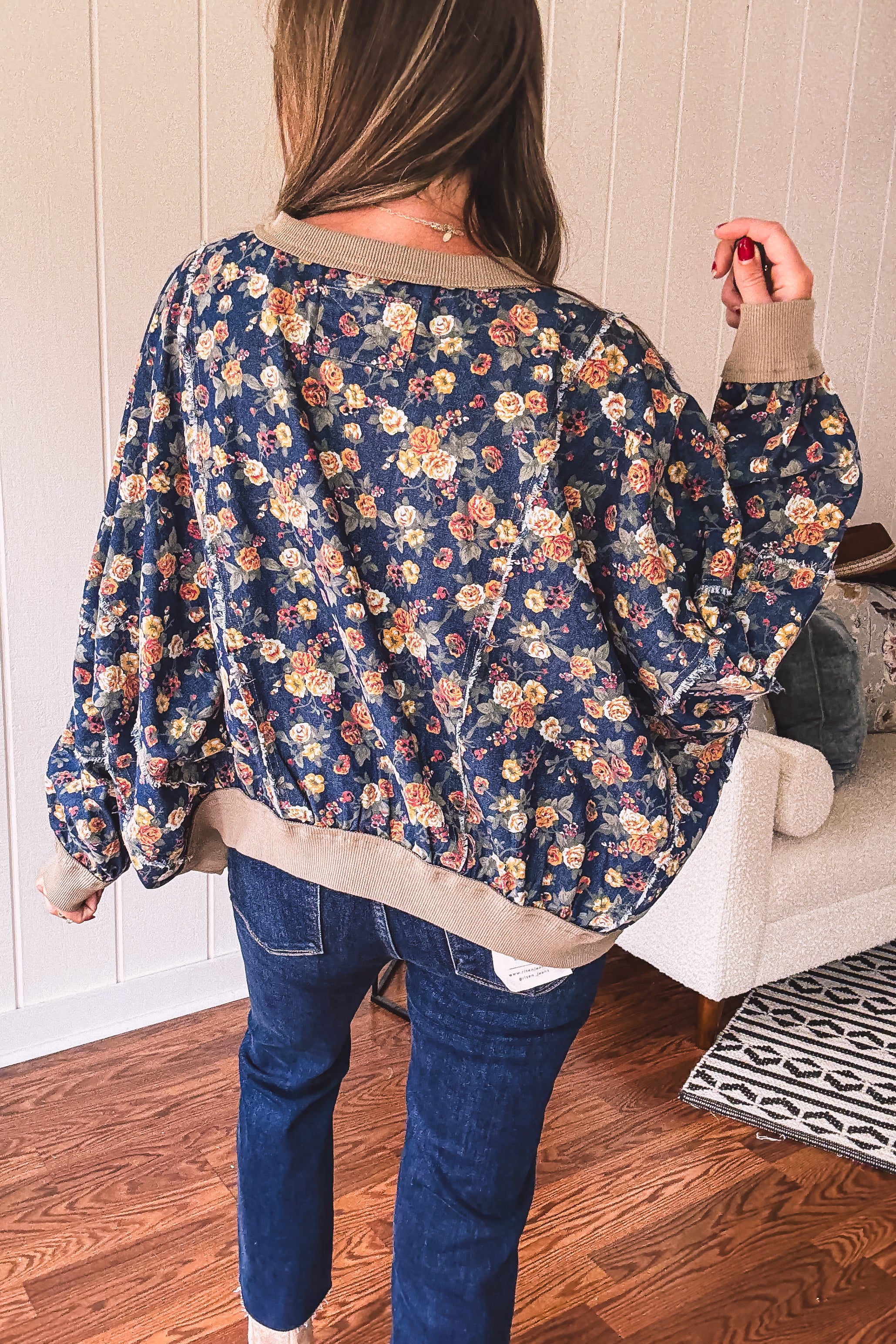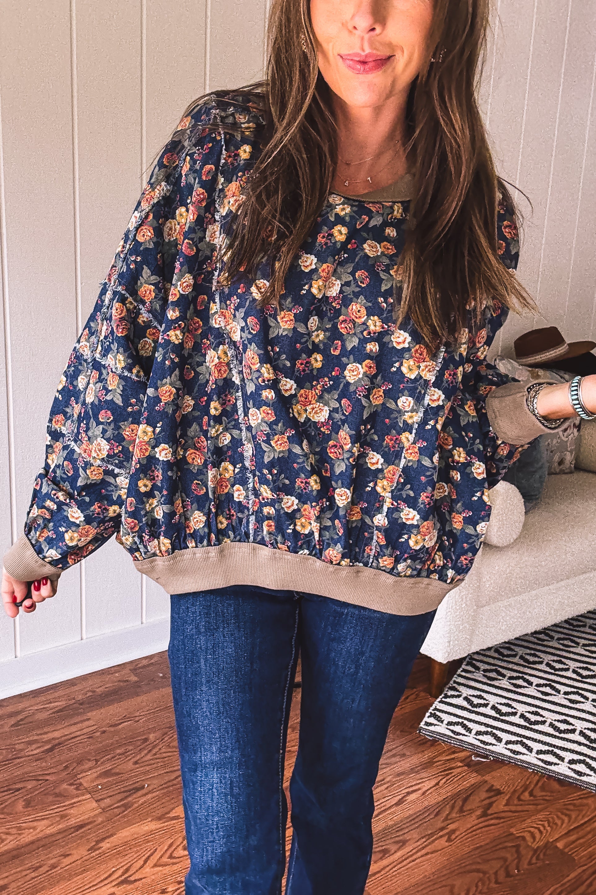 This delightful Vintage Floral Round Hem Dolman Crew brings a charming twist with its light denim fabric decorated in cream, rust, and mustard florals. Featuring raw seams and contrasting taupe trims on the hem, neckline, and cuffs, its dolman sleeves and roomy fit make it irresistibly cozy and stylish. Pair it with shorts, jeans, or our terry knit pants for an effortlessly fun and comfy look you'll love to wear everywhere.