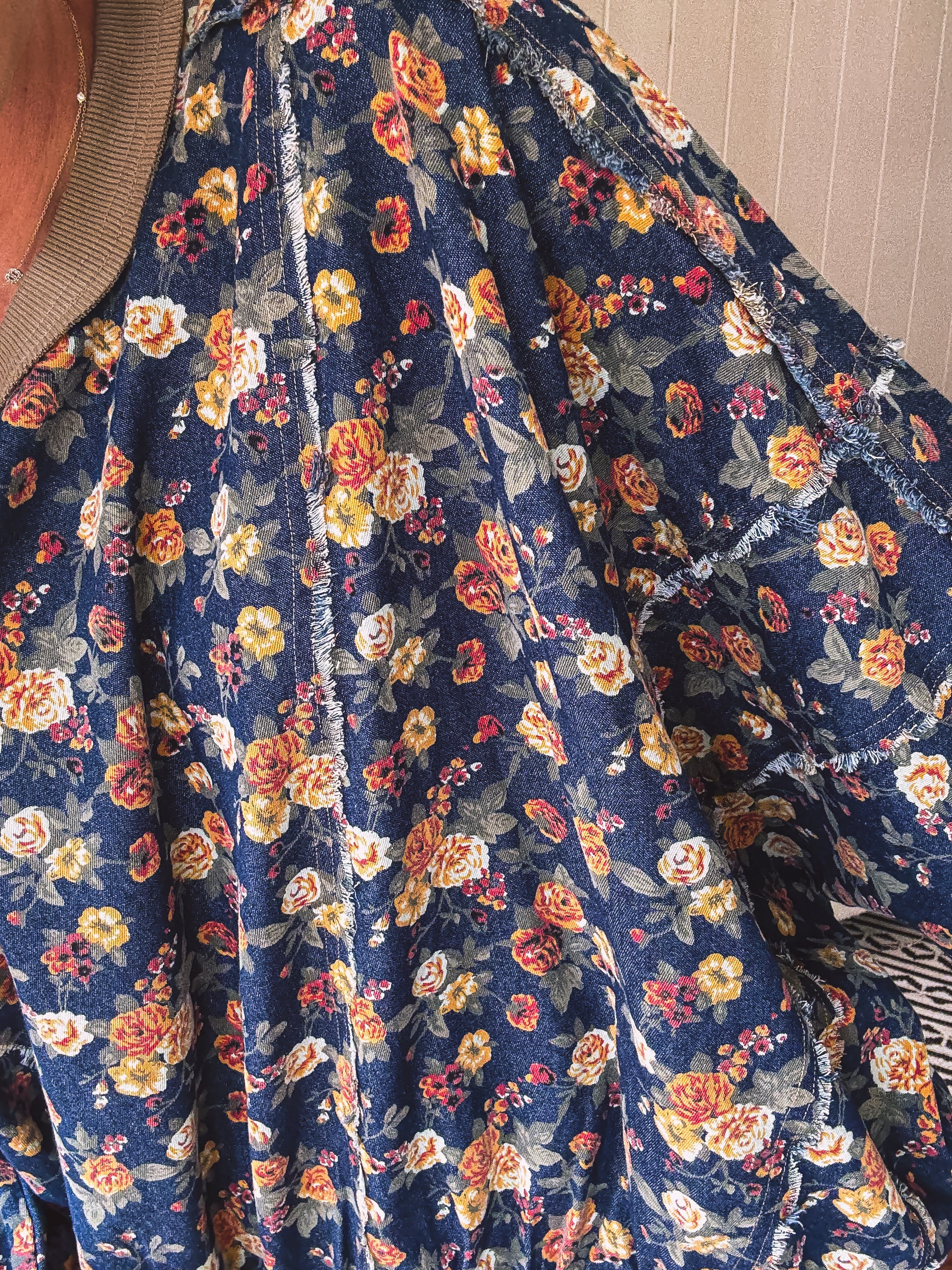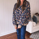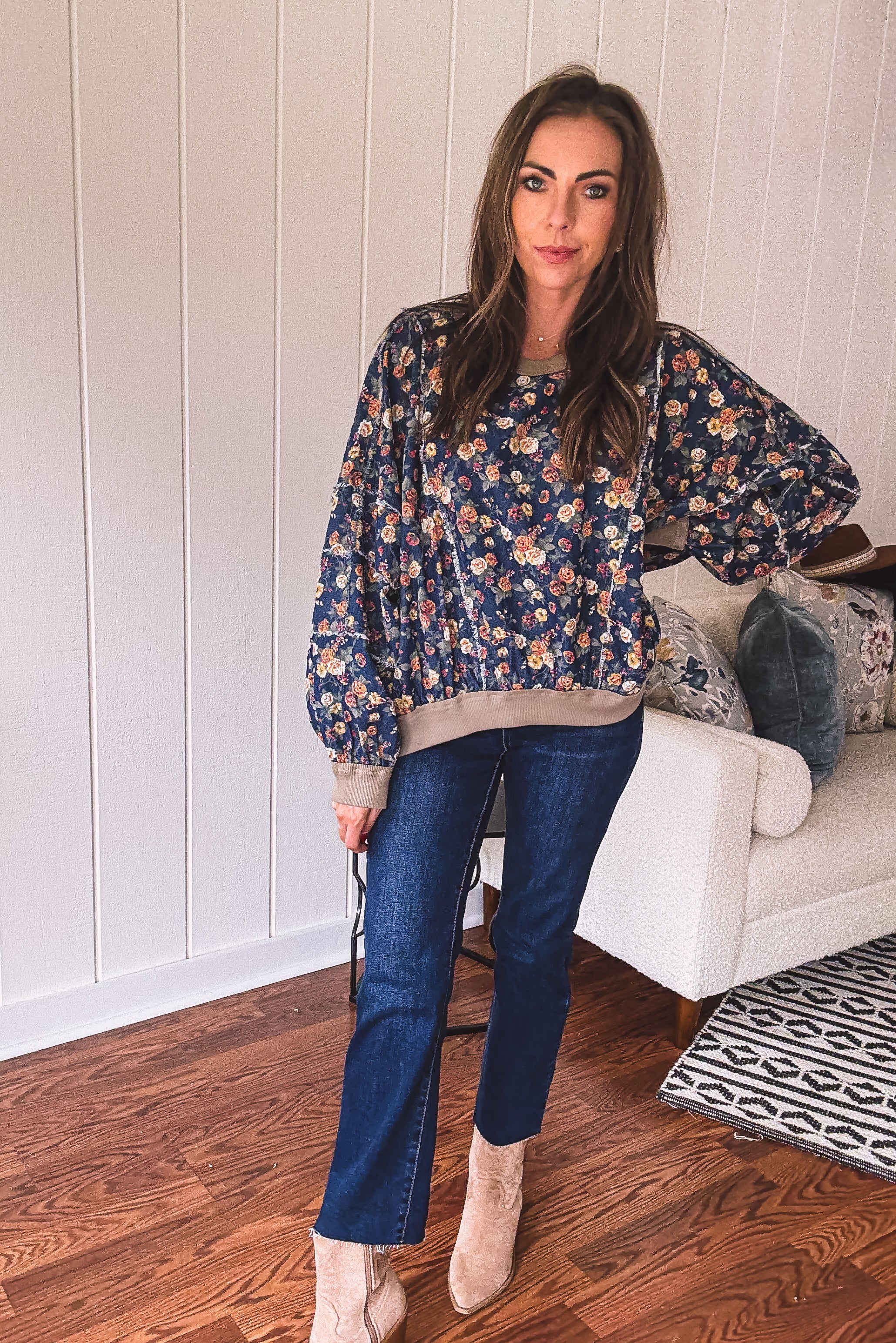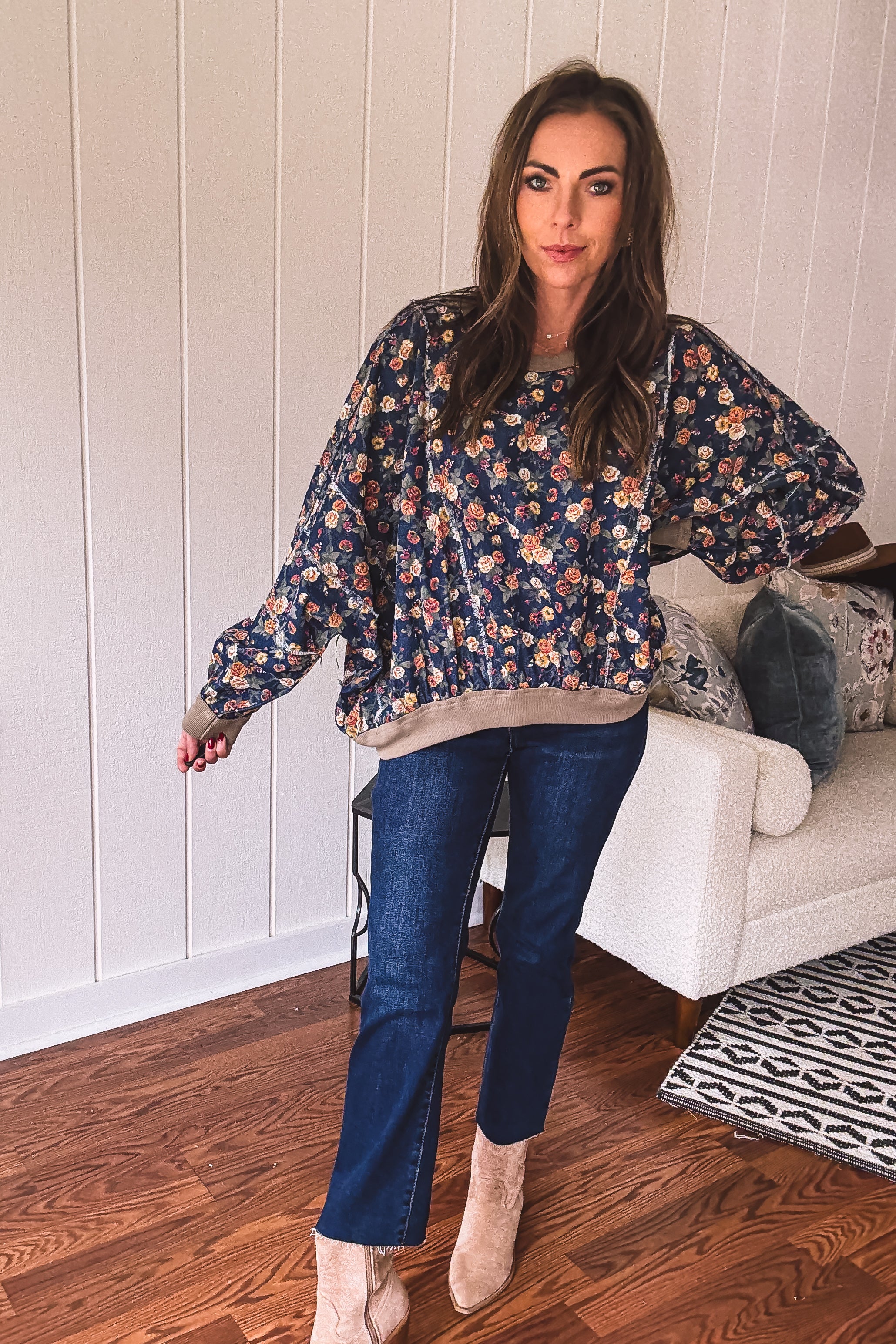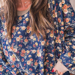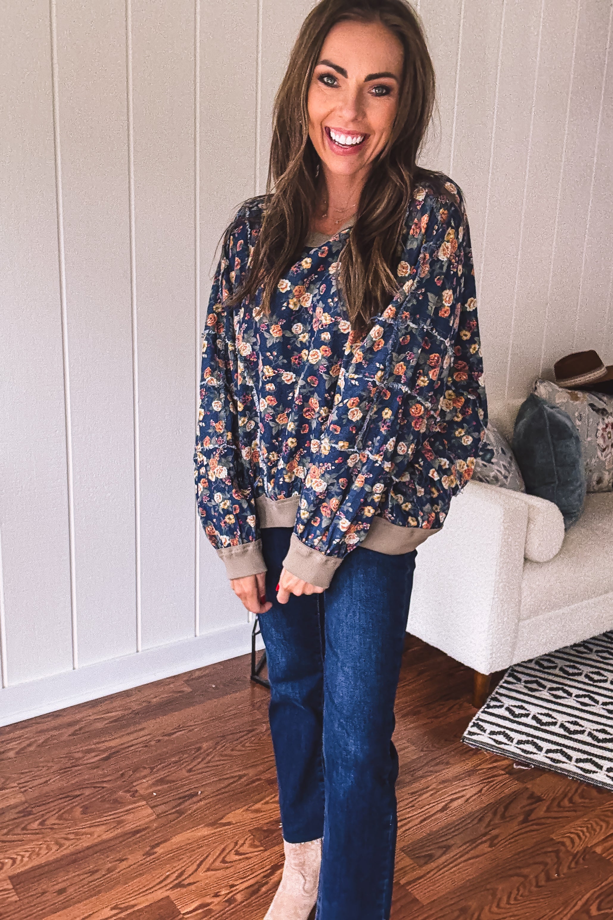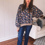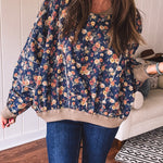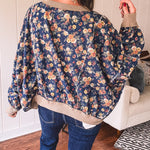 This delightful Vintage Floral Round Hem Dolman Crew brings a charming twist with its light denim fabric decorated in cream, rust, and mustard florals. Featuring raw seams and contrasting taupe trims on the hem, neckline, and cuffs, its dolman sleeves and roomy fit make it irresistibly cozy and stylish. Pair it with shorts, jeans, or our terry knit pants for an effortlessly fun and comfy look you'll love to wear everywhere.