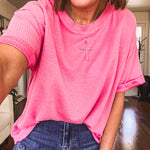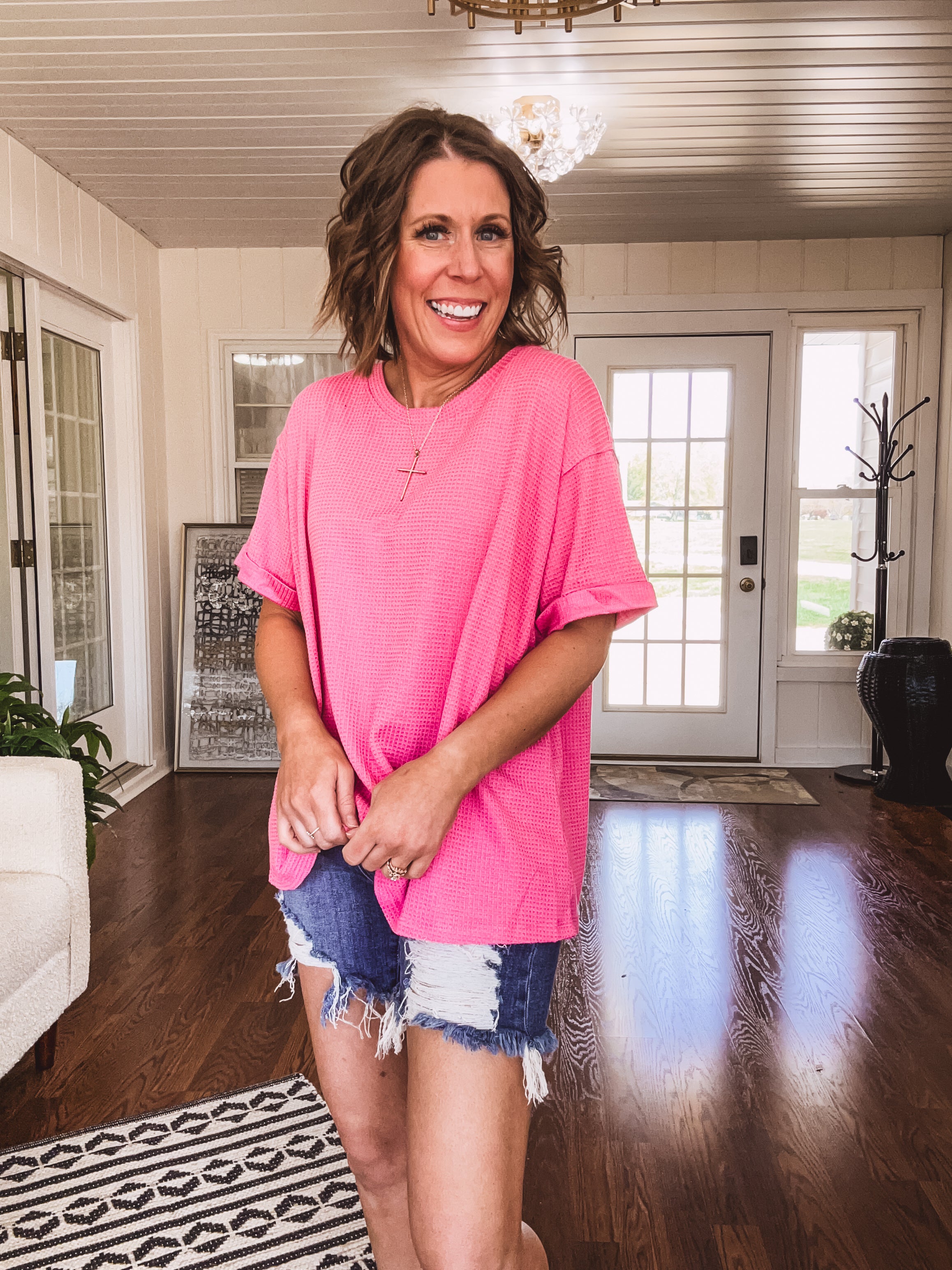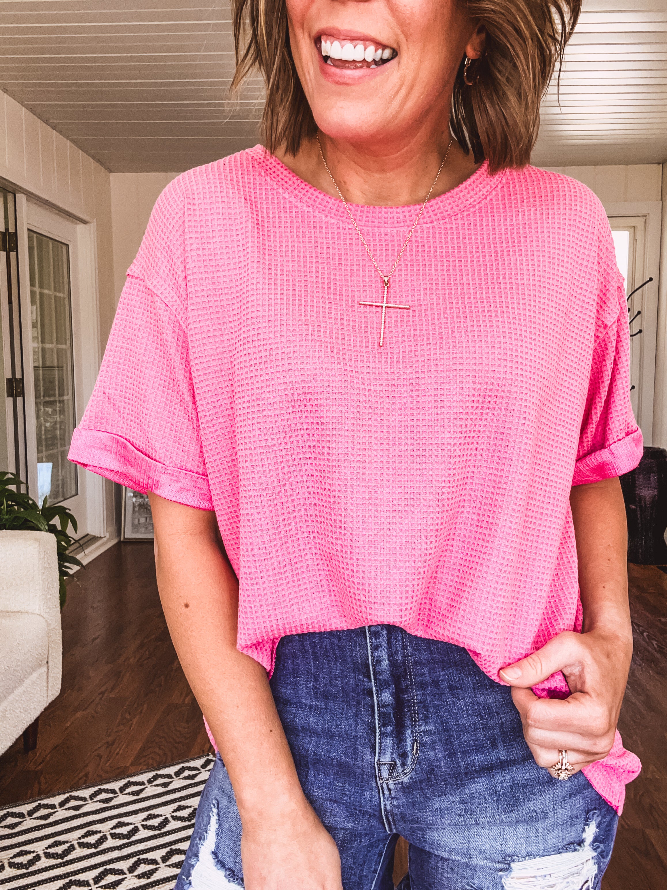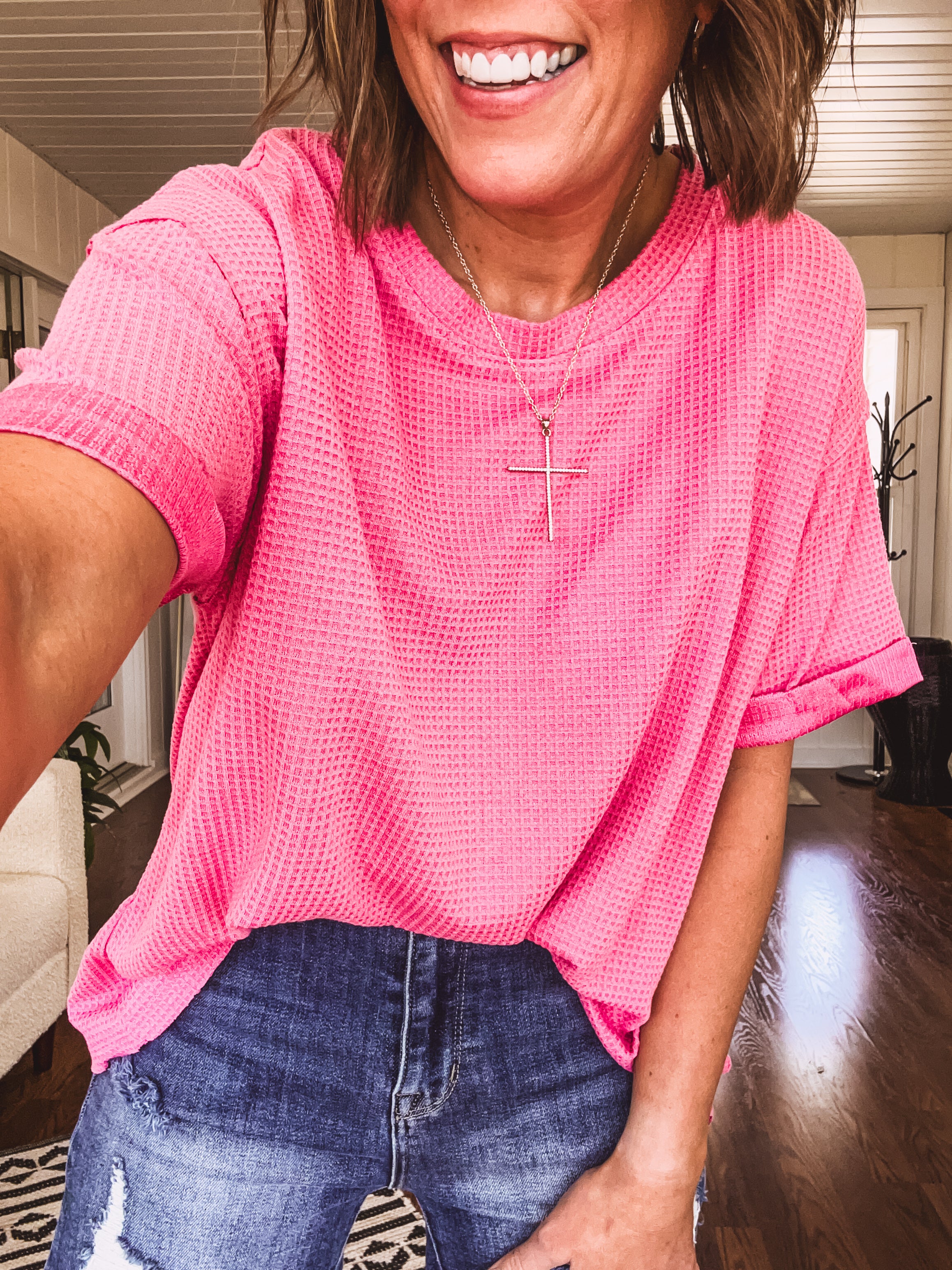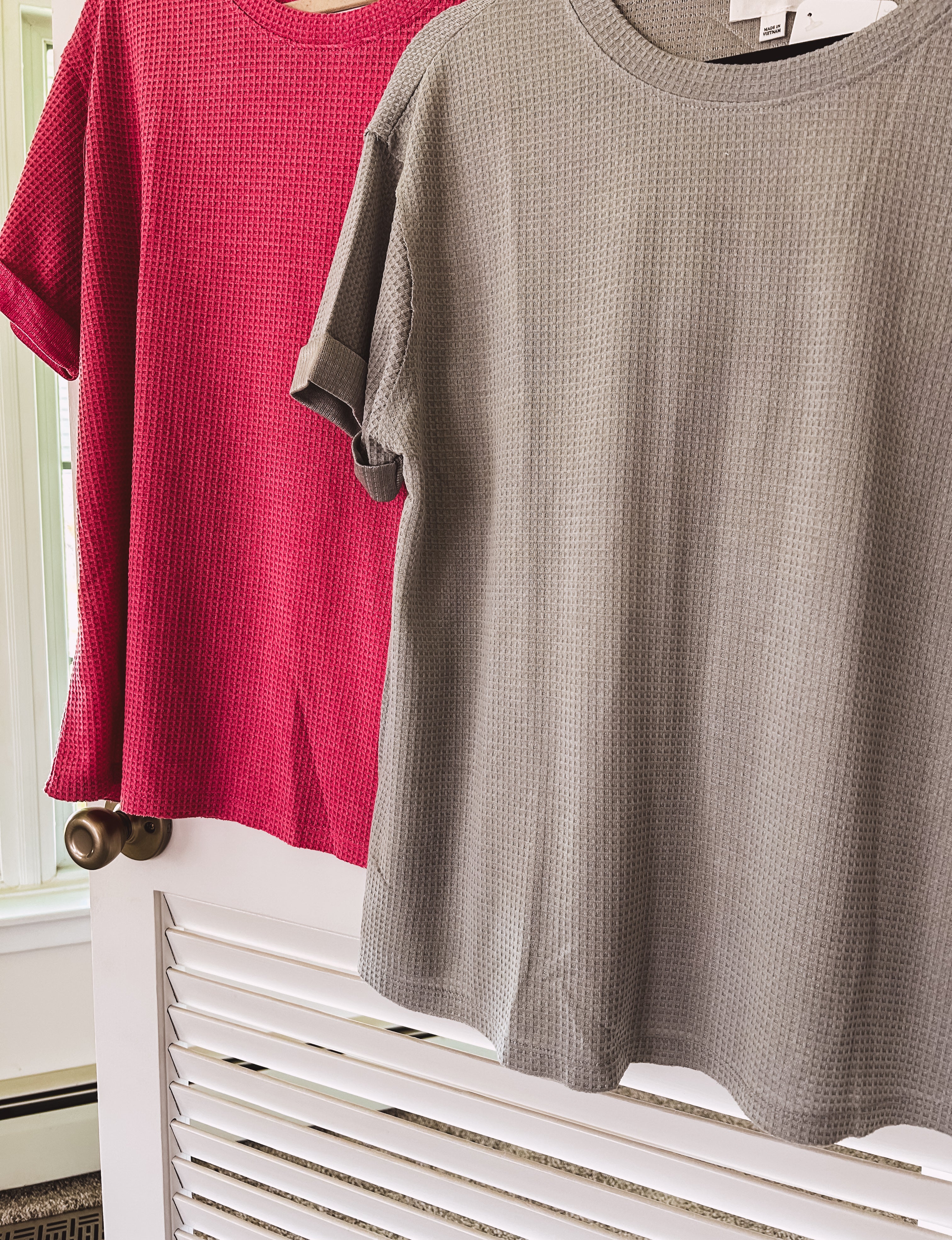Add some spice to your wardrobe with this Waffle Lightweight Short Sleeve Pullover. Its unique texture and classic style will elevate any outfit. With its relaxed, flowy fit and rolled-up sleeves, this tee is perfect for your summer wardrobe. Don't forget to snag one in every color!