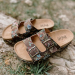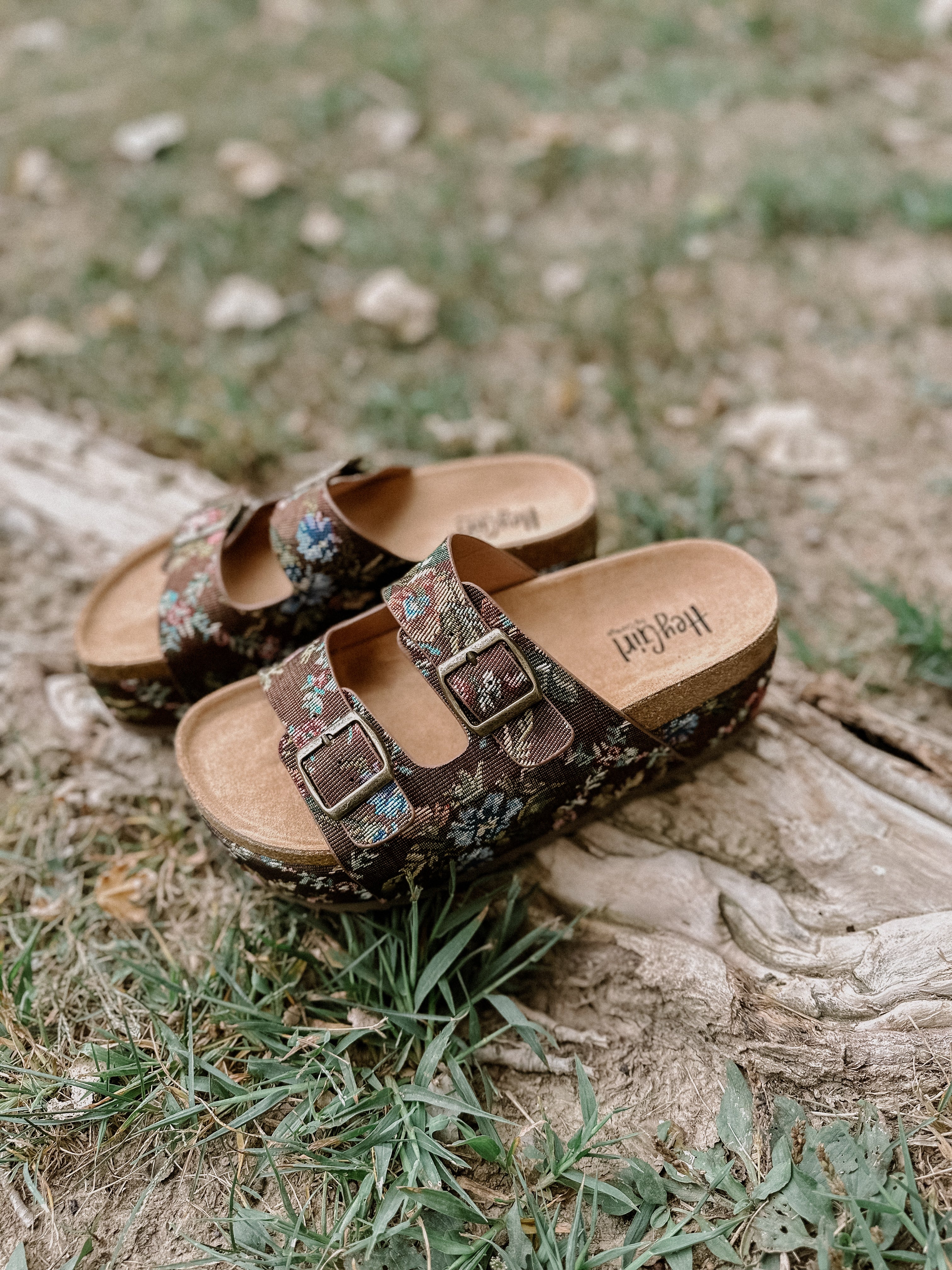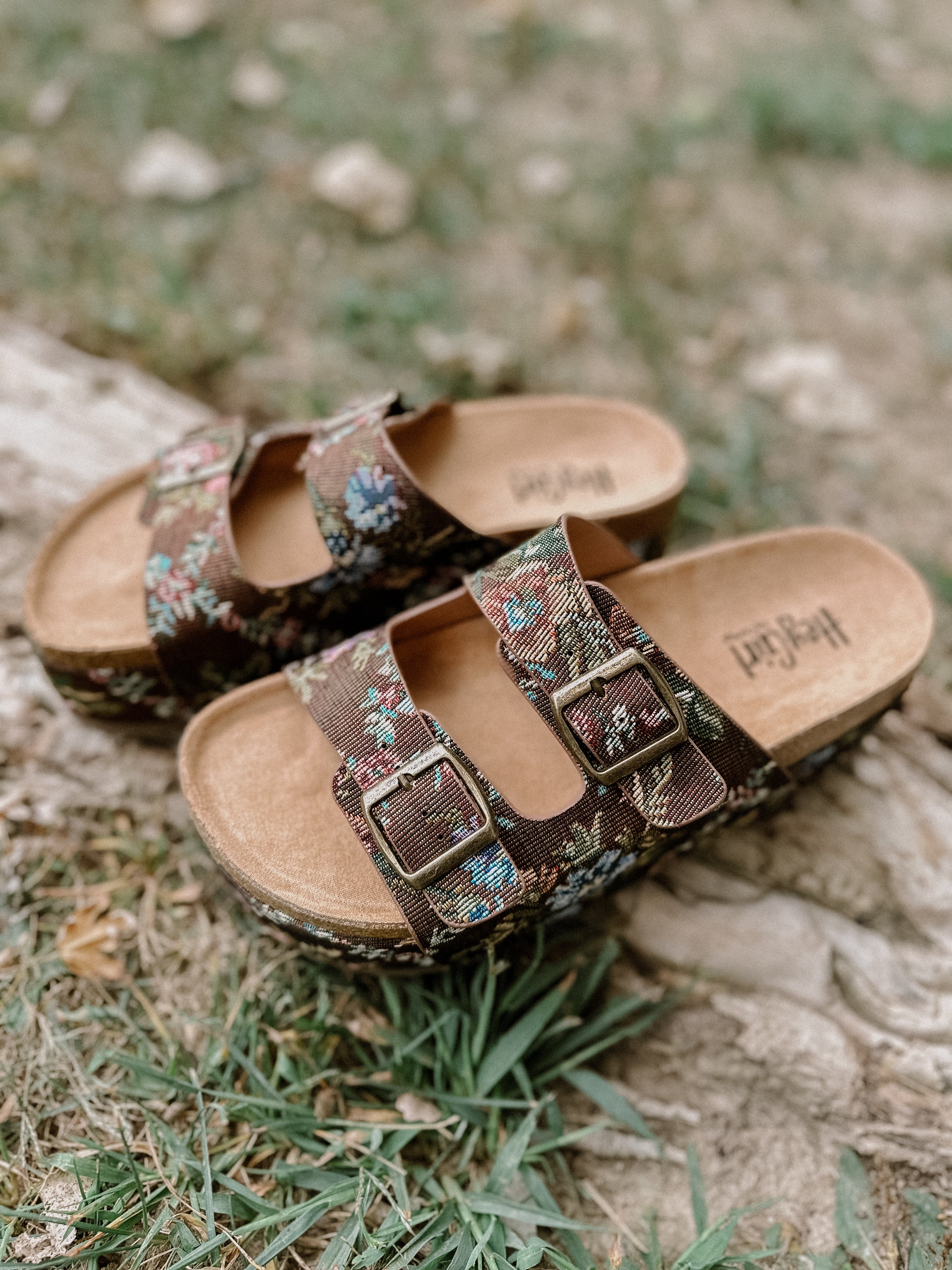 Elevate your fashion game with these platform sandals! The double buckle top, adorned with an embroidered, floral patterned fabric on a rust background, adds a unique touch that will surely catch attention. These shoes are perfect for summer, but also make a seamless transition into fall. Get ready to make a statement!