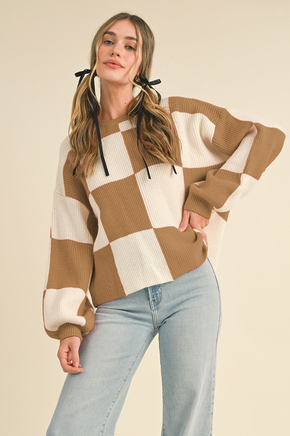 Warm Sand + Cream Checker Balloon Sweater