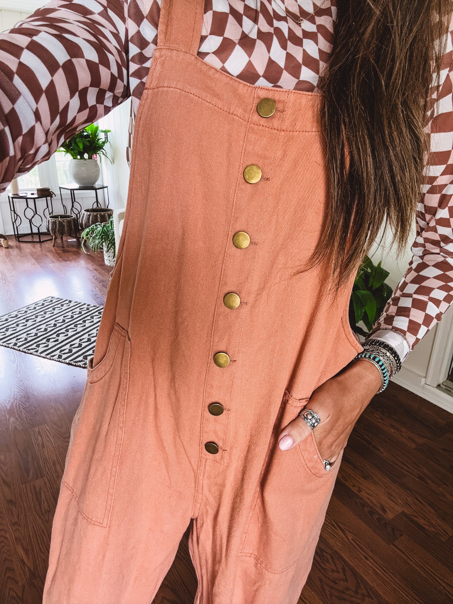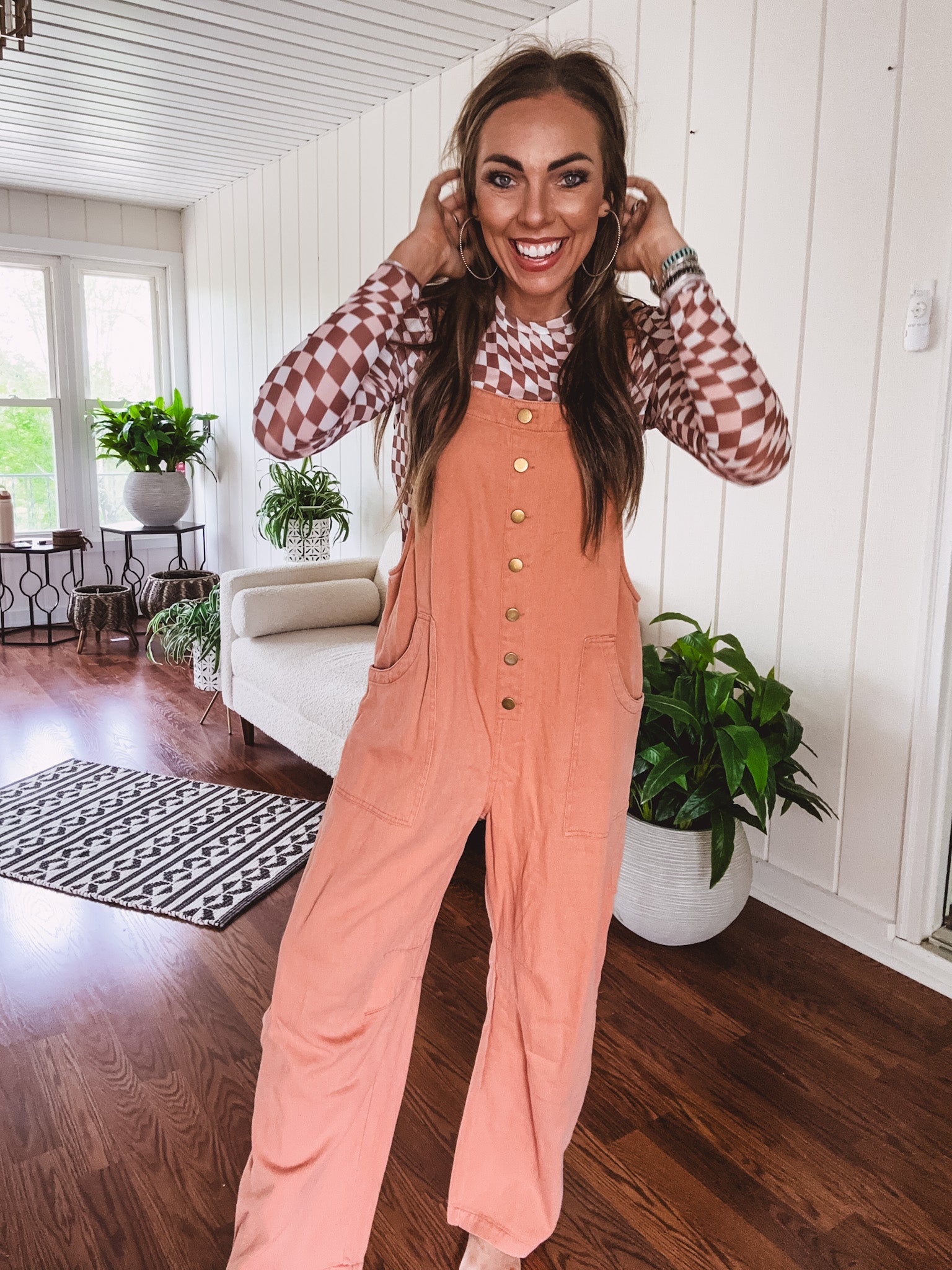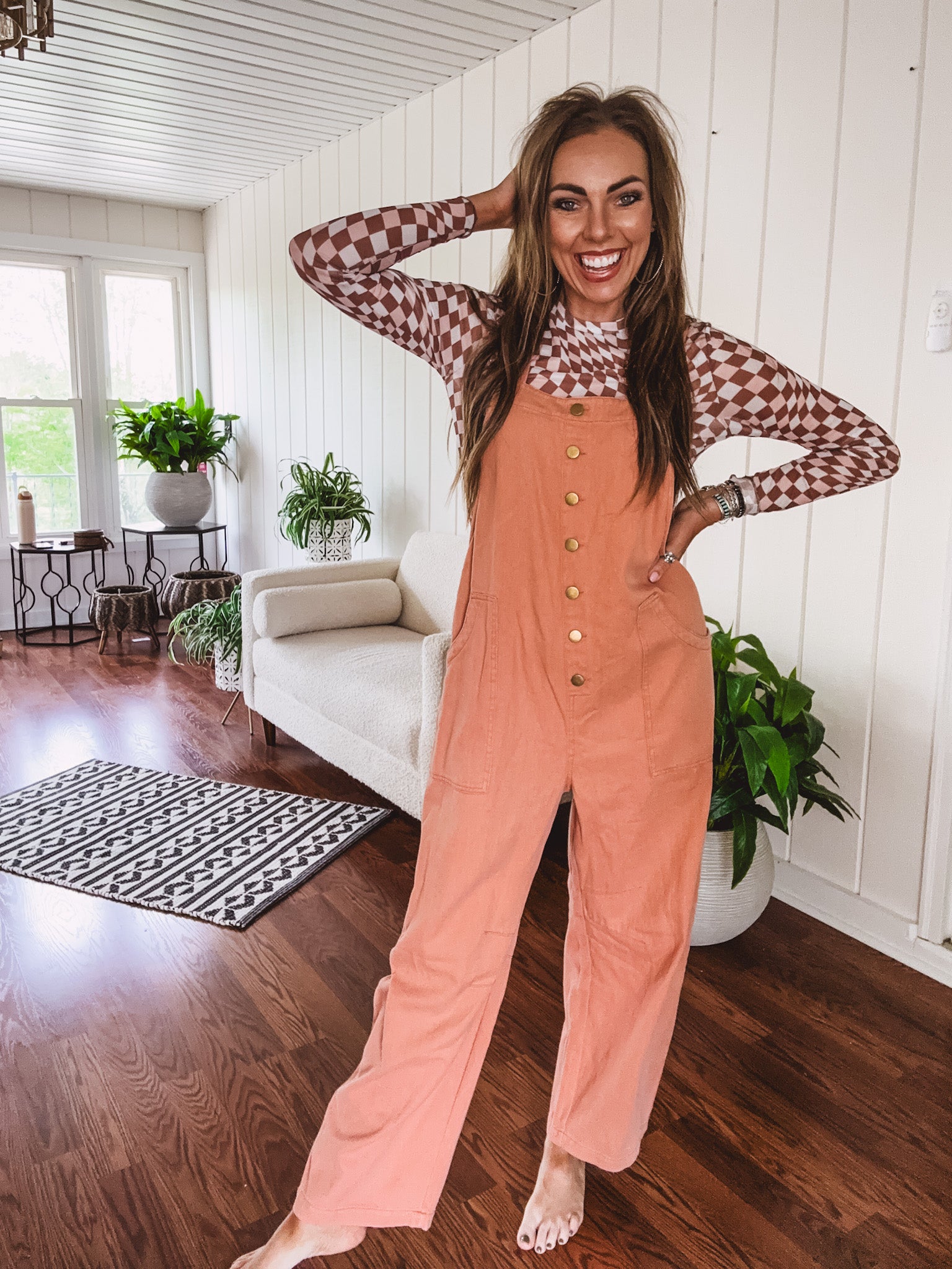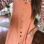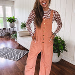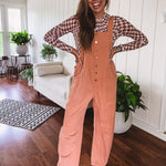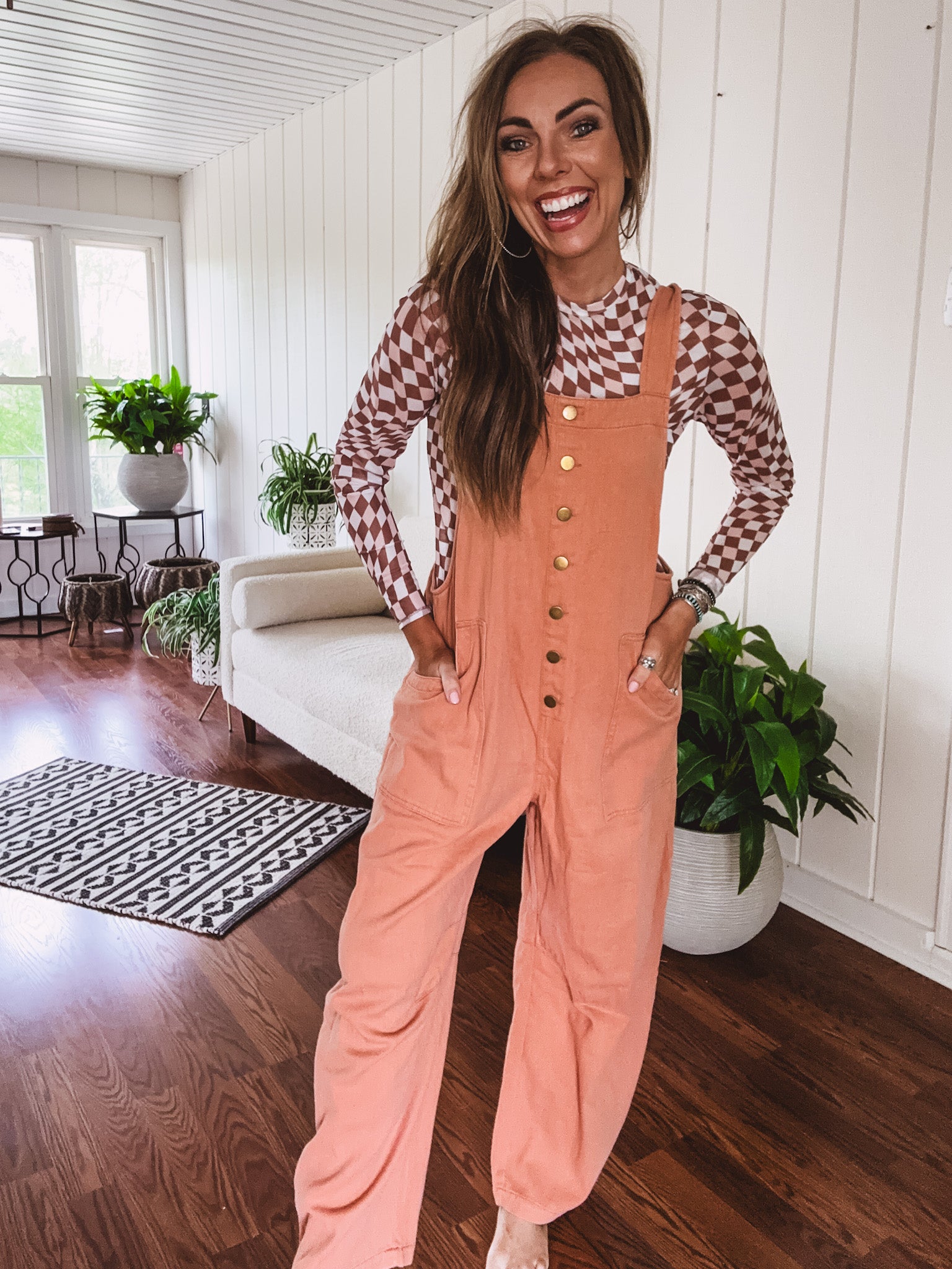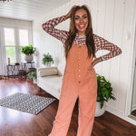 A lightweight denim meant for spring and summer fun in the sun in a gorgeous apricot color. The faux buttons down the front, barrel leg design and oversized side pockets as well as the button back straps make this a unique and trendy twist on a classic overall jumpsuit. Pair it with a tank, tee or sheer mesh and step out in style!