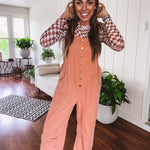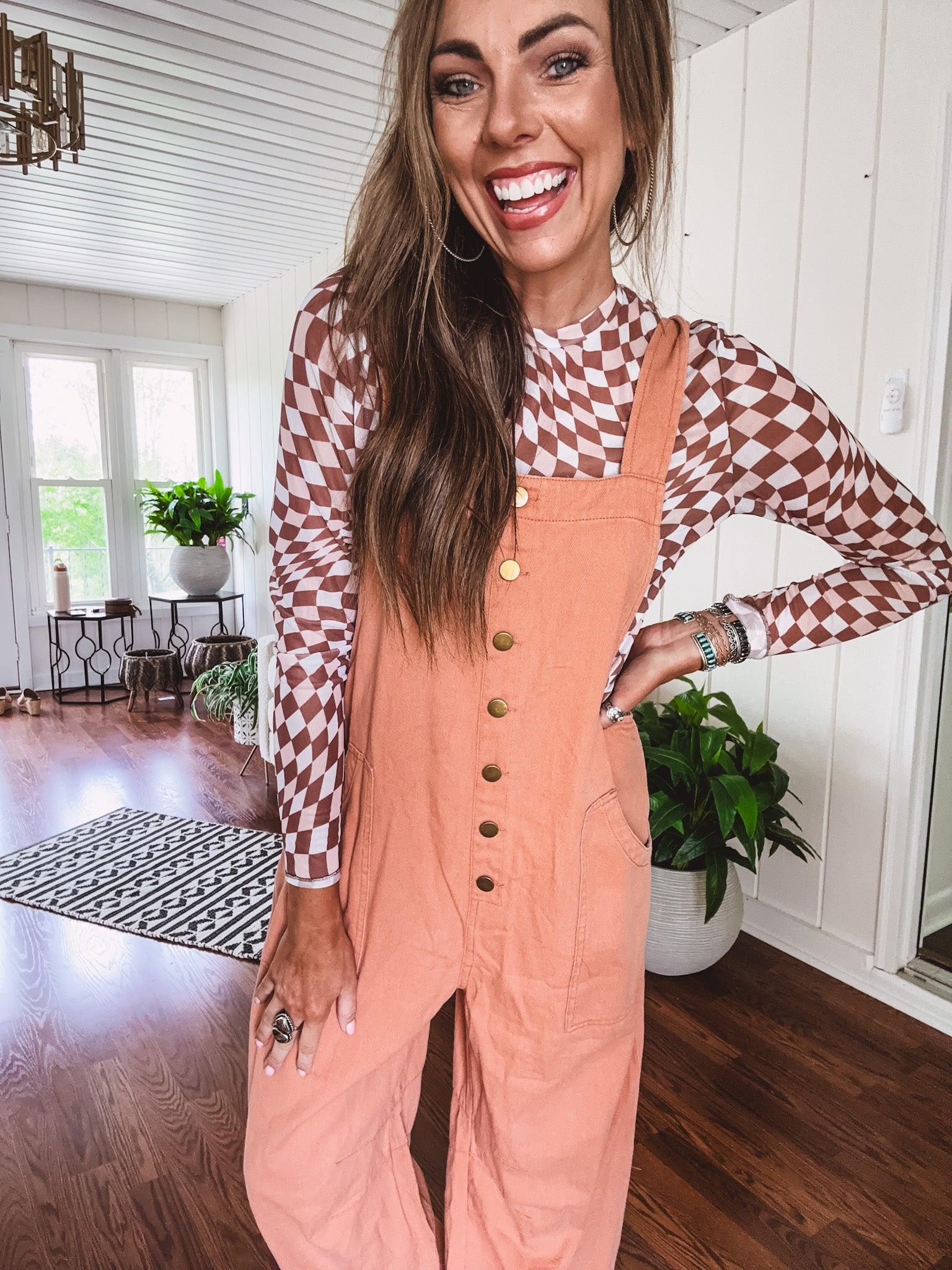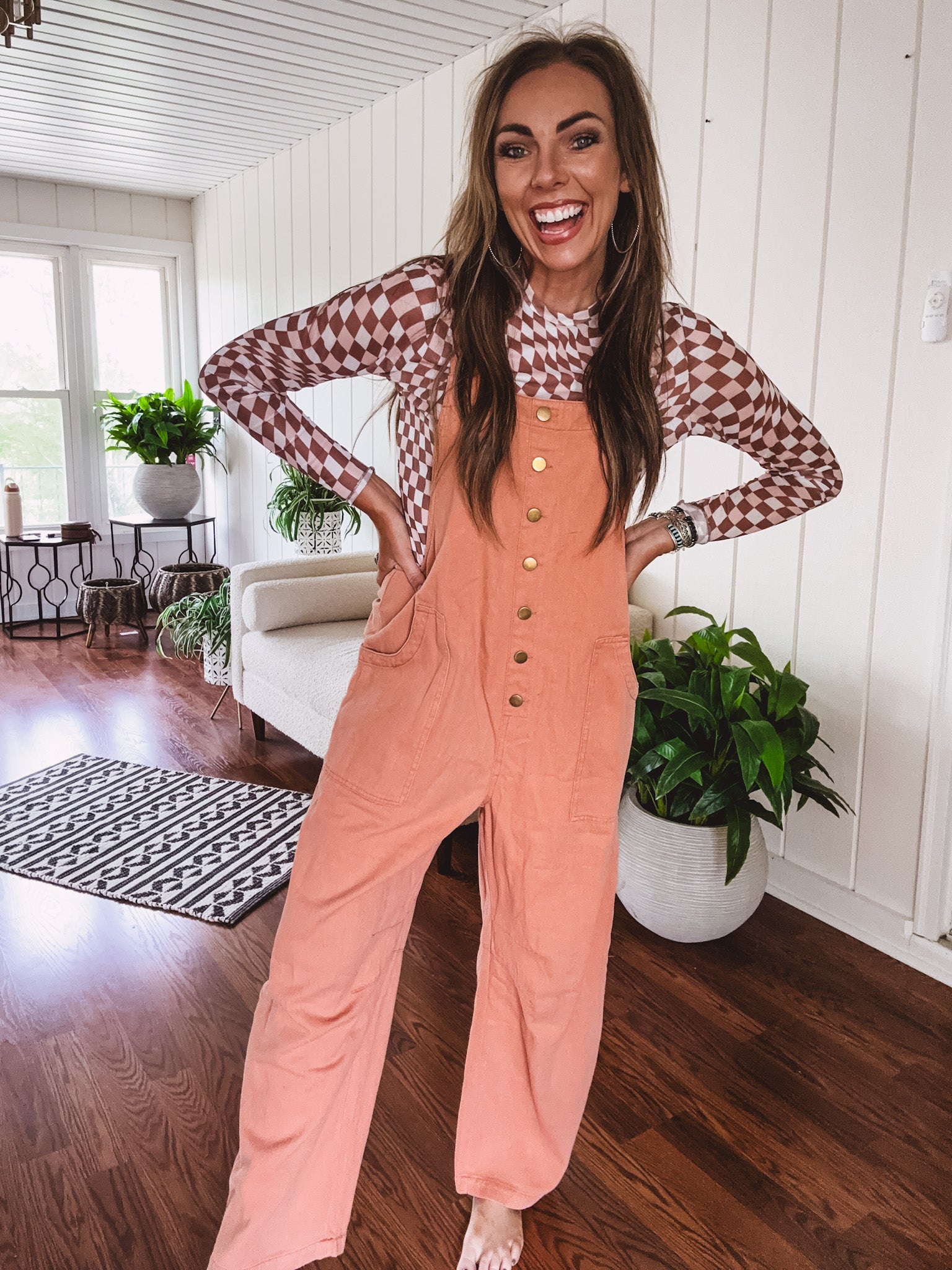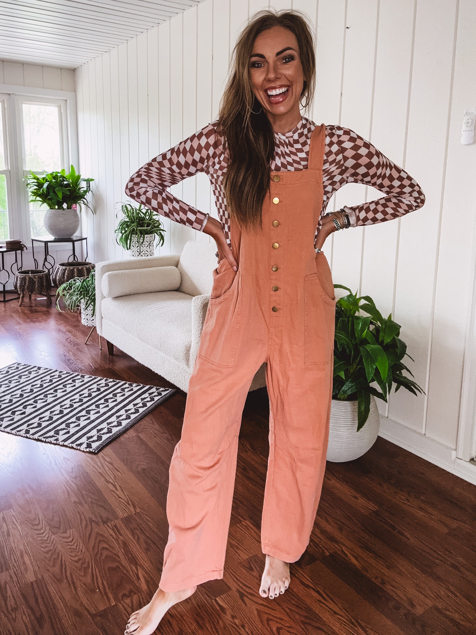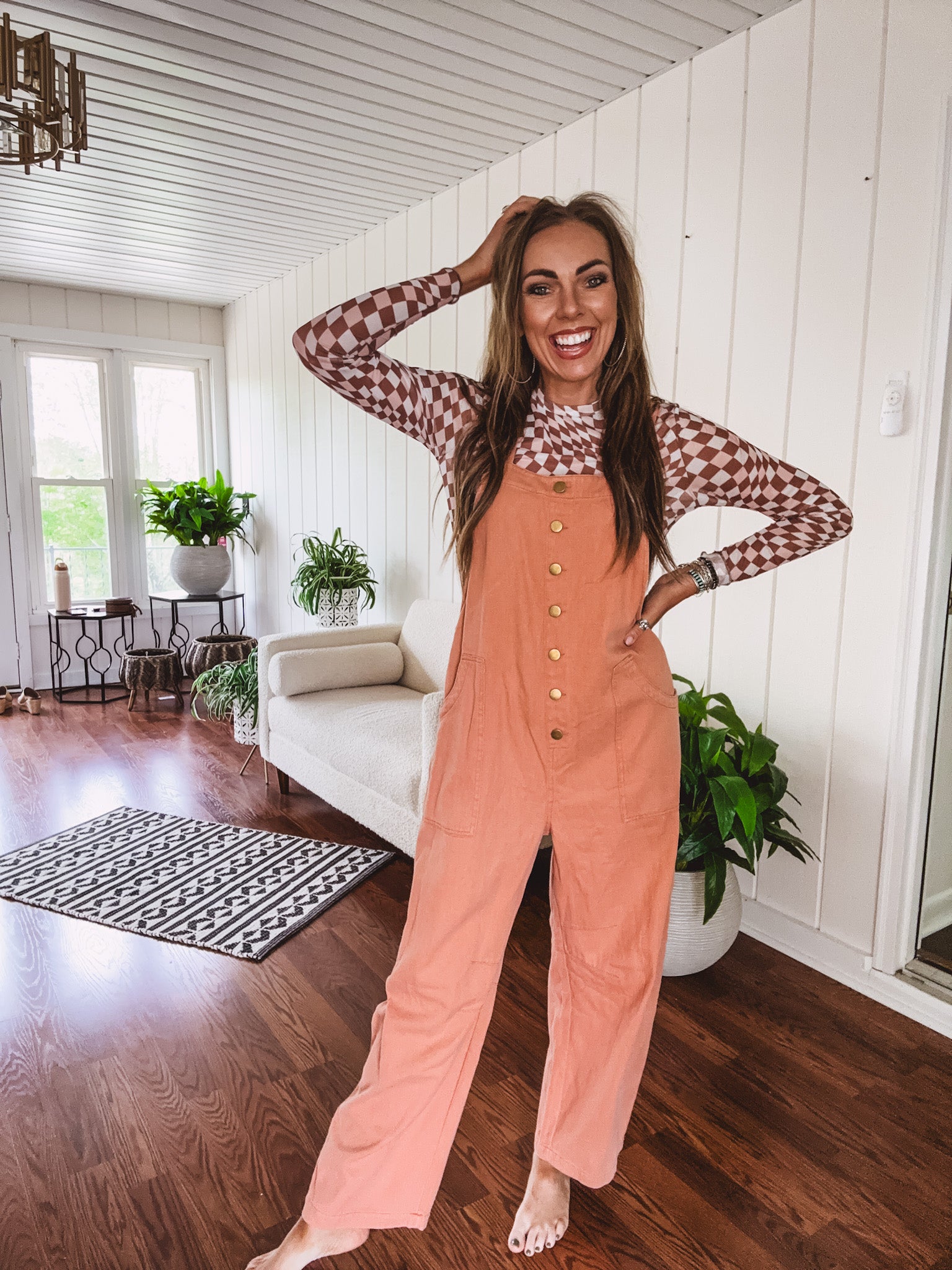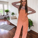 A lightweight denim meant for spring and summer fun in the sun in a gorgeous apricot color. The faux buttons down the front, barrel leg design and oversized side pockets as well as the button back straps make this a unique and trendy twist on a classic overall jumpsuit. Pair it with a tank, tee or sheer mesh and step out in style!