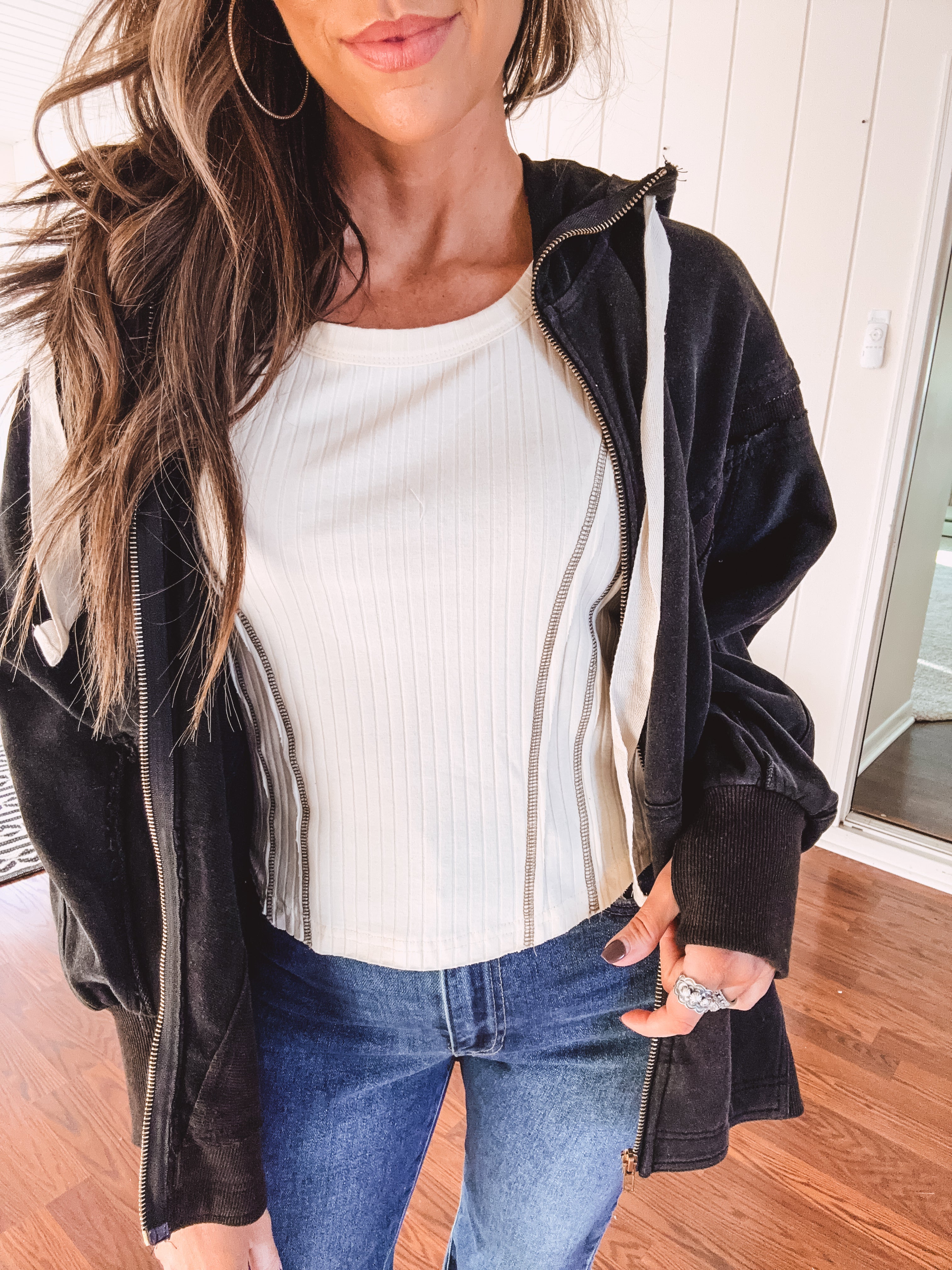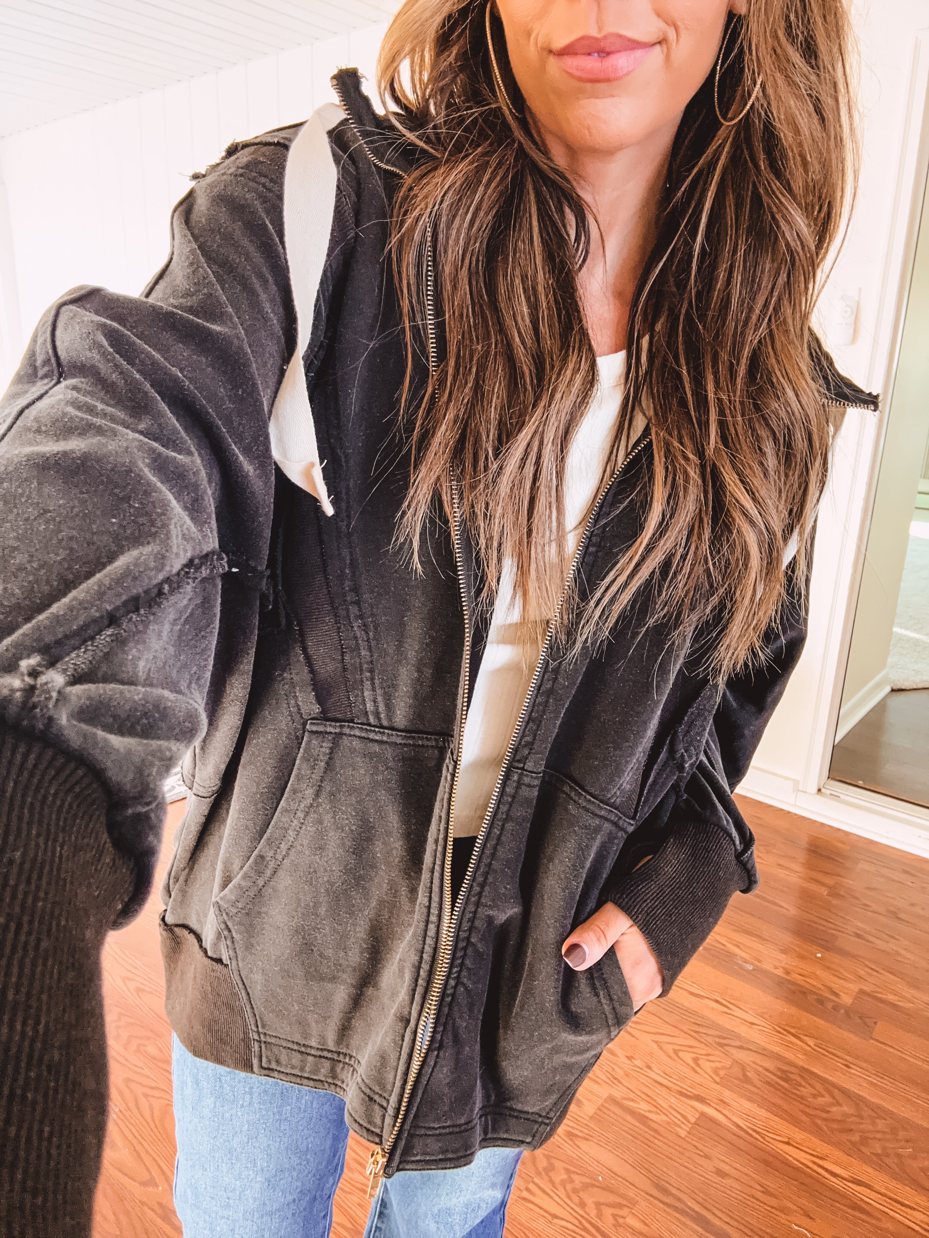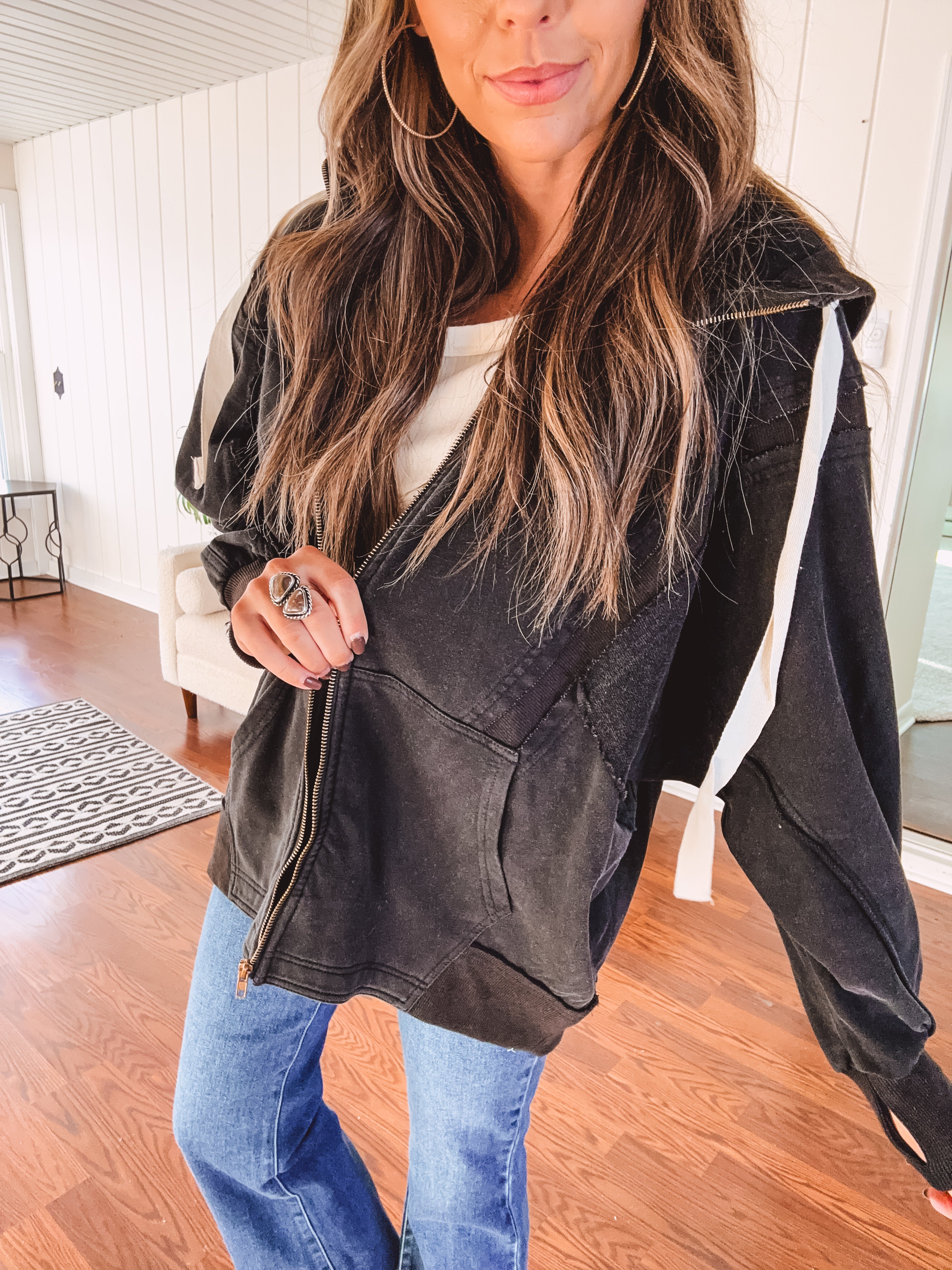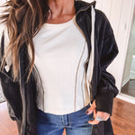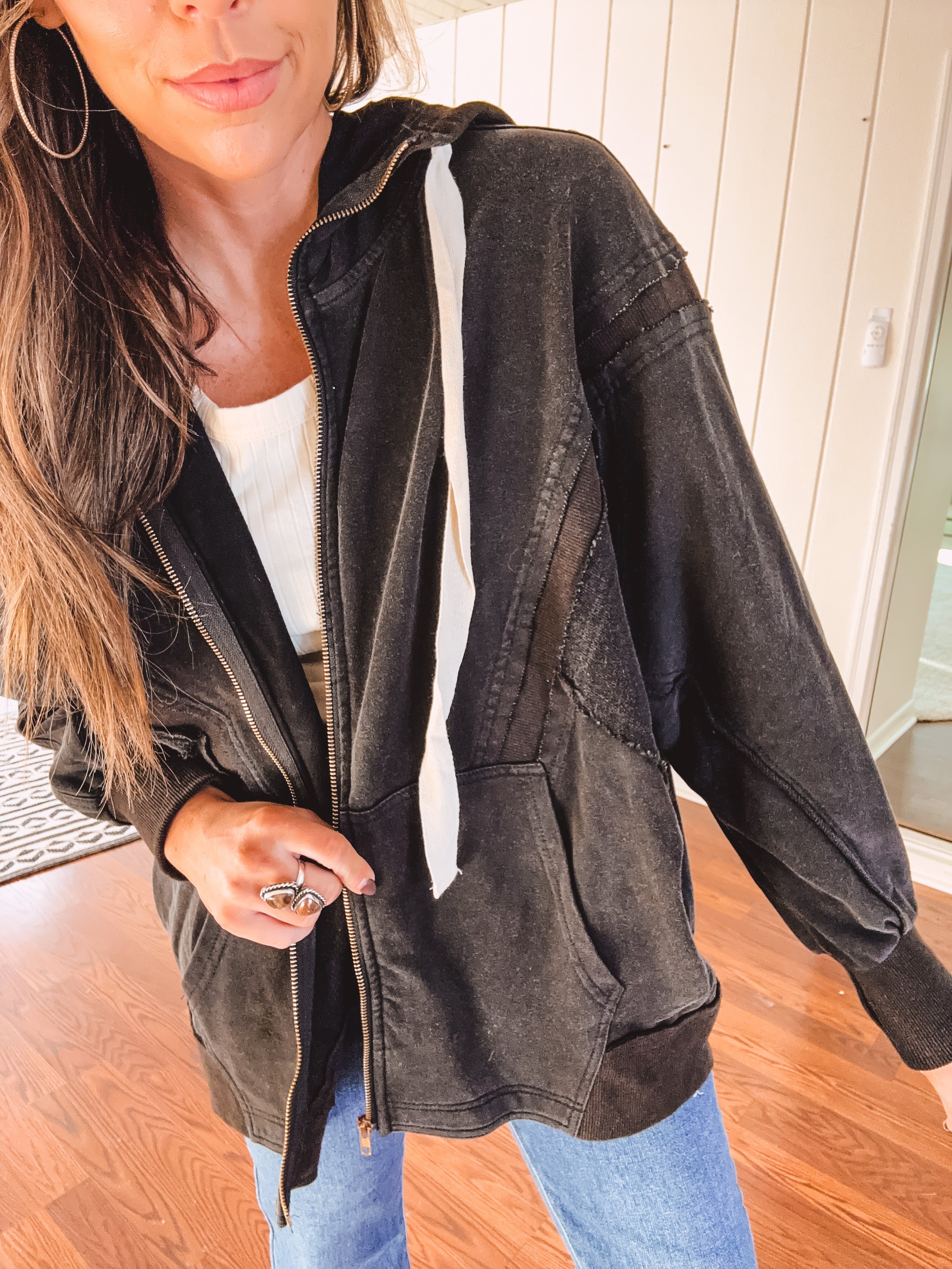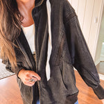 So comfy and so edgy! Dress this Washed Black Zip Up Hooded Jacket up or down whether you're pairing it with denim jeans or shorts or your favorite terry pants or joggers. You'll be ready for anything!