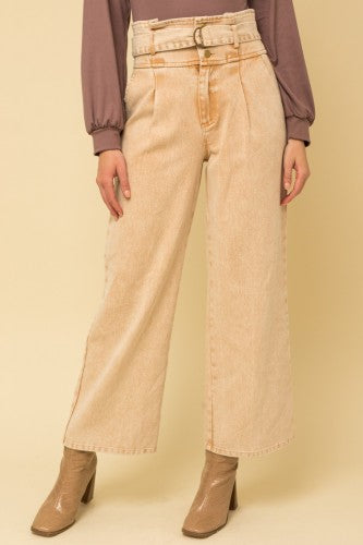 Washed Camel Paper Bag Waist Wide Leg Pant