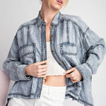 Experience a modern twist on the timeless chambray denim jacket. This lightweight fabric is incredibly soft and showcases spacious front pockets, wooden buttons, a stylish dolman cut, and a back slit that adds a touch of sophistication to this piece. Whether paired with a tank or a graphic tee in the warmer months, styled as a top, or layered over your go-to long sleeve shirt in the colder seasons, this jacket will elevate any outfit.