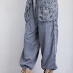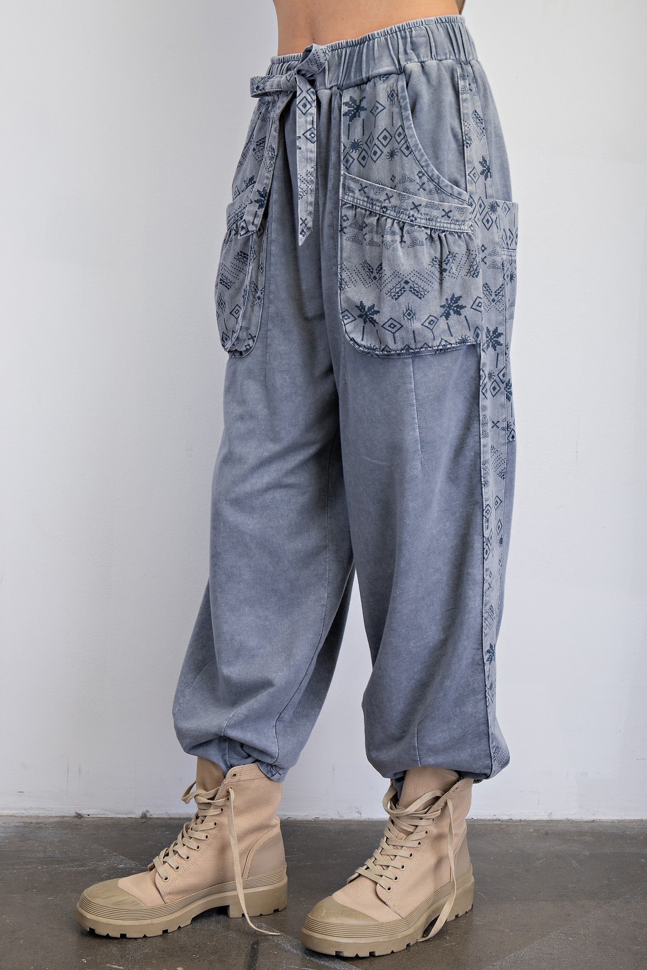 Washed Denim Ethnic Mix Print Mineral Wash Pant