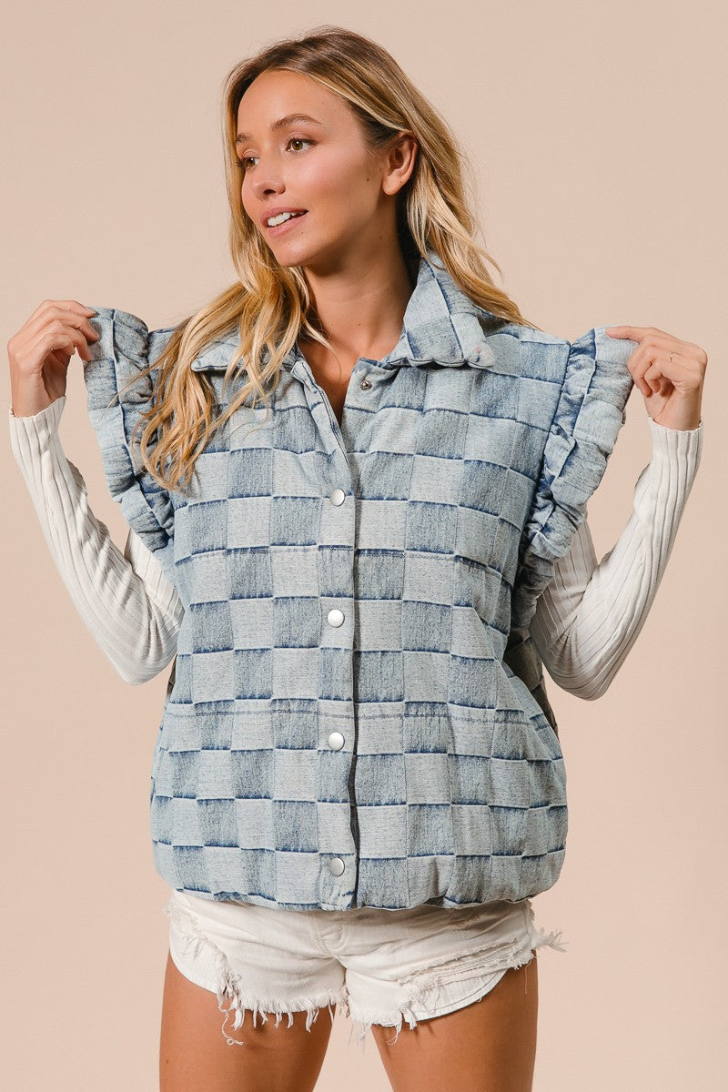 Washed Denim Gingham Plaid Vest with Flutter Sleeve
