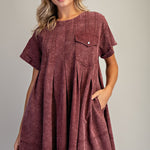 Washed Wine Denim Pleated Dress with Pocket
