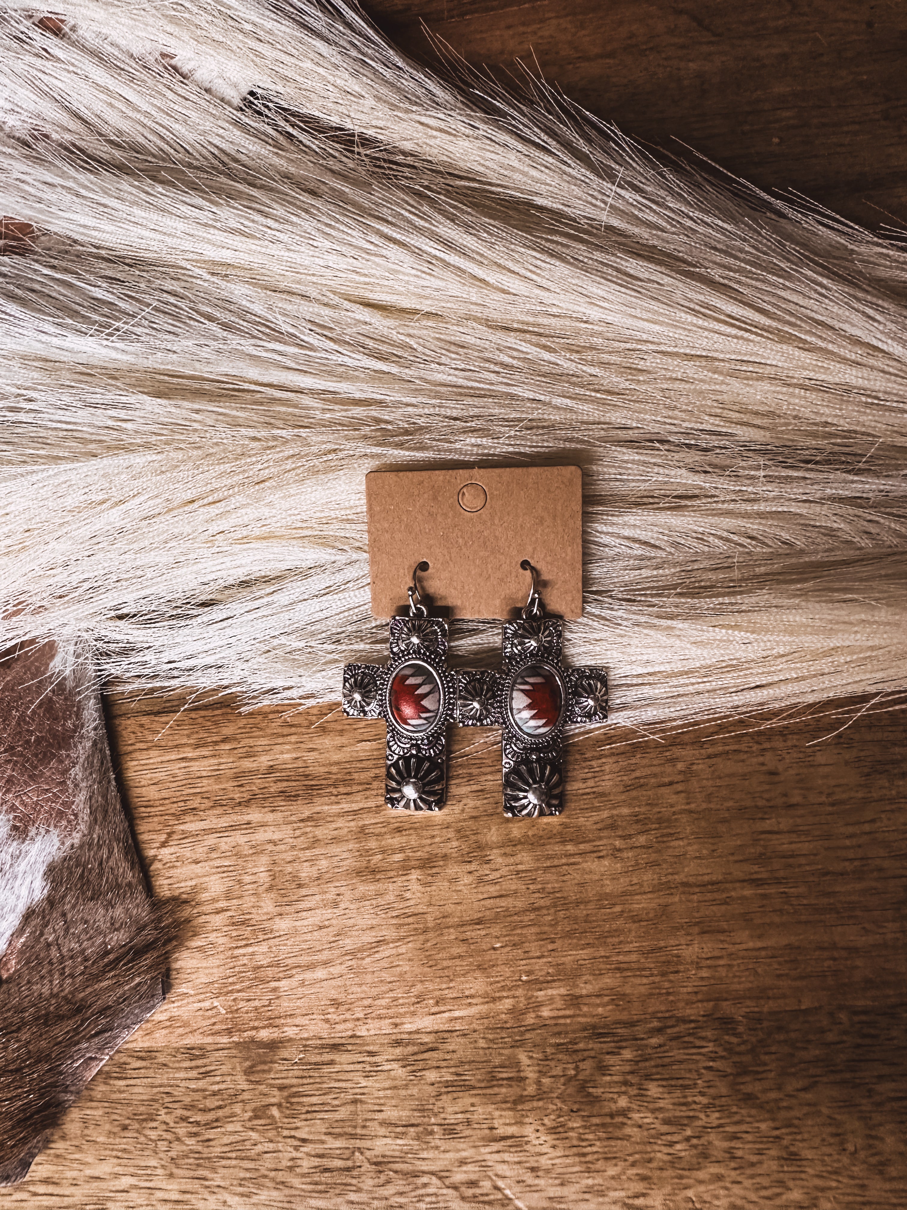 WESTERN CROSS EARRING WTIH AZTEC CENTER