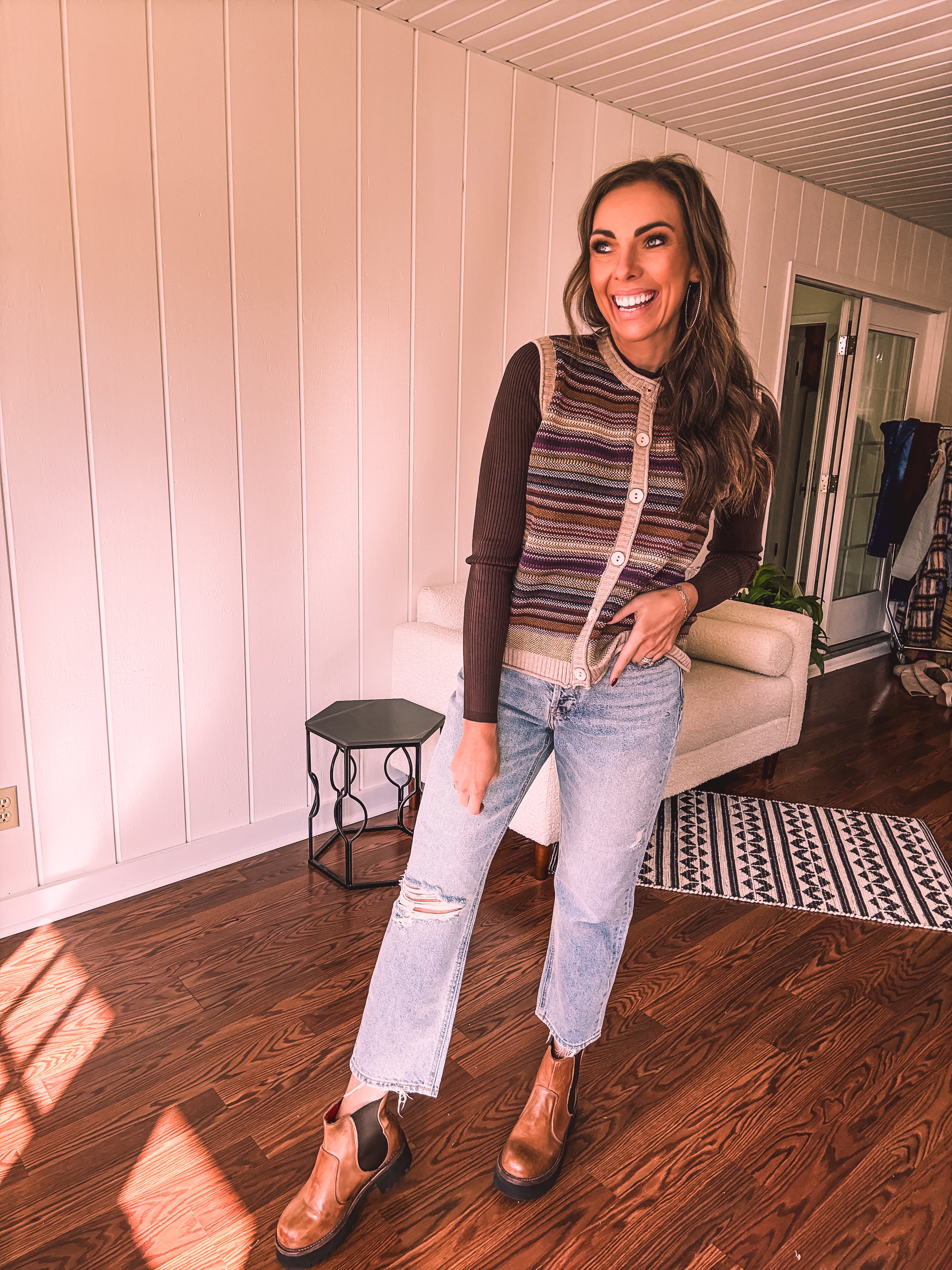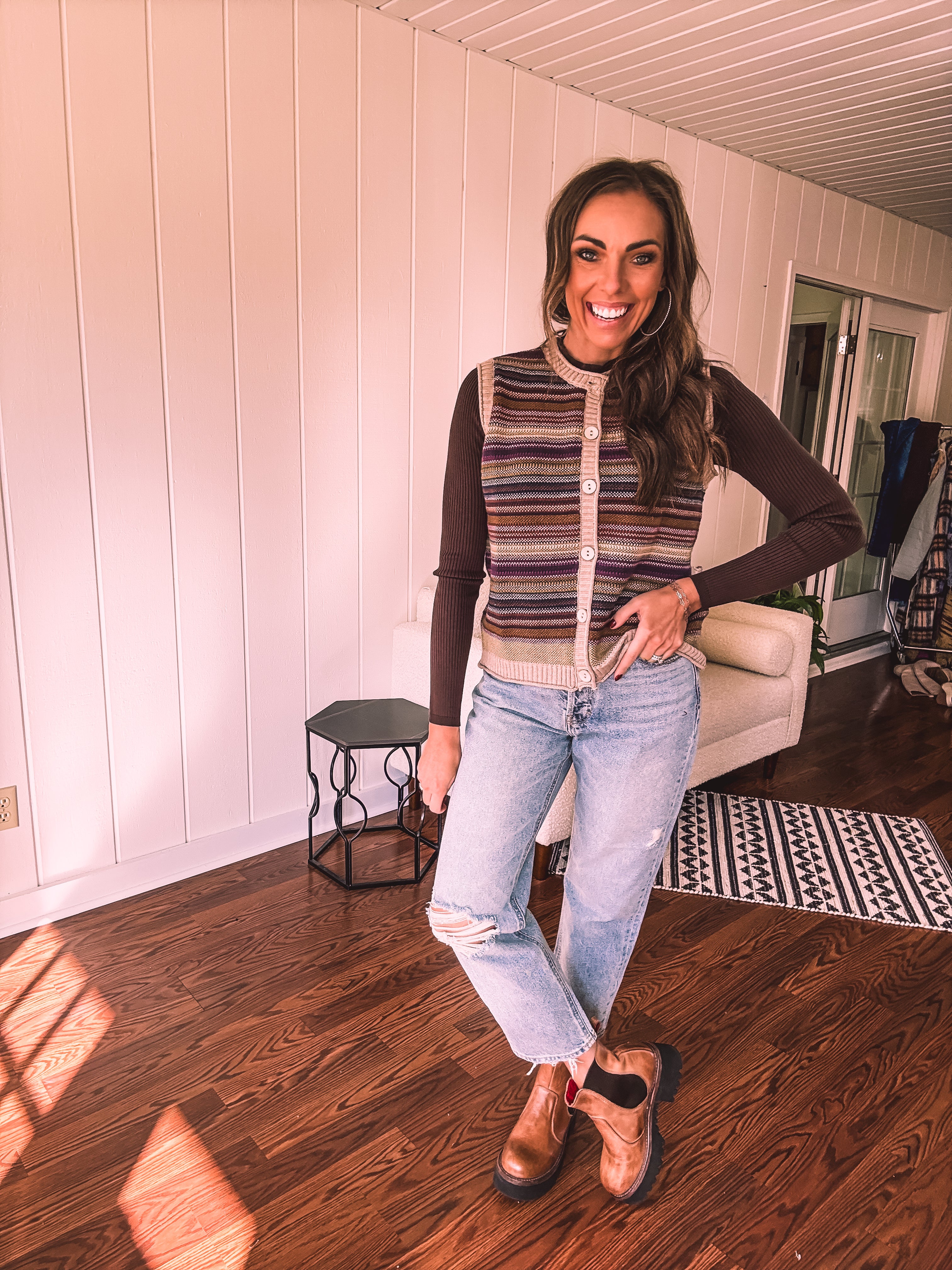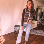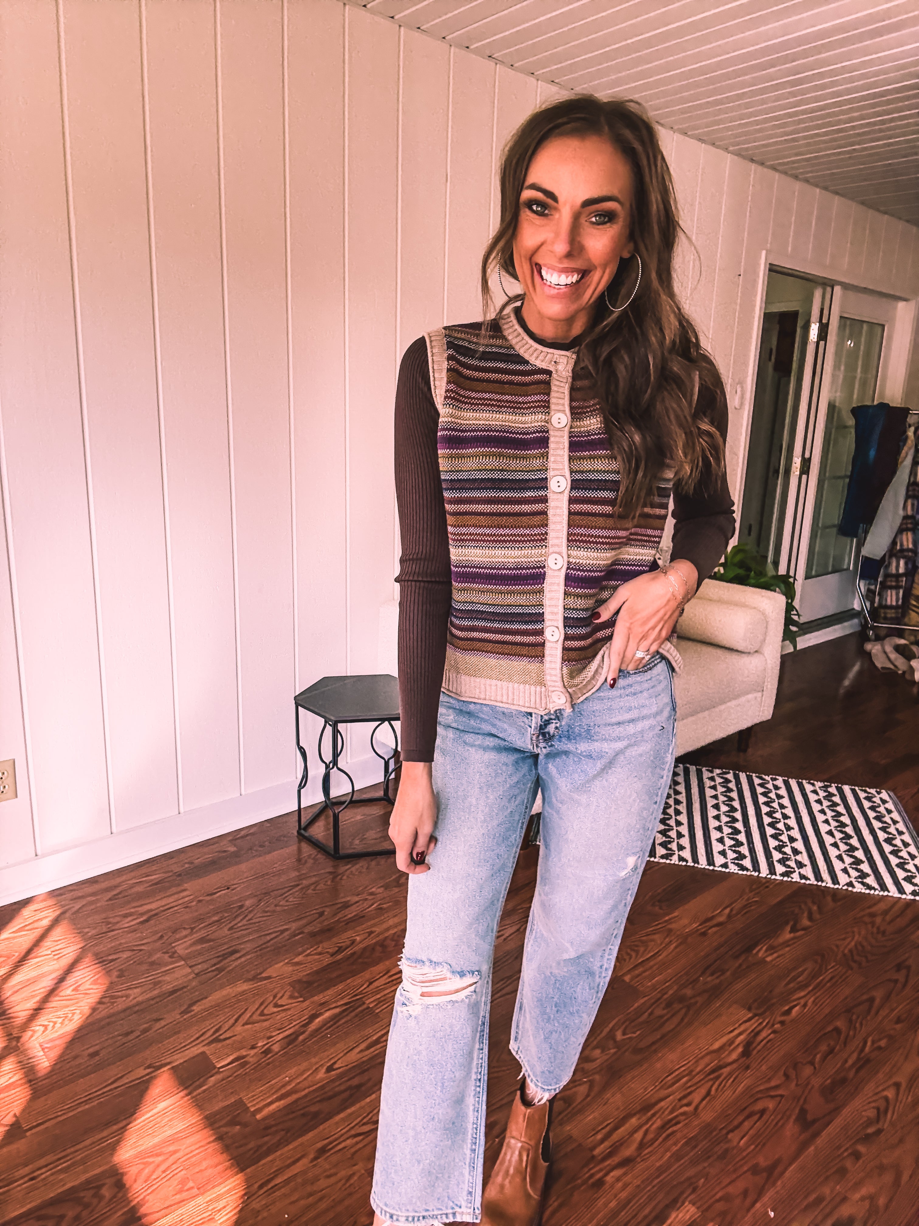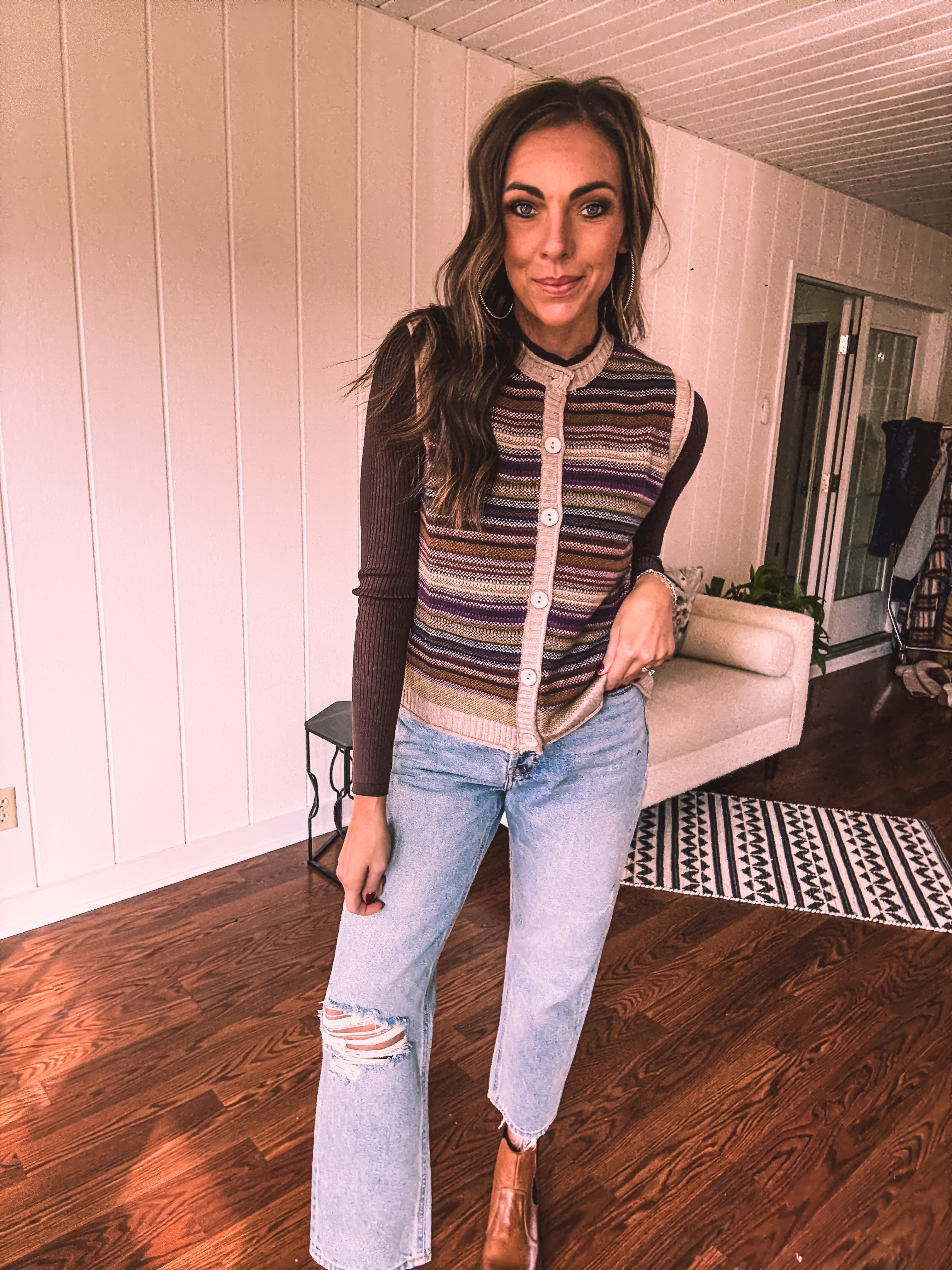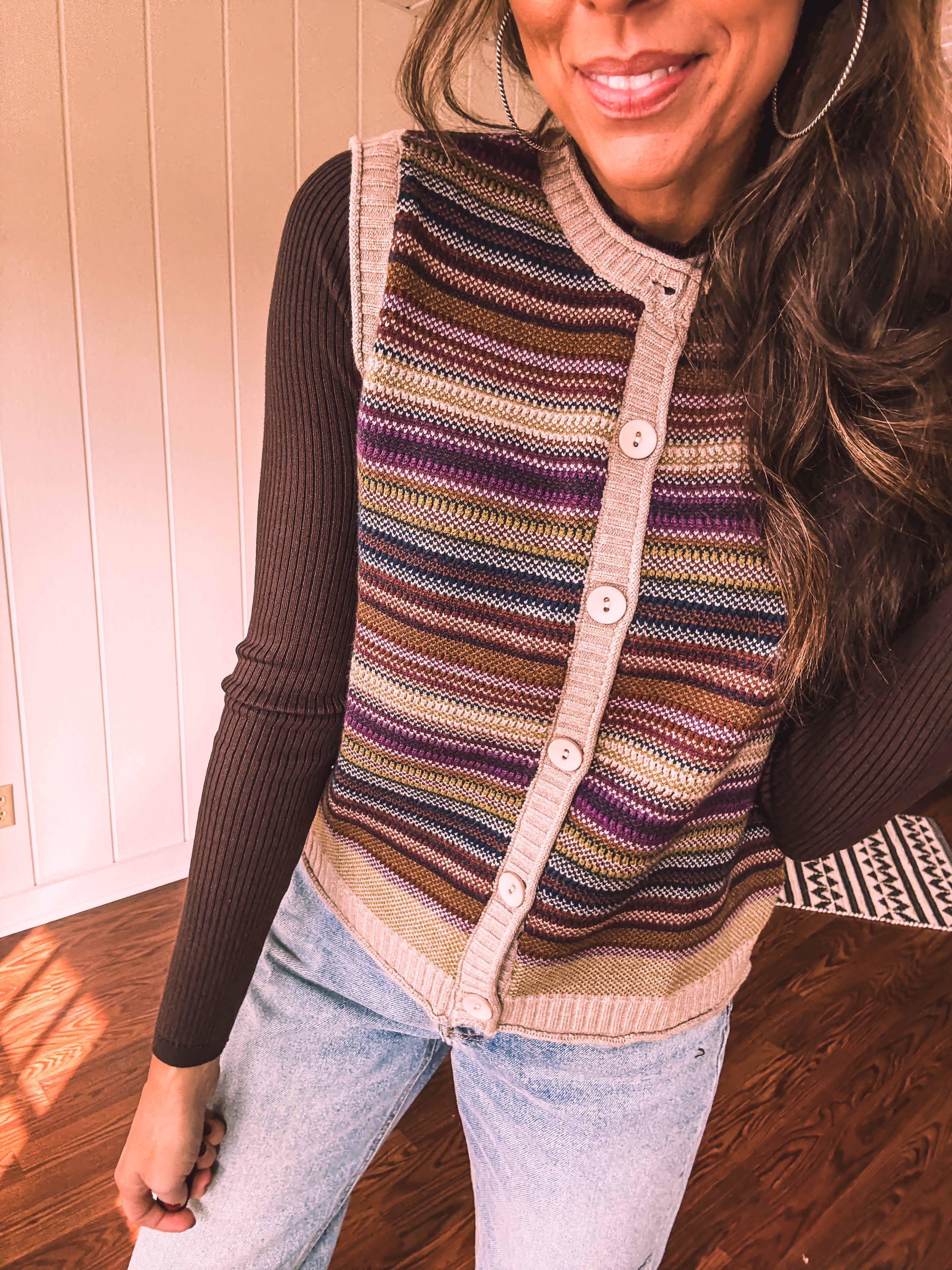 Layer up with this charming striped sweater vest that brings serious style to your fall wardrobe. Featuring a playful mix of plum, navy, spice, green, and taupe horizontal stripes, it's finished with coordinating trim and front buttons for easy styling. Throw it over a long-sleeved tee, turtleneck, or mesh top, pair with your go-to jeans, and you've got an effortlessly cool look that handles whatever the season throws your way.