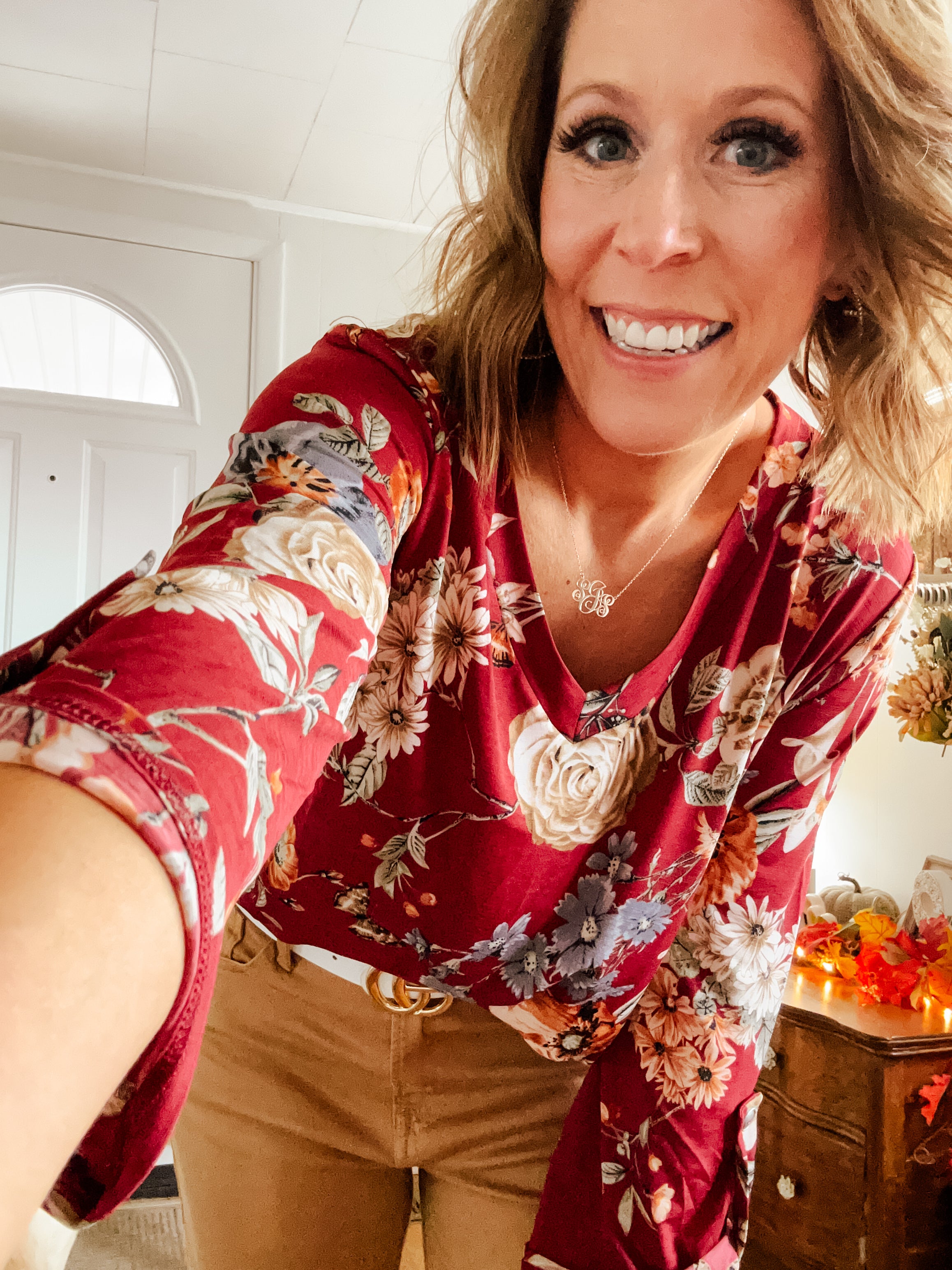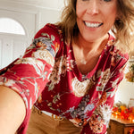 Indulge in the luxurious feel of this wine-colored top made from lightweight, airy fabric. The stunning floral and butterfly design in muted shades of blue, taupe, and rust adds a touch of elegance. With its discreet v-neck, roll-up sleeves, and flowy hemline, this top is sure to flatter any figure. The non-clinging fabric allows for comfortable movement and pairs perfectly with leggings or your favorite denim for a one-of-a-kind style.