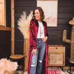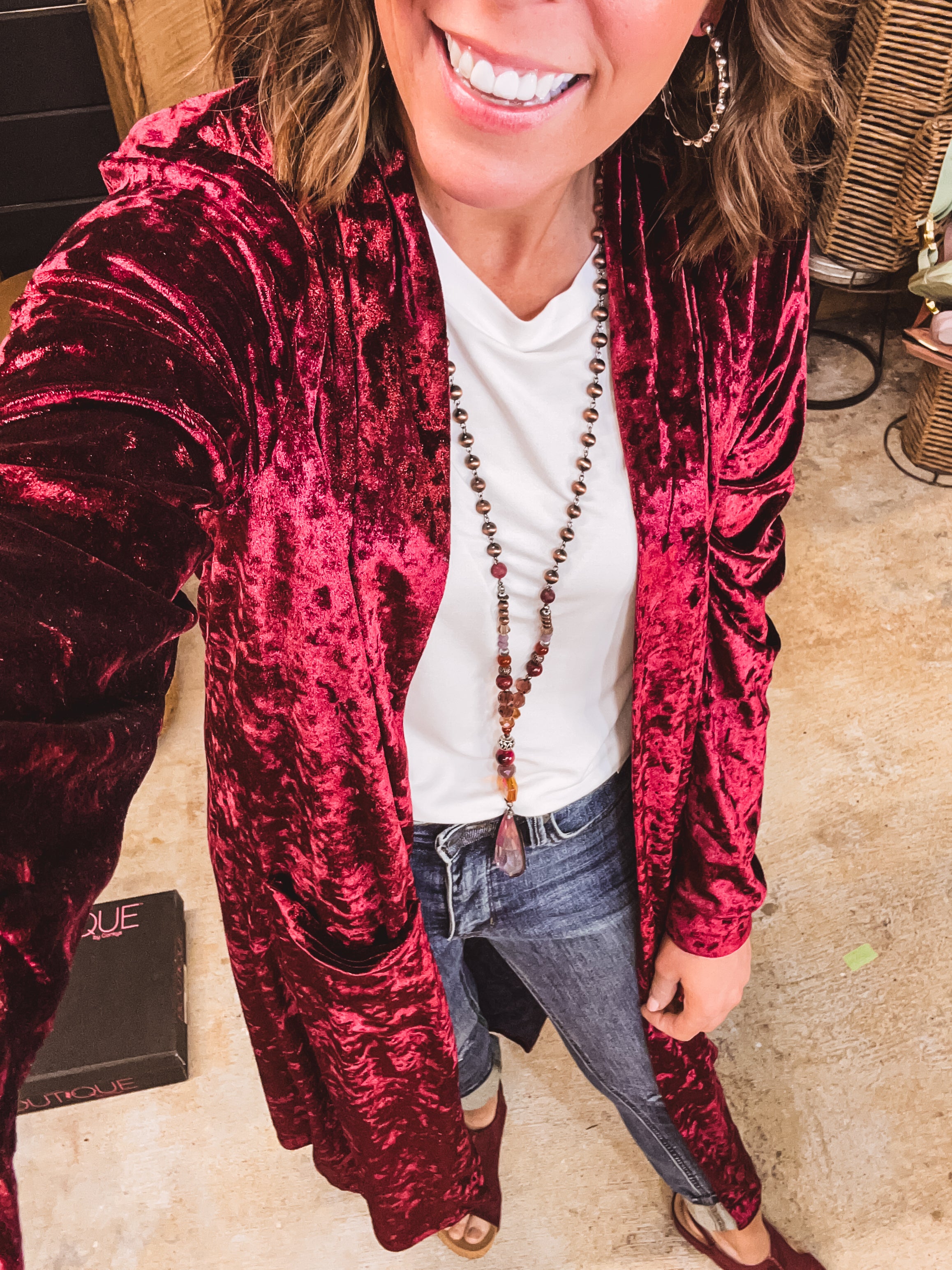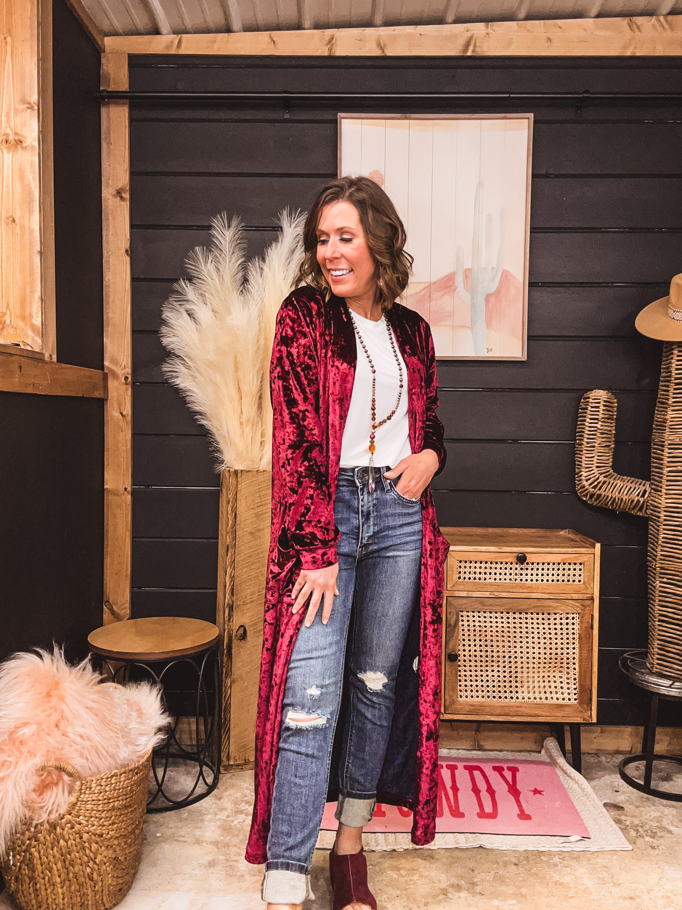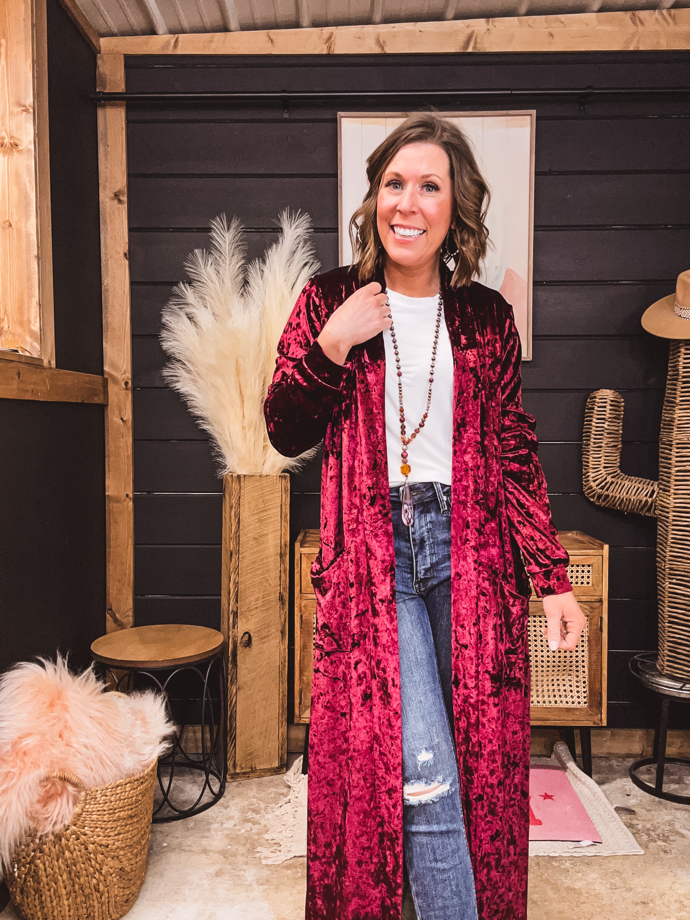 Infuse your favorite outfits with a touch of mystery and romance with this duster cardigan in a luxurious wine velvet material. The rich color, side slits, and functional pockets add practicality while the intricate paisley lining elevates the sophistication and intrigue.