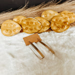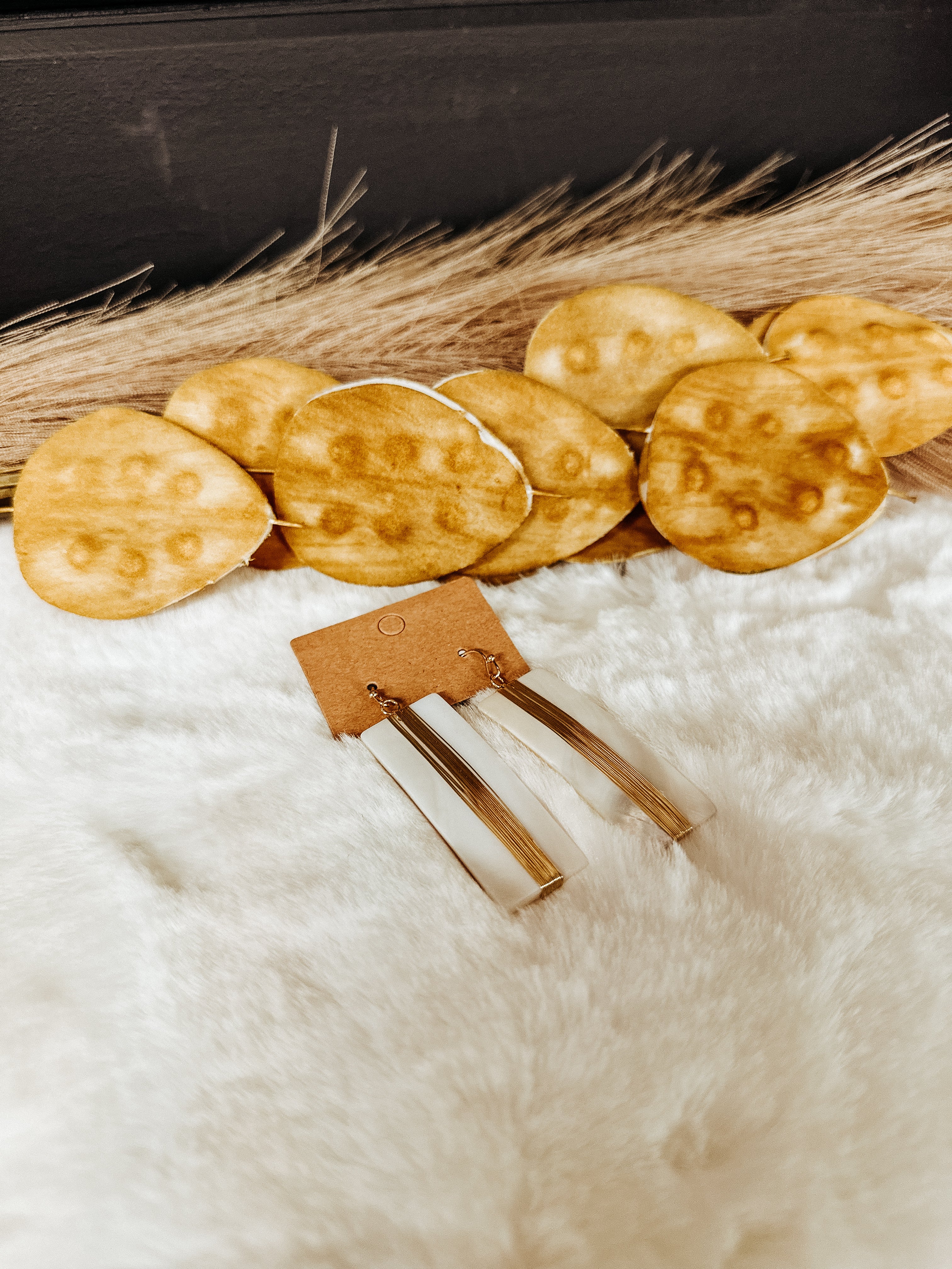 So unique and chic! These gorgeous earrings feature a rectangle of pearly, abalone-esque slabs wrapped in faux gold wire for a stunning effect! Add these trendy earrings to your 'fit for a touch of class!