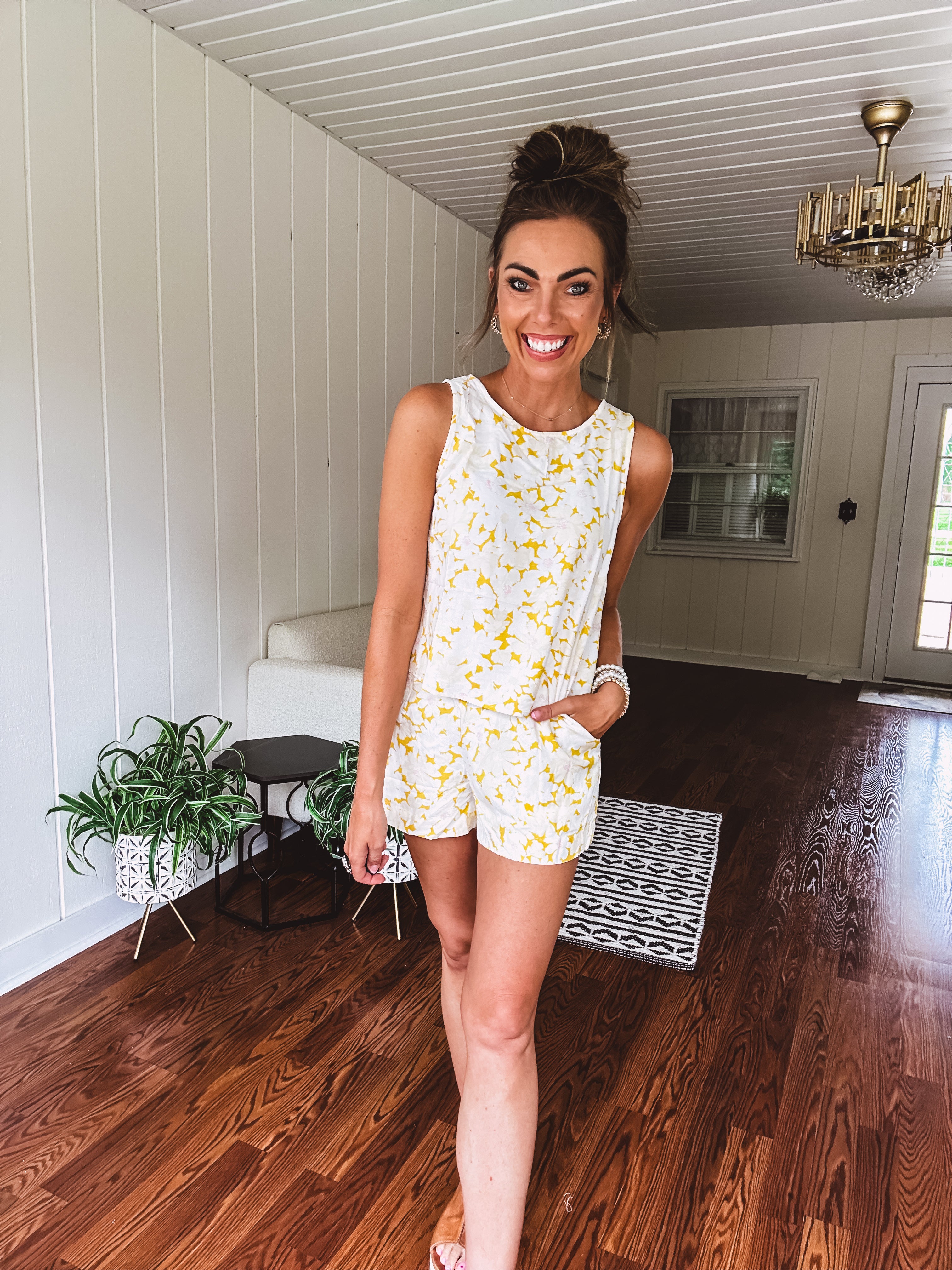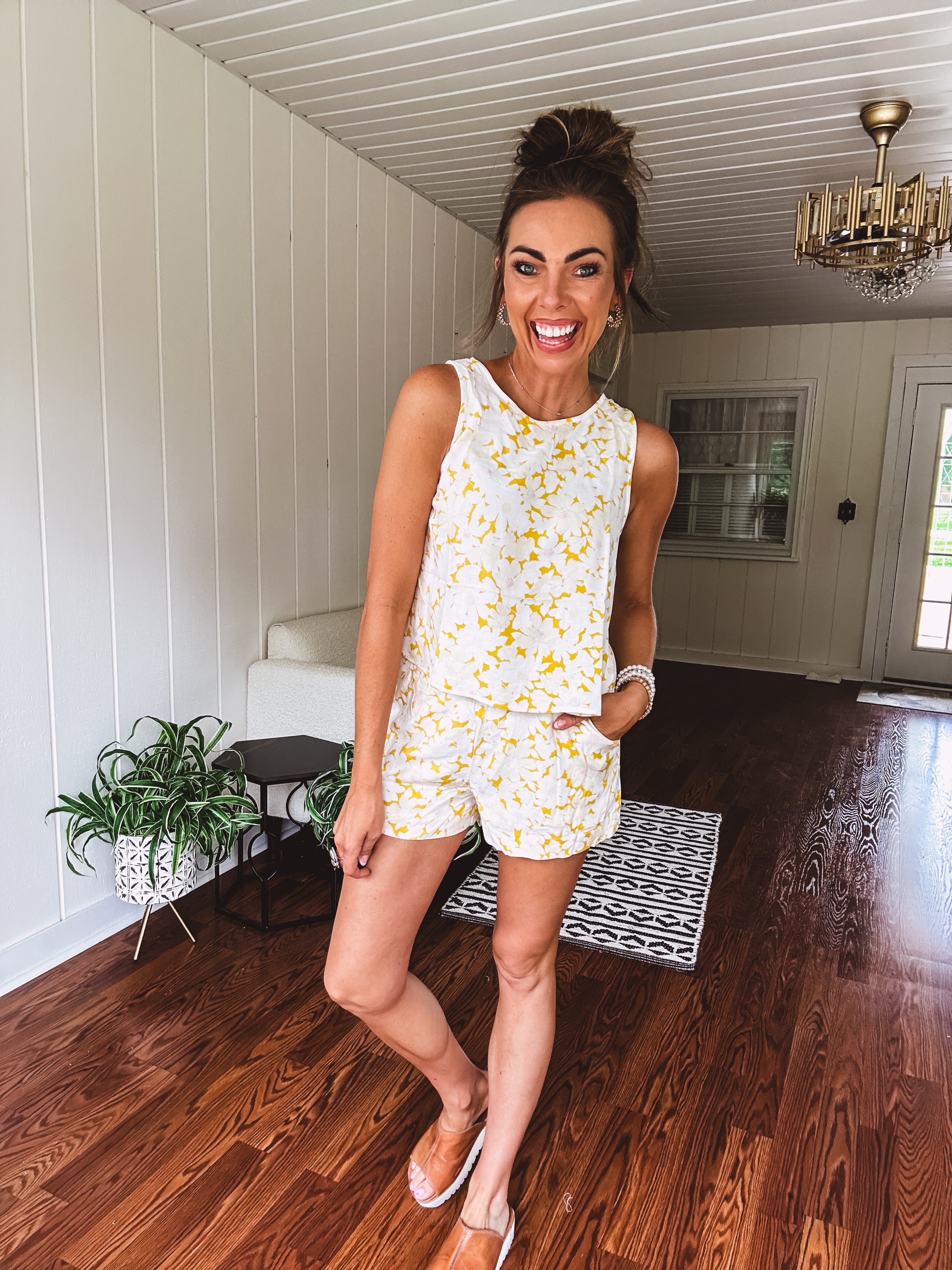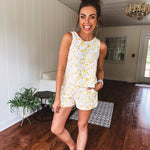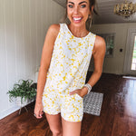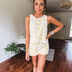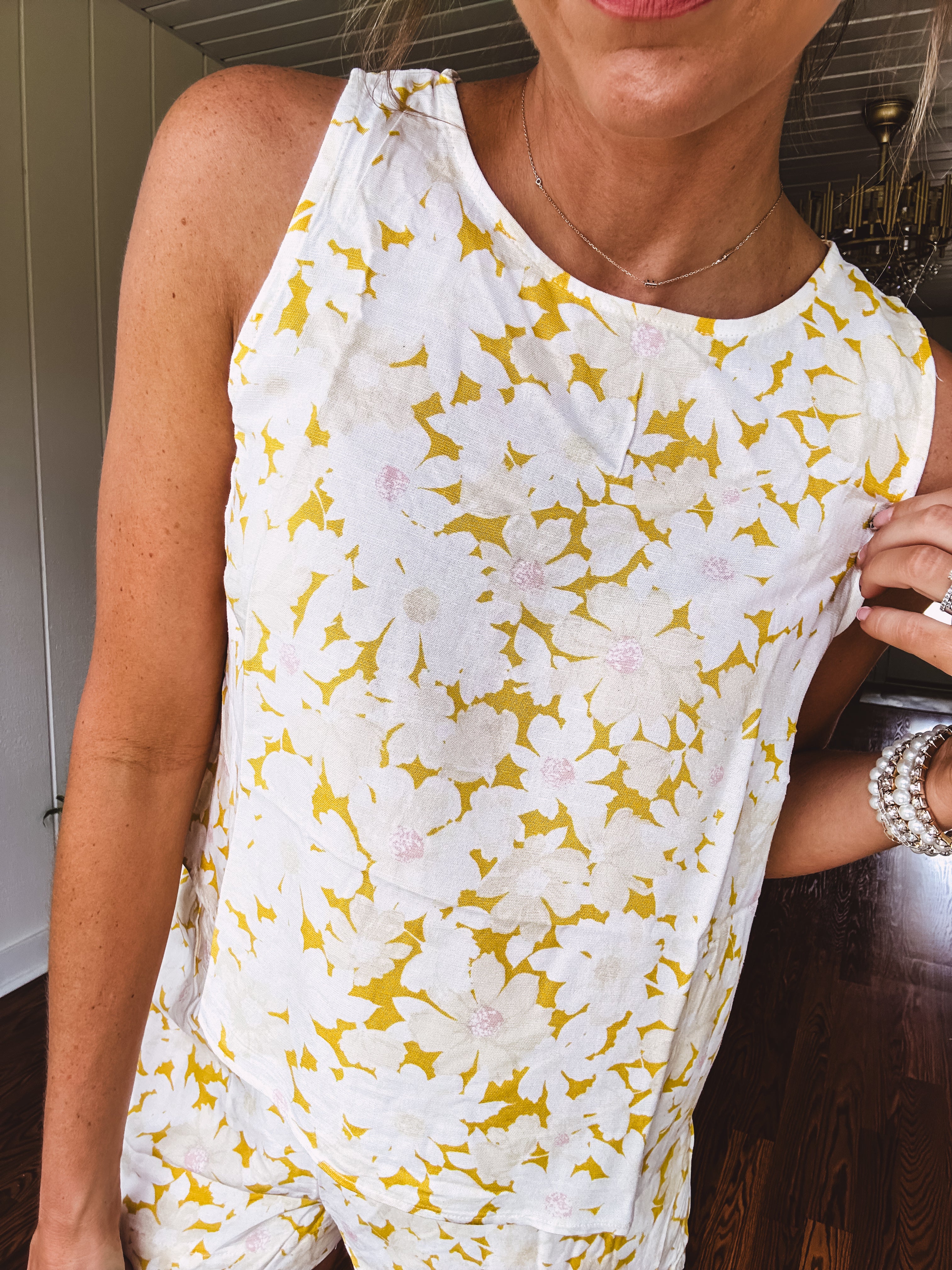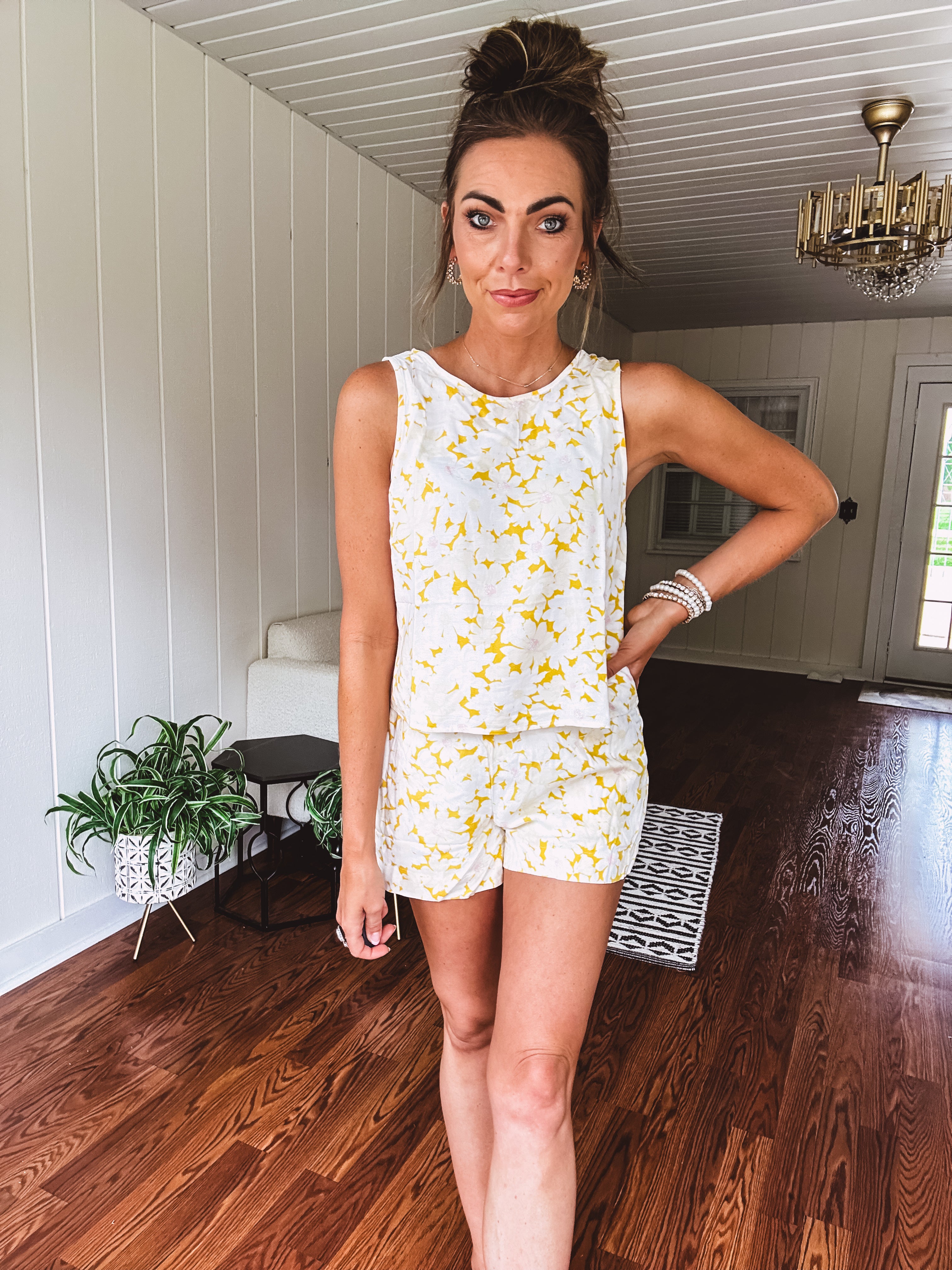 Celebrate sunny days with the charming Yellow Daisy Floral Set. Crafted from airy, linen-like fabric, it keeps you cool while showcasing a cheerful yellow and white daisy print highlighted by delicate pink centers. Fully lined shorts with handy pockets complete this playful outfit, perfect for soaking up every moment of summer in style and comfort.